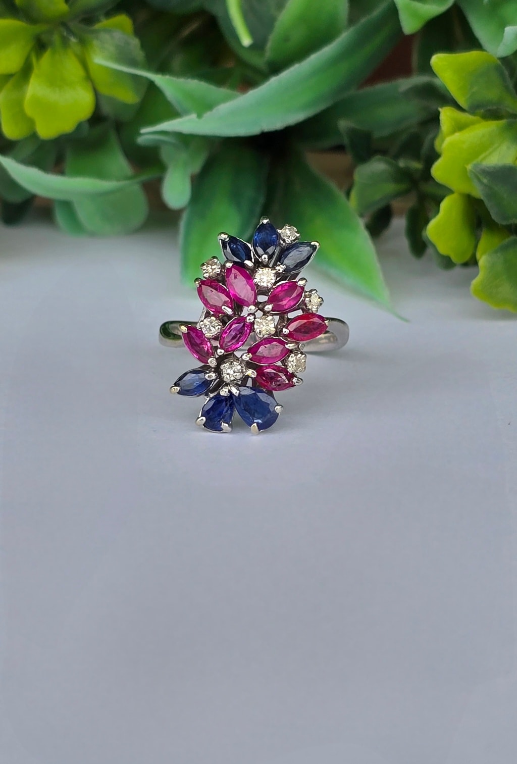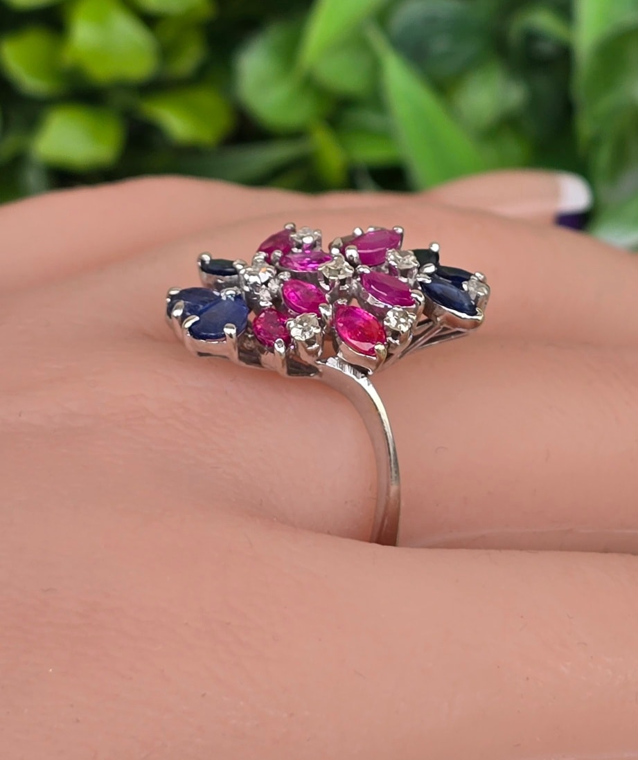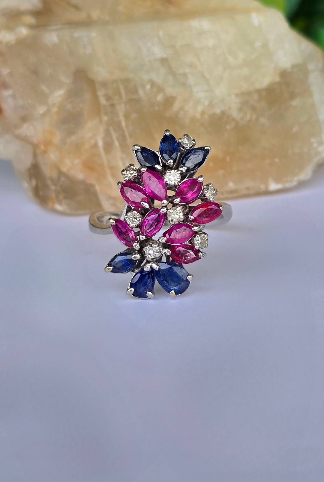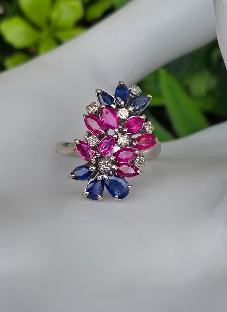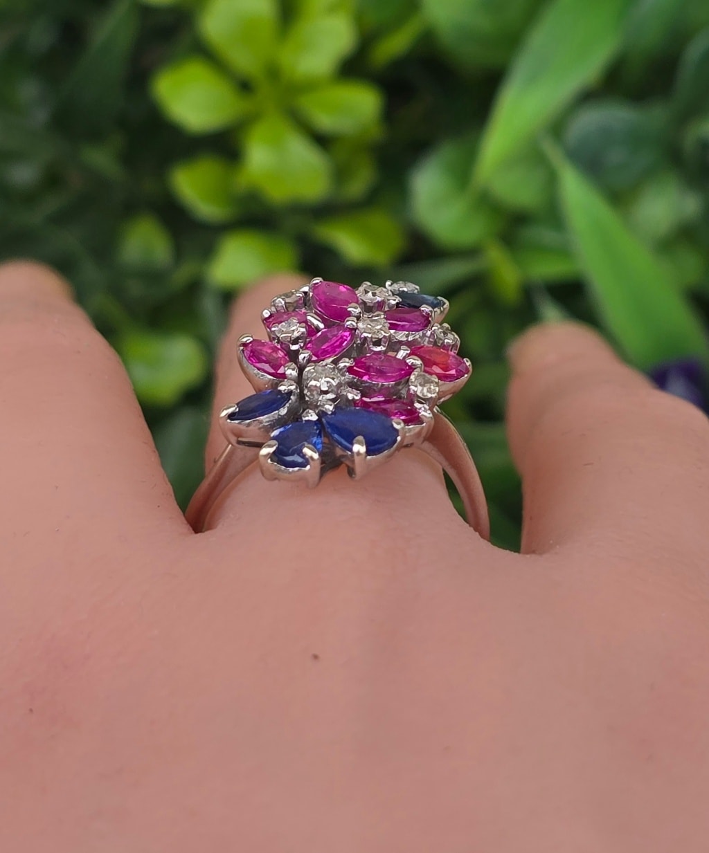 Inel vechi spectaculos, din aur de 18K, cu 8 rubine, 6 safire și 8 diamante naturale.
