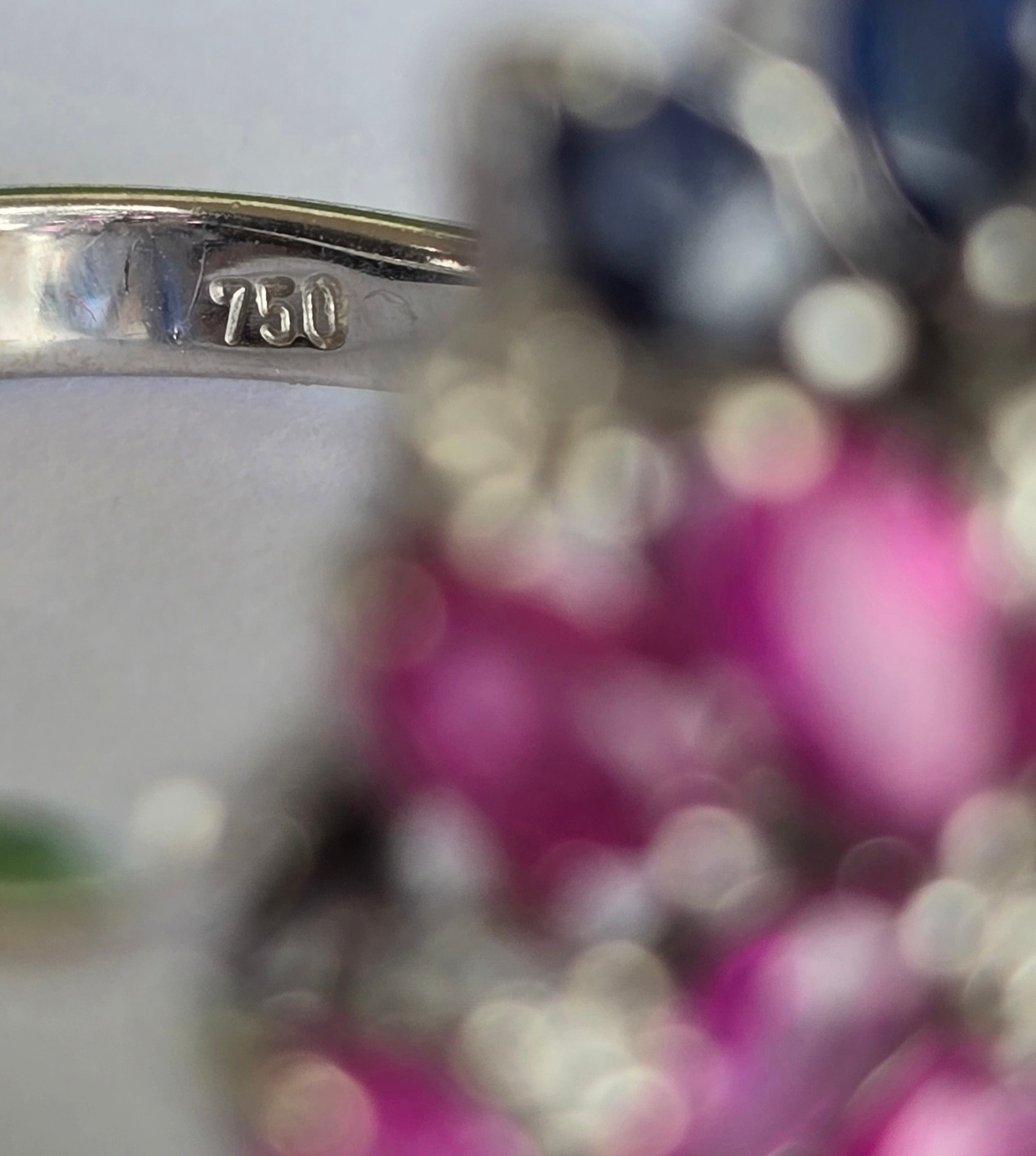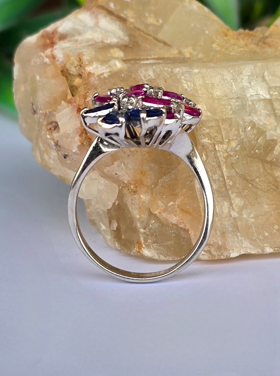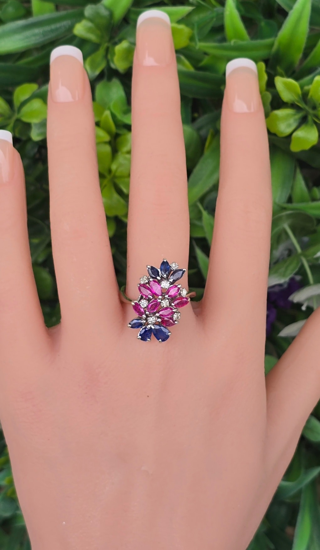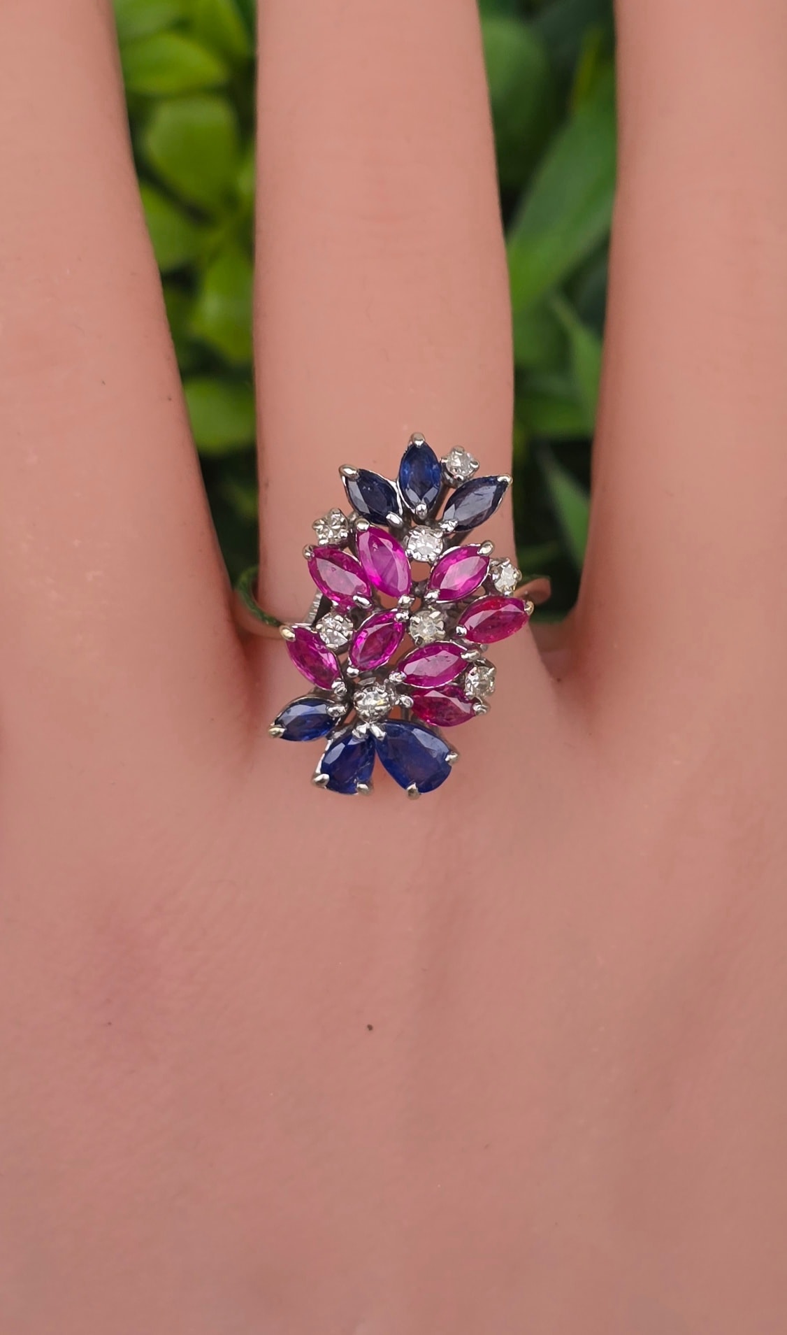 Inel vechi spectaculos, din aur de 18K, cu 8 rubine, 6 safire și 8 diamante naturale.