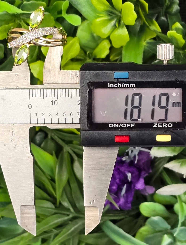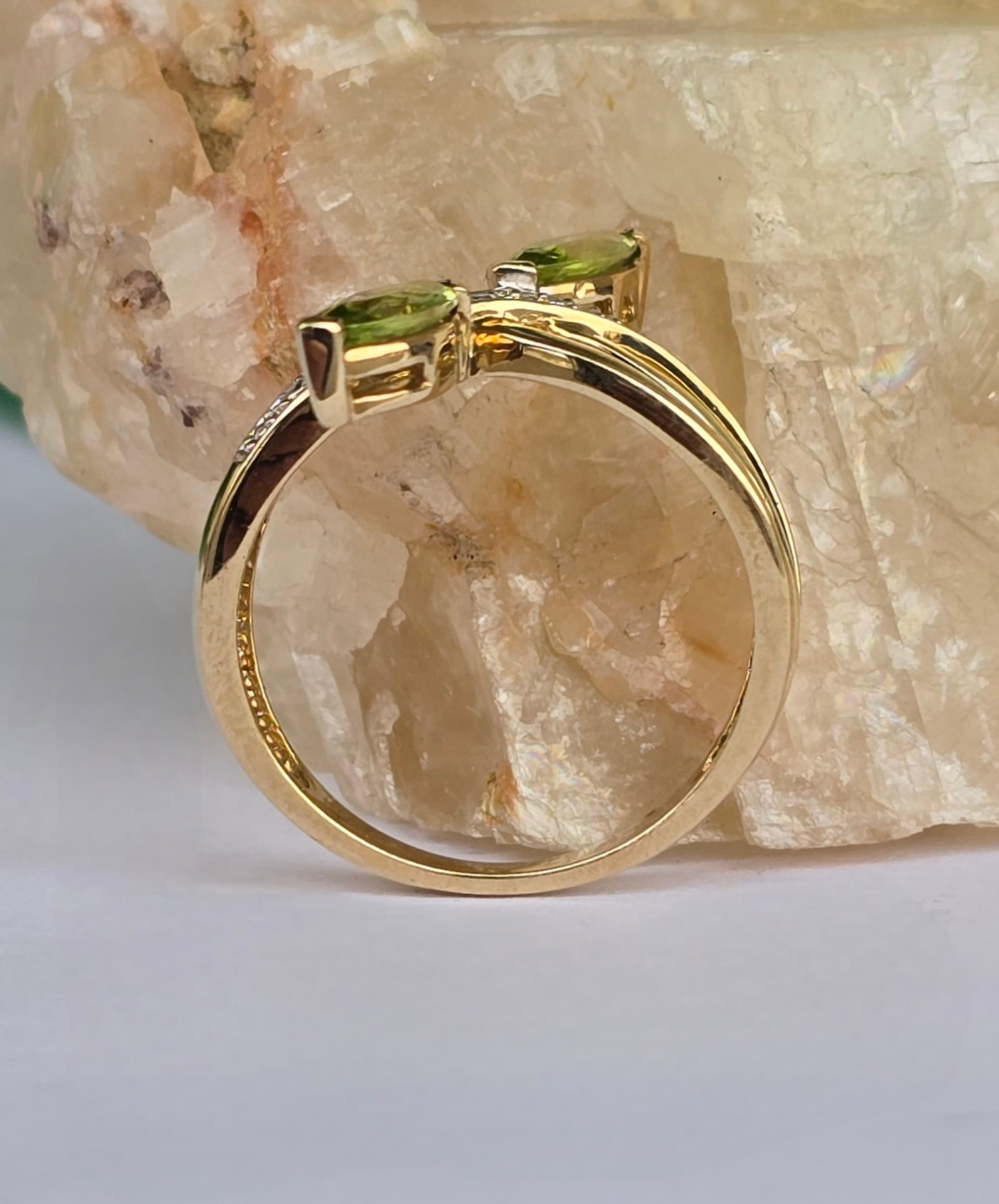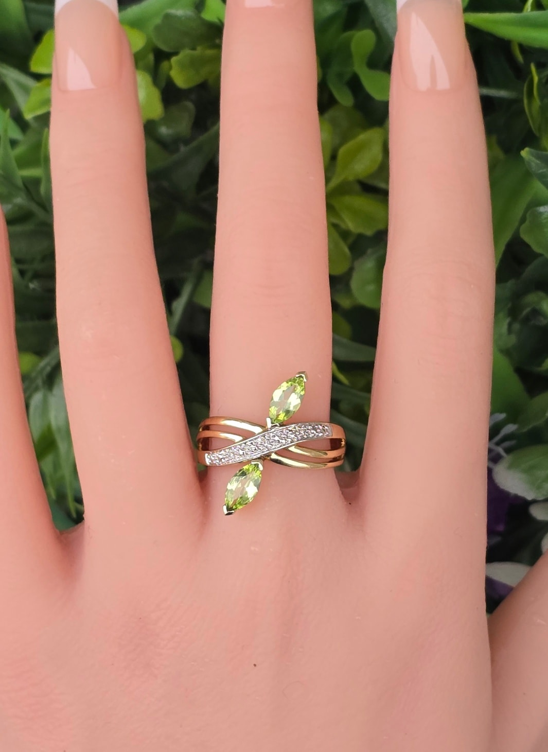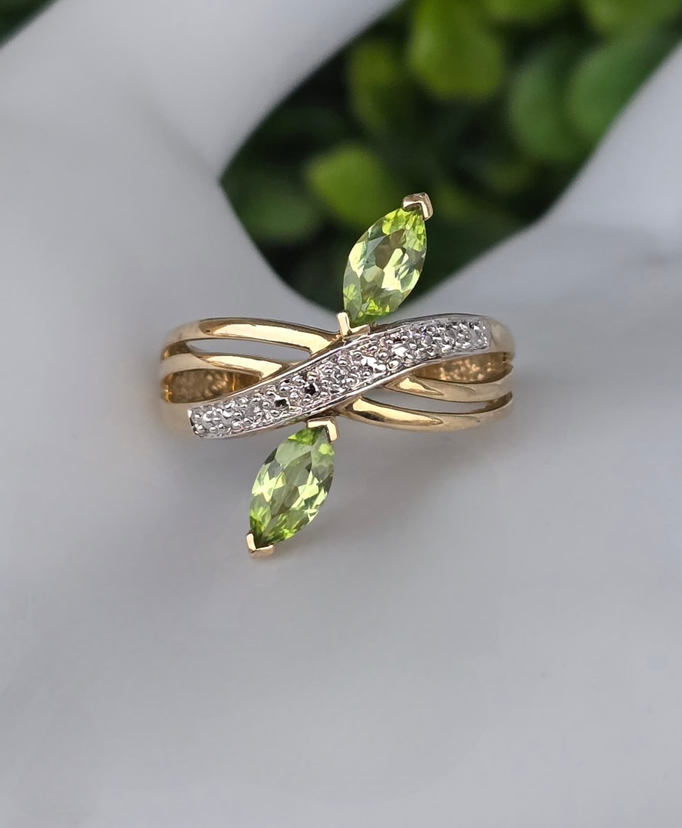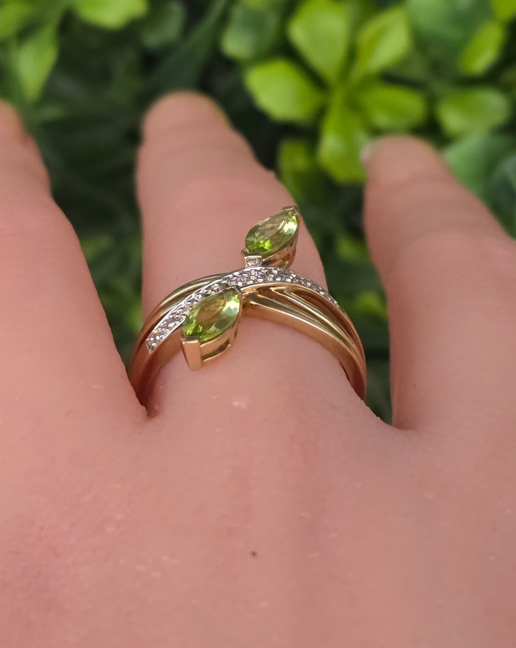 Inel vechi spectaculos, din aur de 8K, cu 2 peridot și 3 diamante naturale.