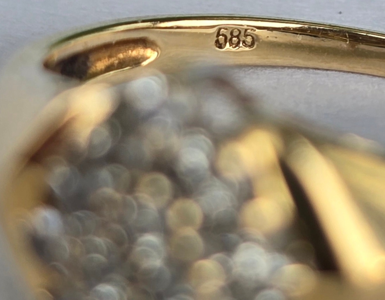 Prezintă marcaj 585 pentru puritate aur de 14K.