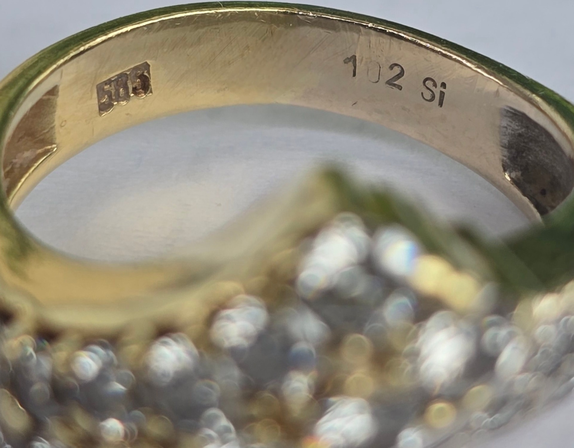 Prezintă marcaj 585 pentru puritate aur de 14K și marcaje "1.02" și "SI" pentru caratajul și claritatea diamantelor.