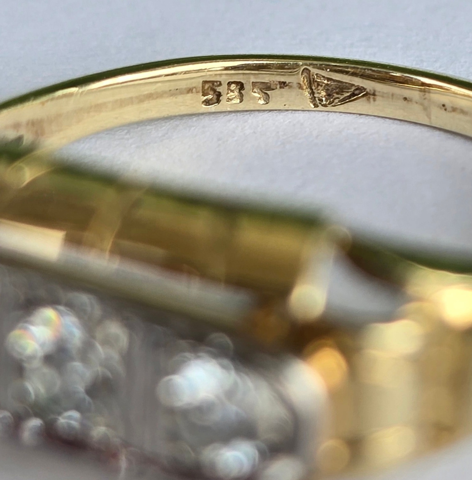 Prezintă marcaj 585 pentru puritate aur de 14K și marcaj de meșter.