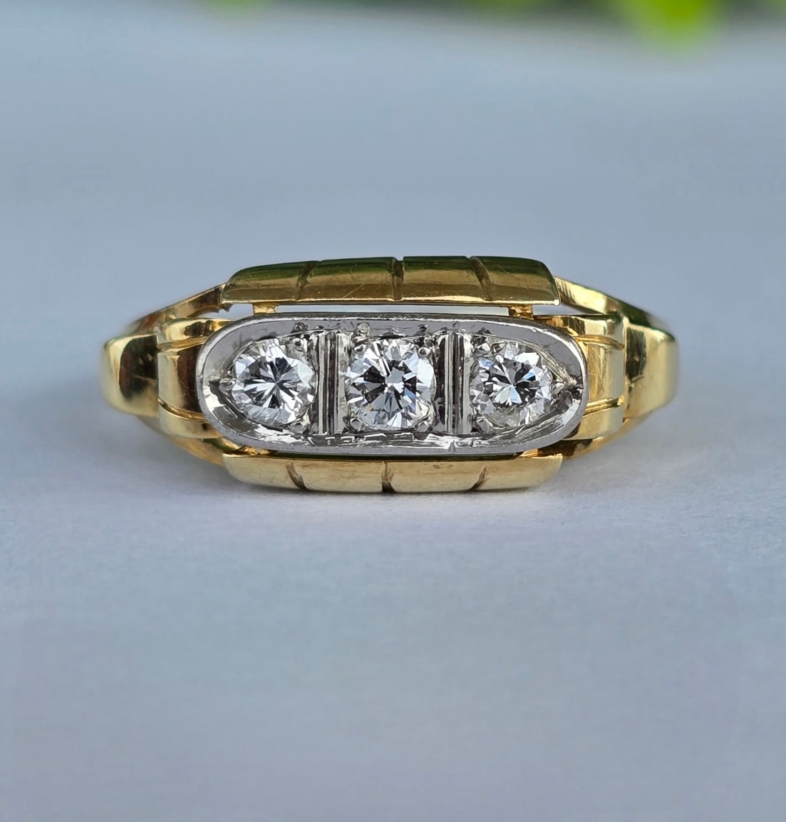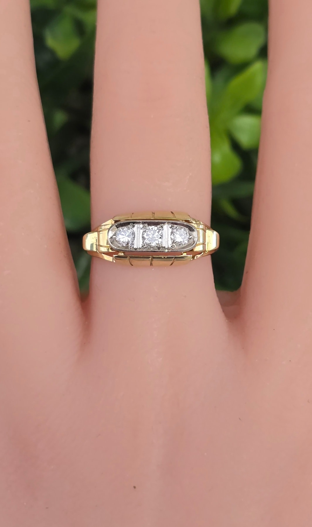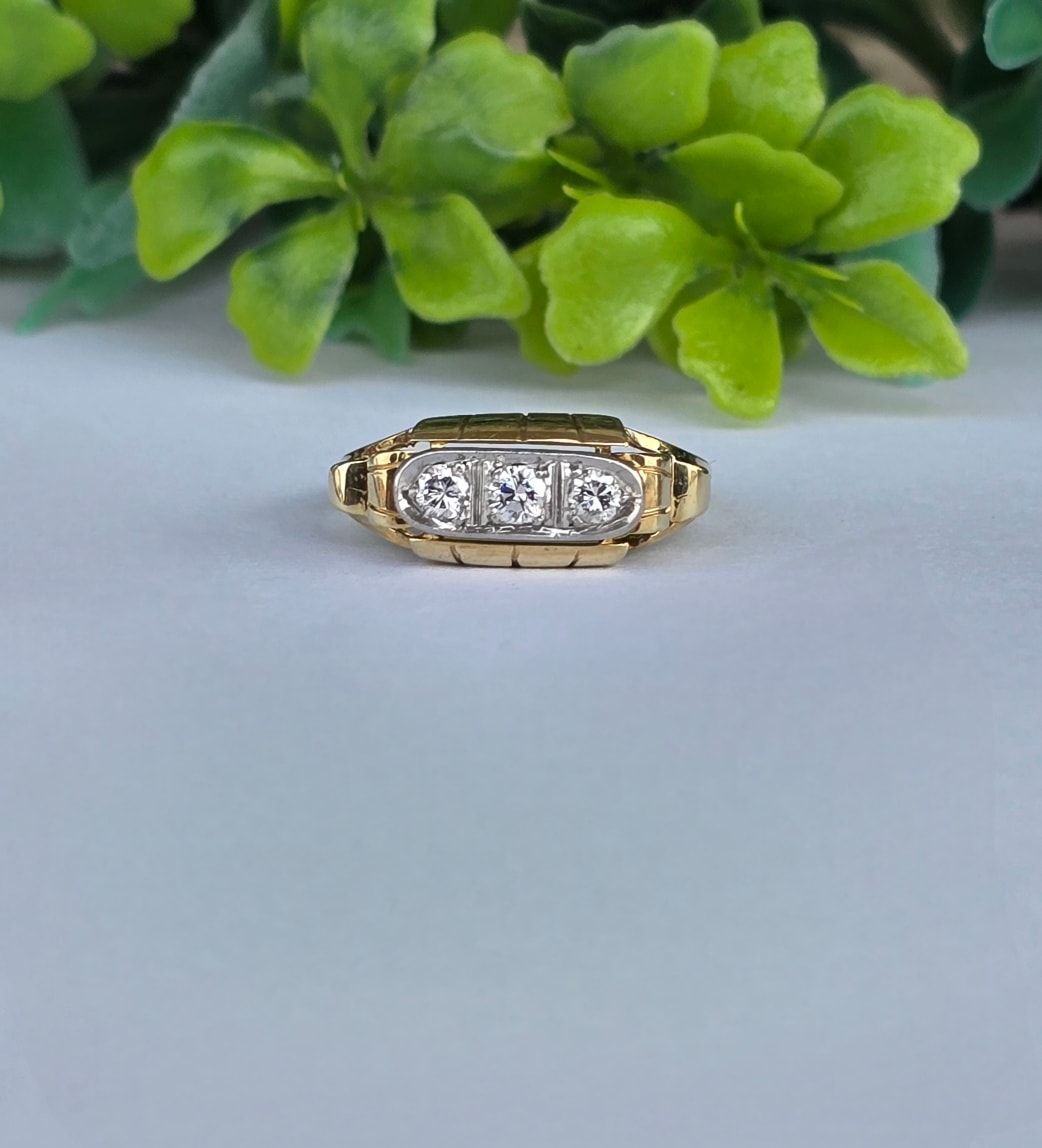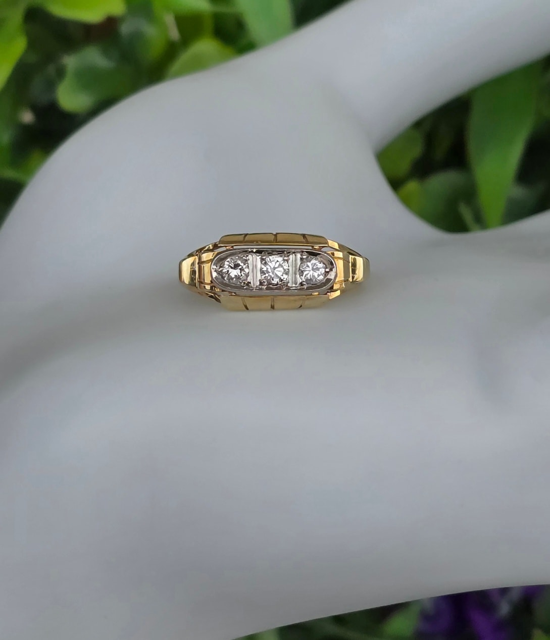 Inel vechi strălucitor, din aur de 14K, cu 3 superbe diamante naturale (0.24ct) de calitate excepțională.