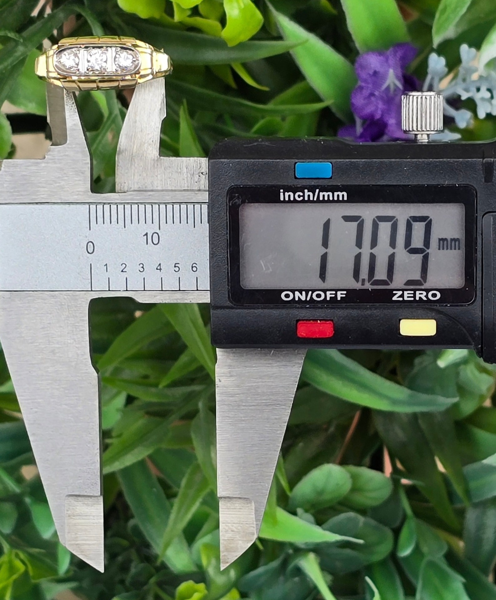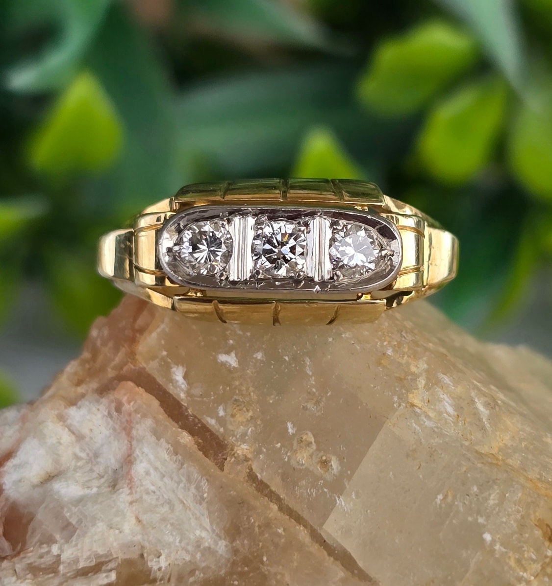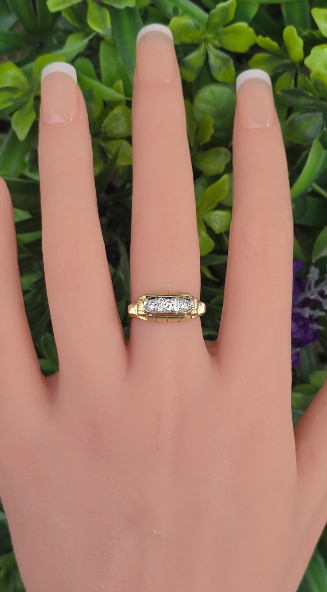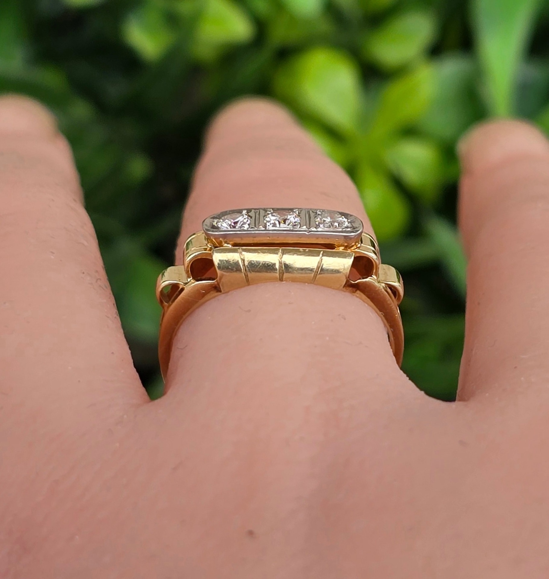 Inel vechi strălucitor, din aur de 14K, cu 3 superbe diamante naturale (0.24ct) de calitate excepțională.