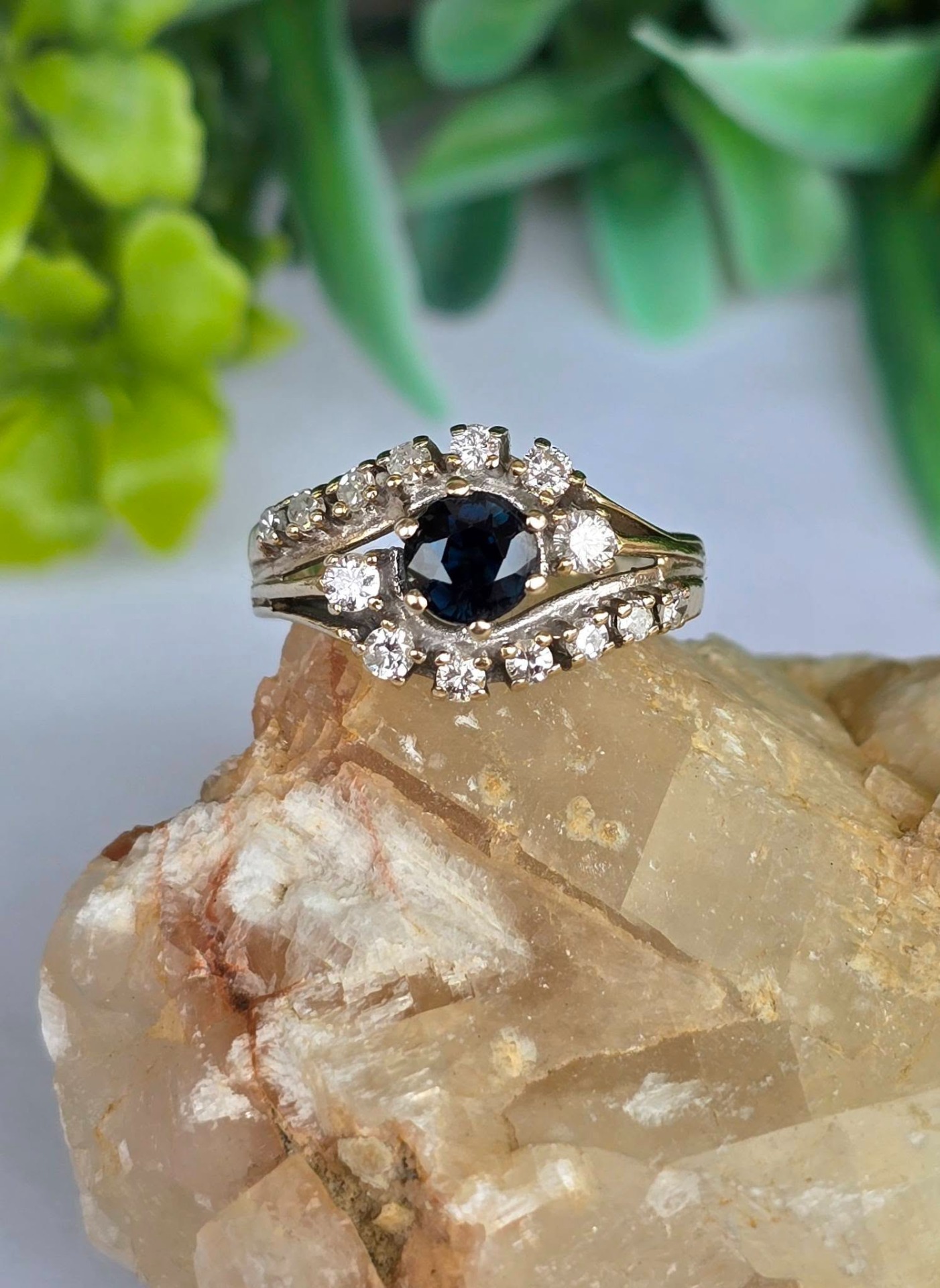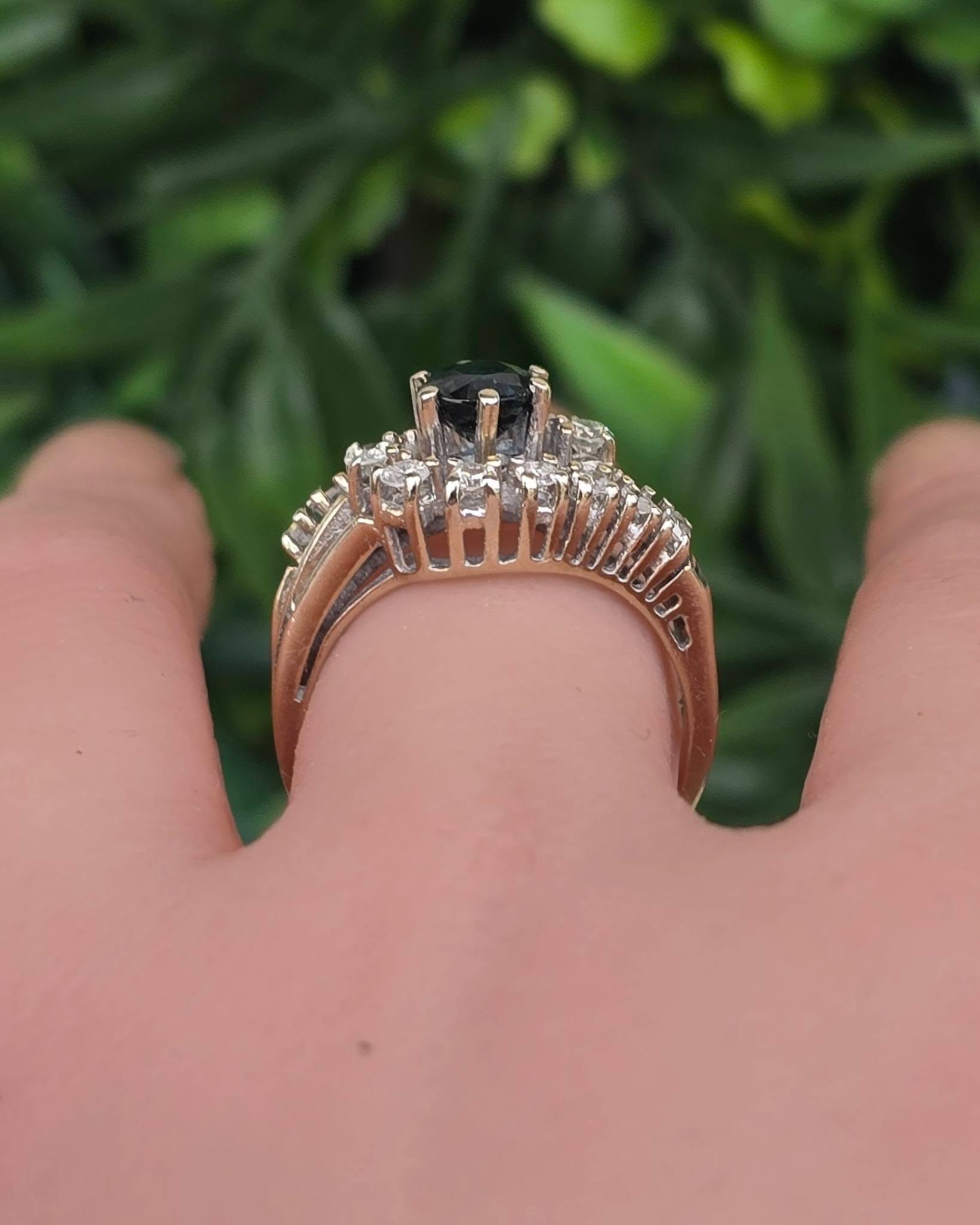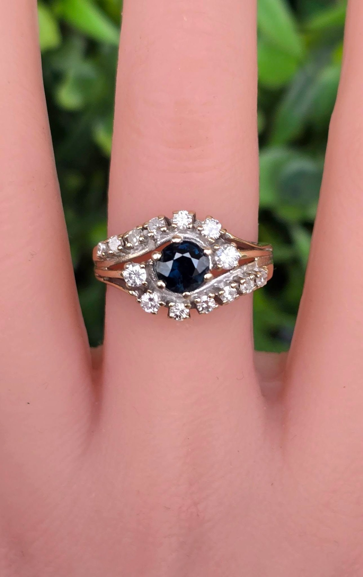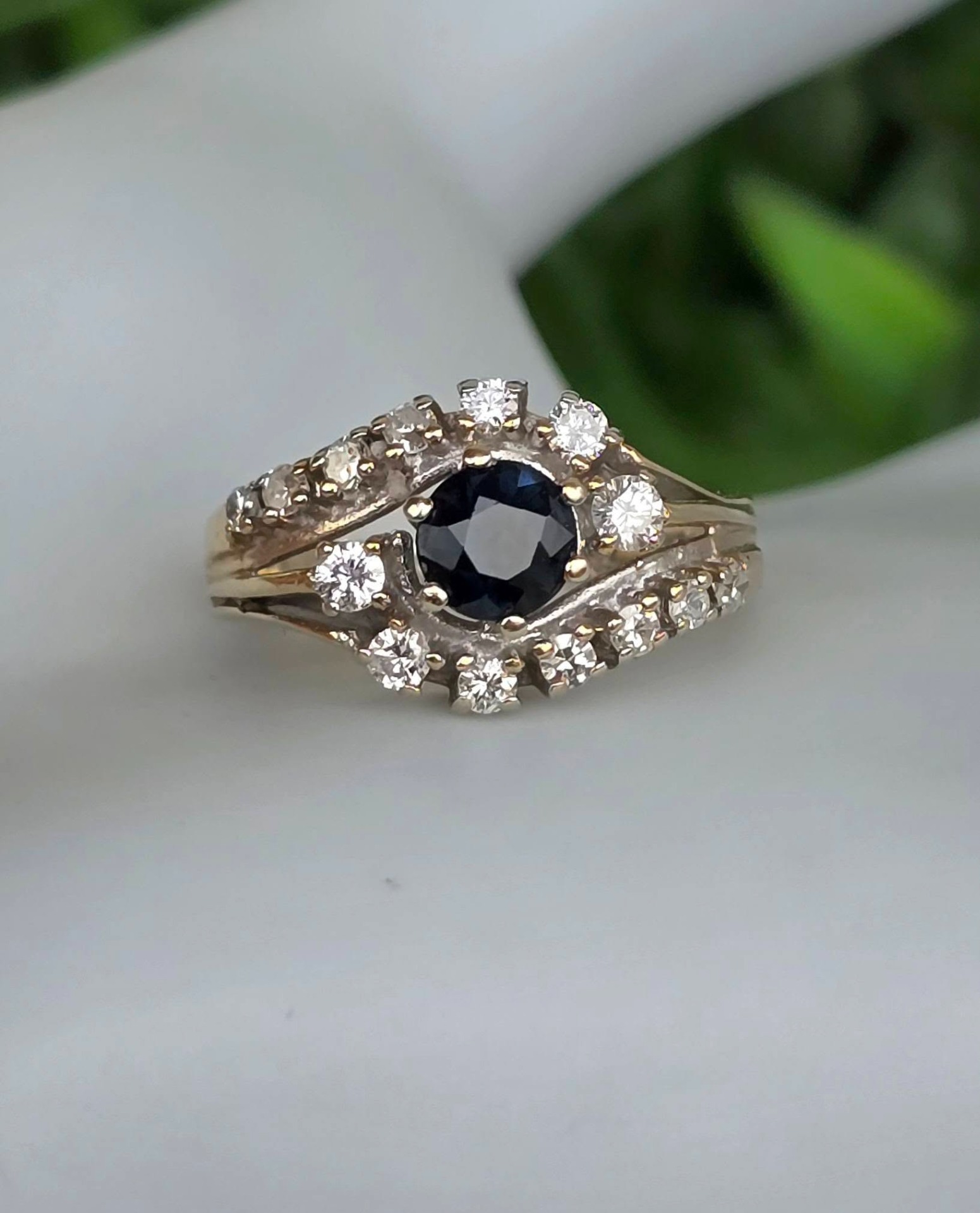 Inel vechi strălucitor, din aur de 14K, cu safir și 14 diamante naturale (0.54ct).