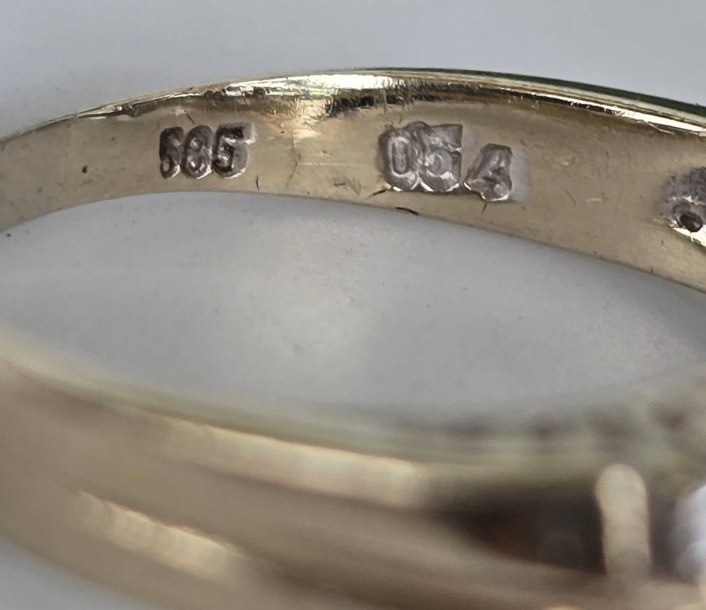 Prezintă marcaj 585 pentru puritate aur de 14K și marcaj "0.54" pentru caratajul diamantelor.