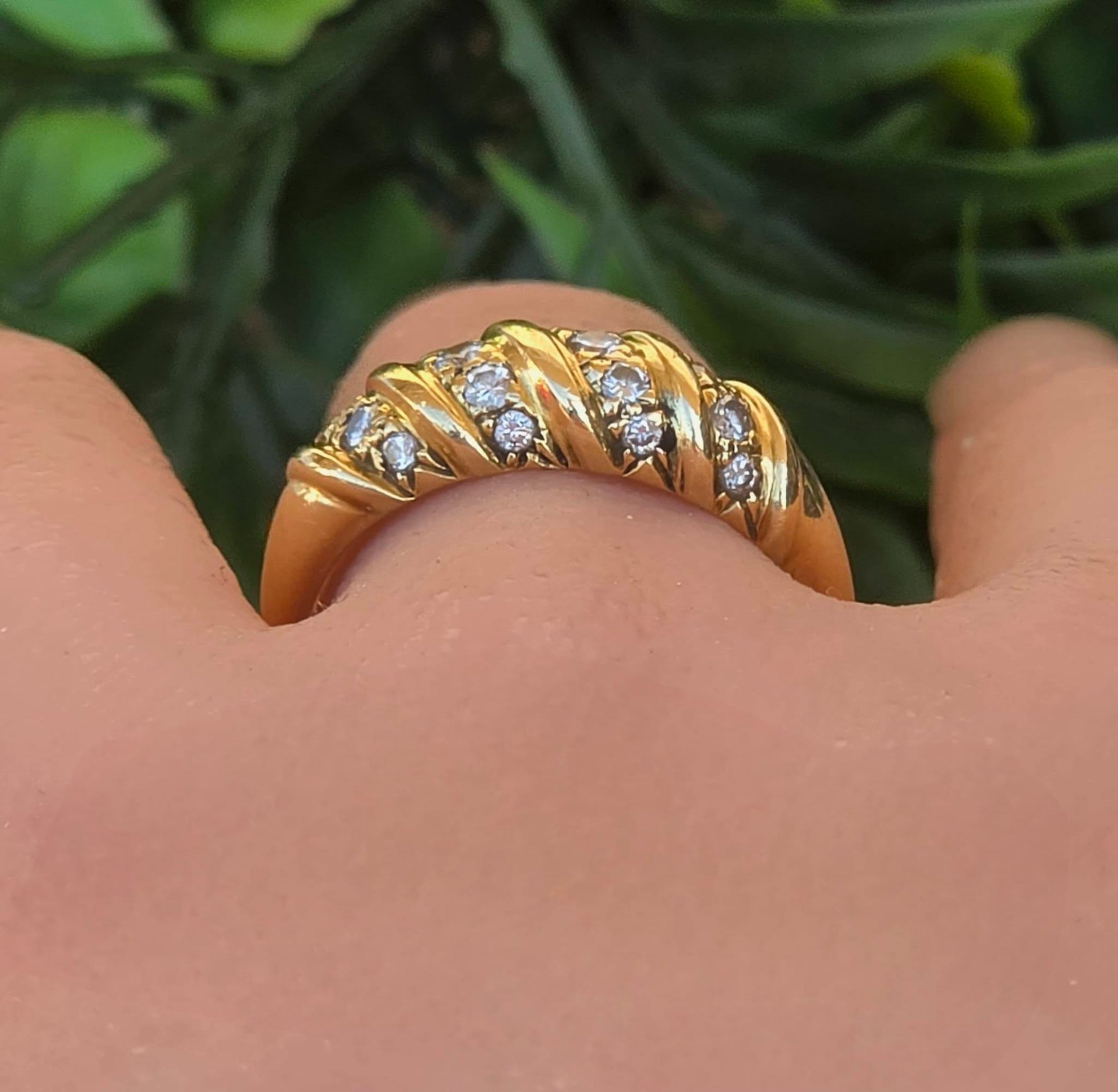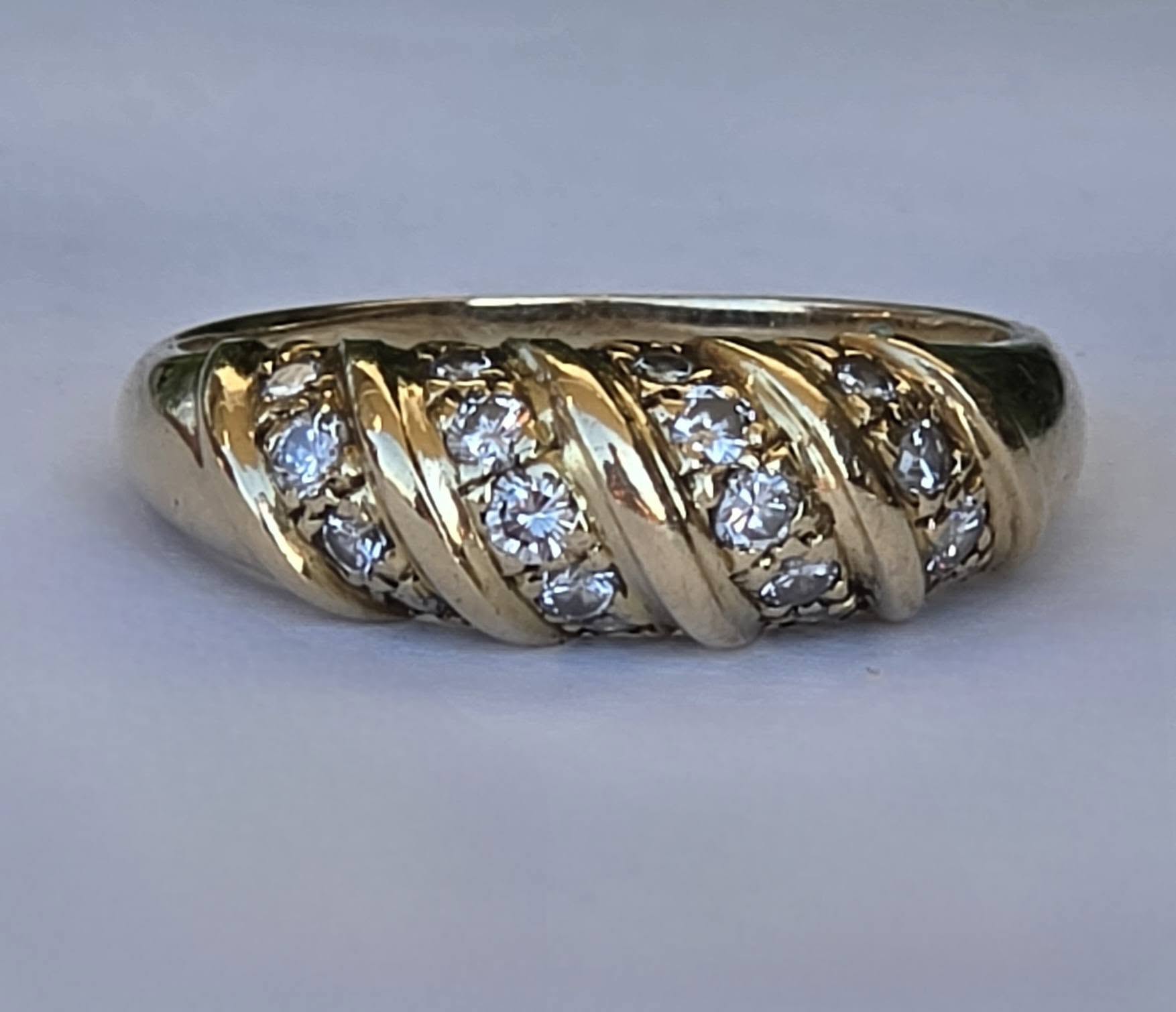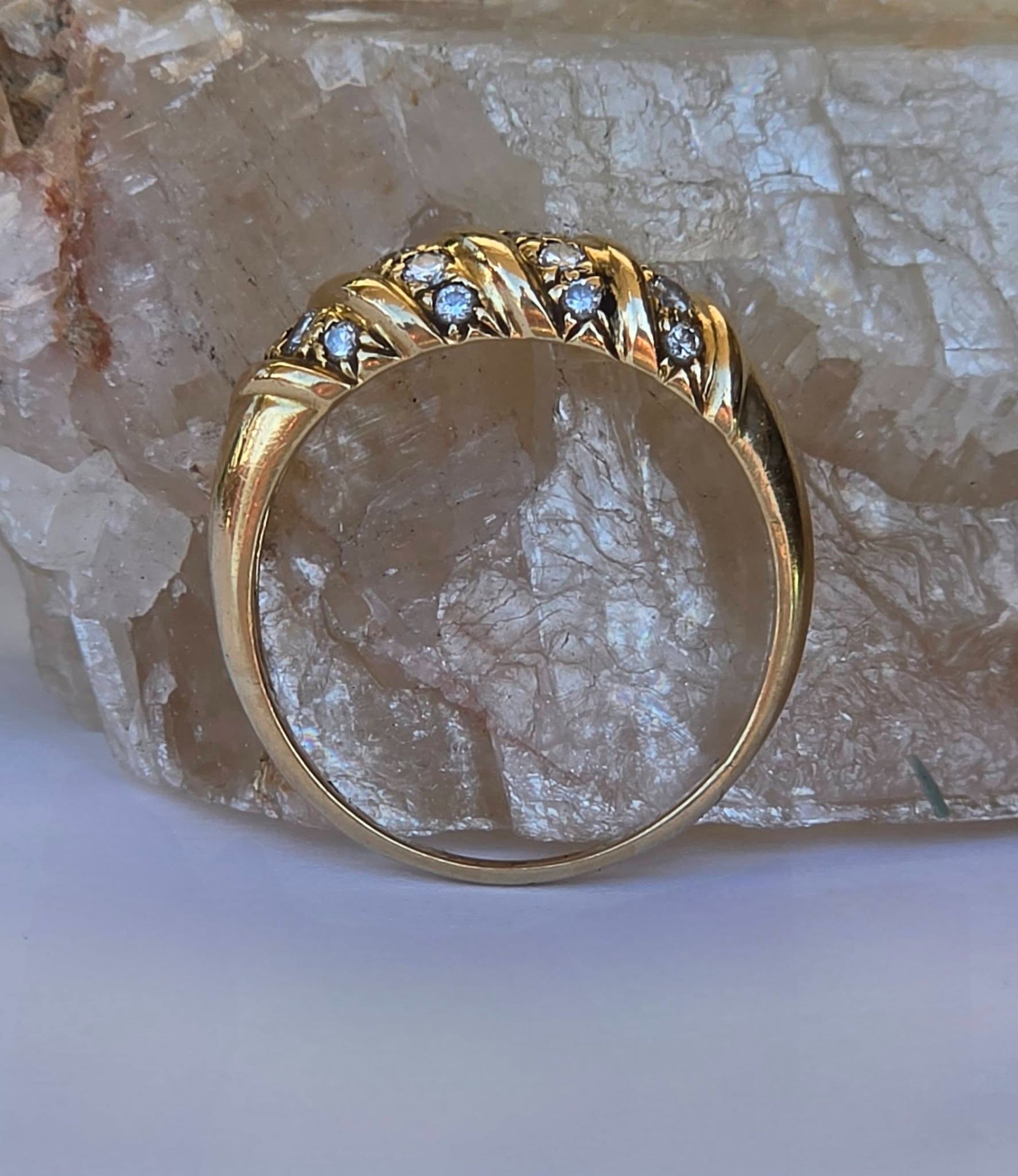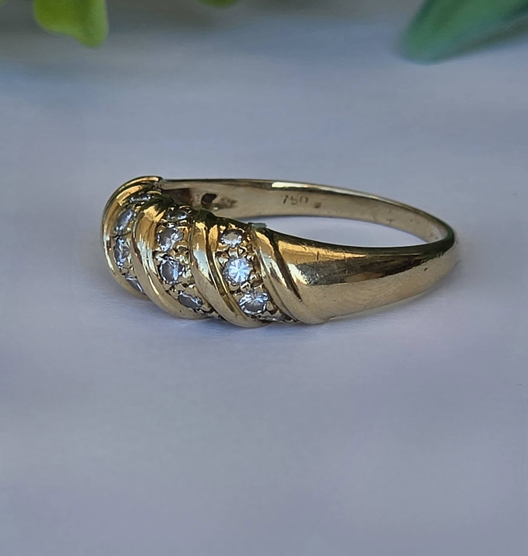 Inel vechi strălucitor, din aur de 18K, cu 18 diamante naturale de calitate superioară.