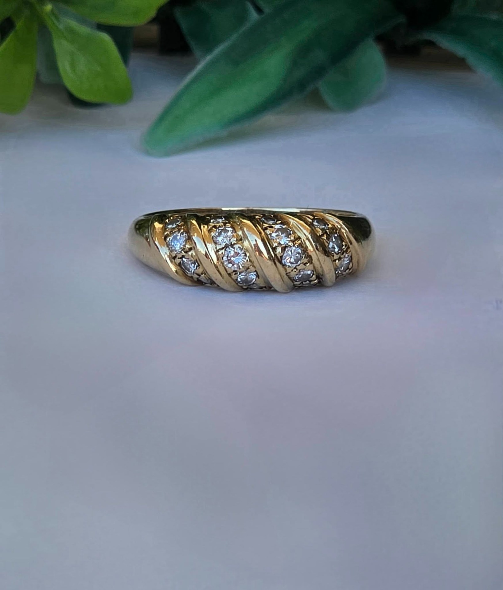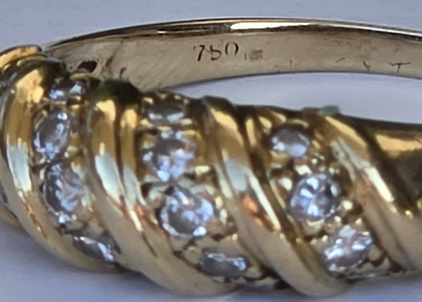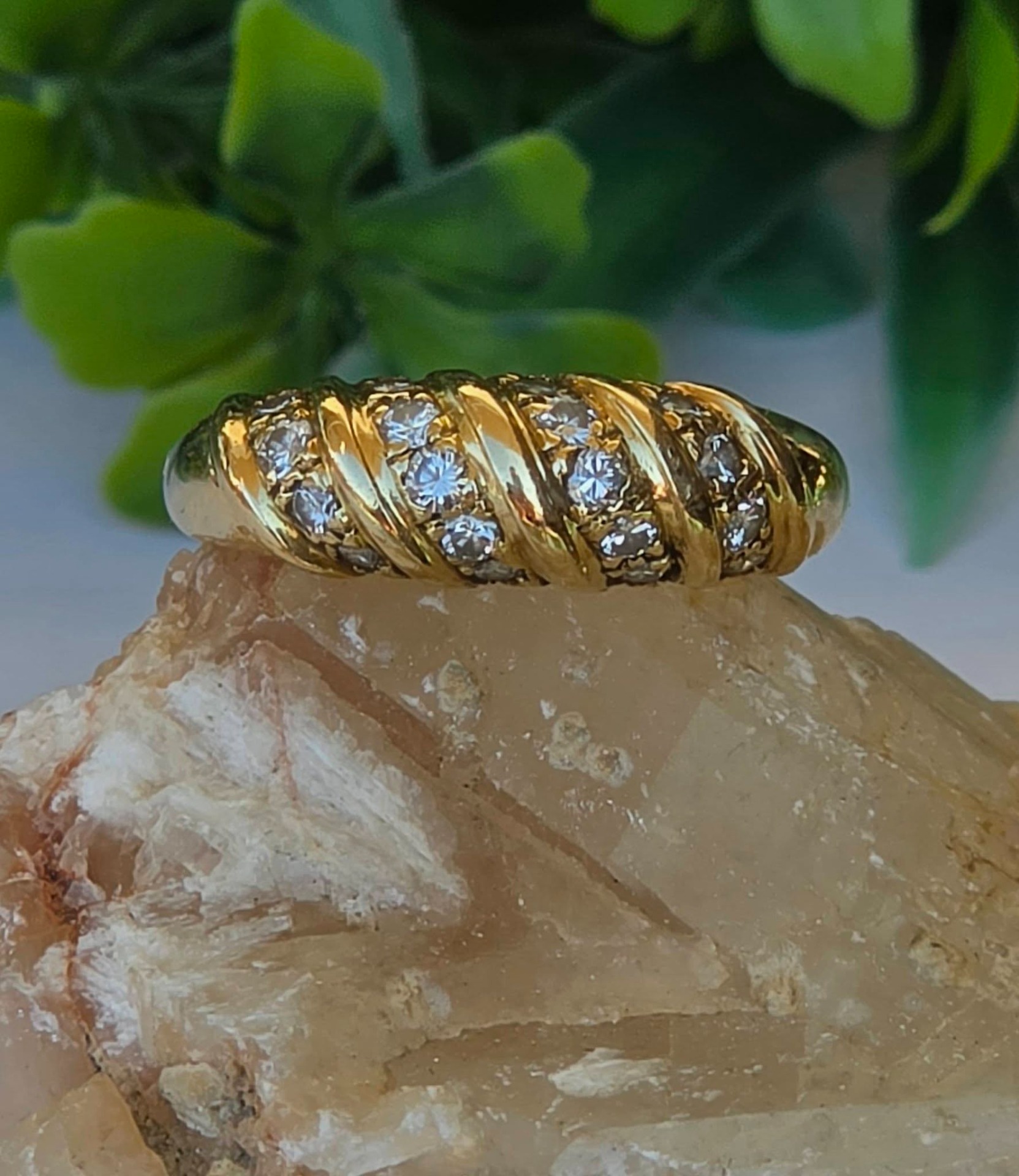 Inel vechi strălucitor, din aur de 18K, cu 18 diamante naturale de calitate superioară.