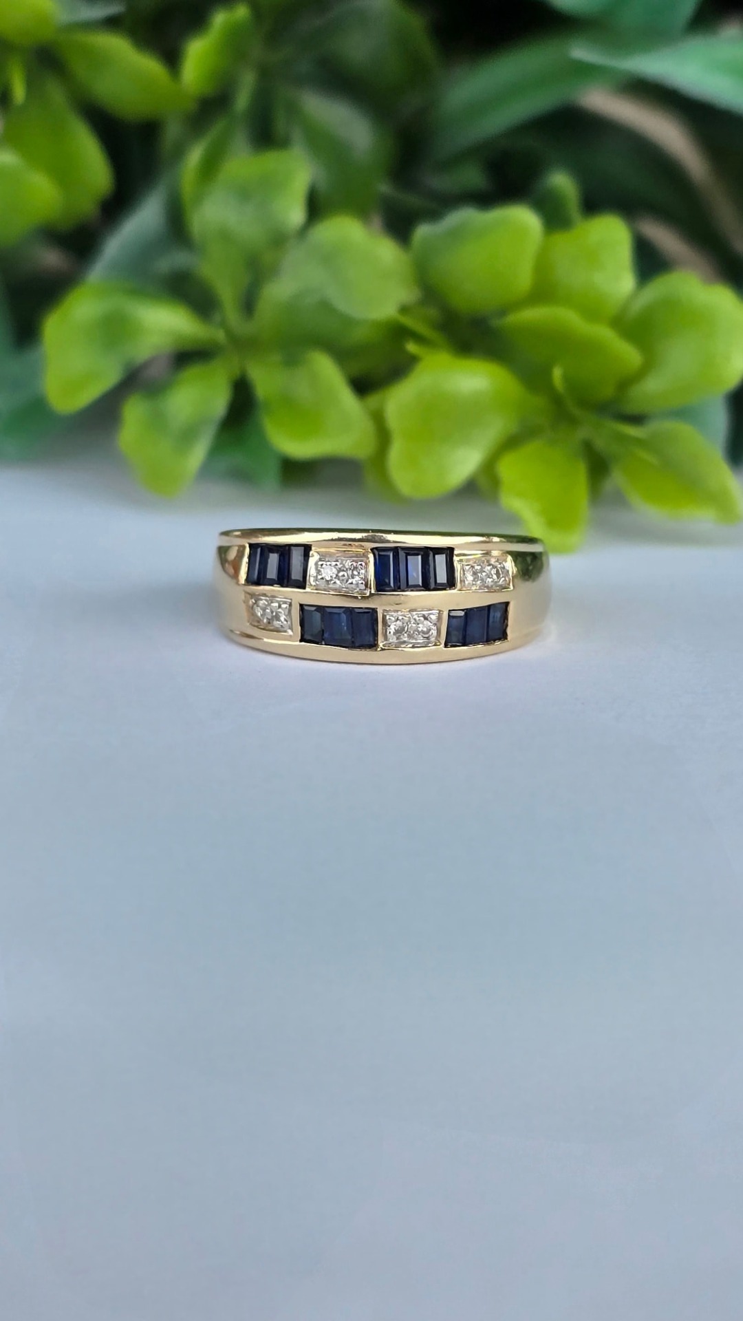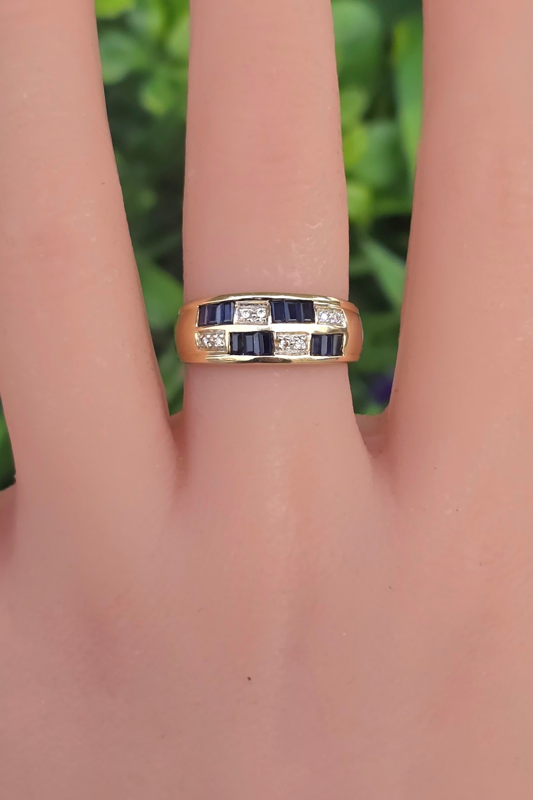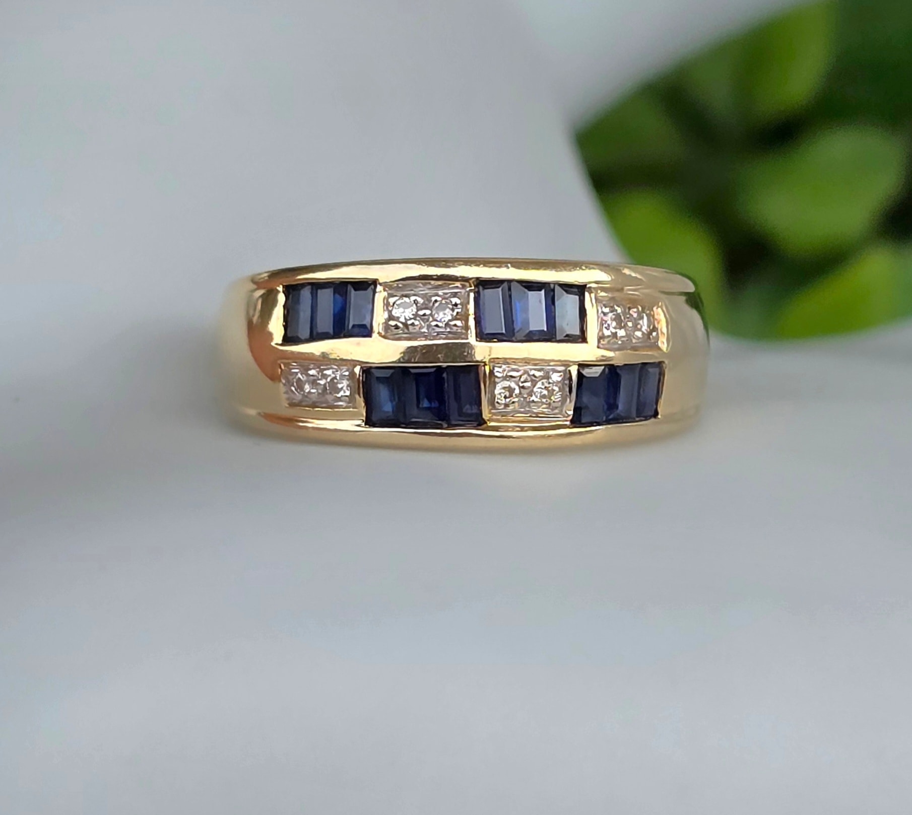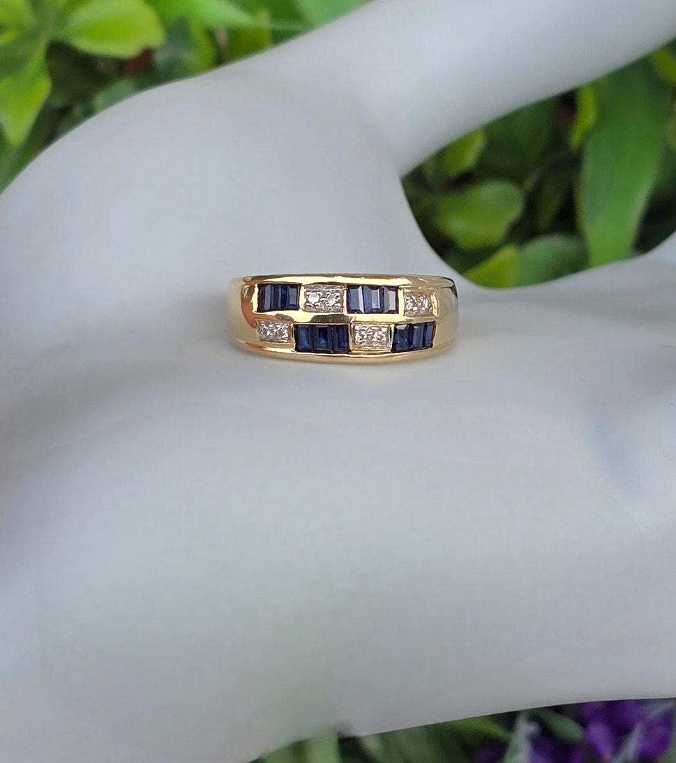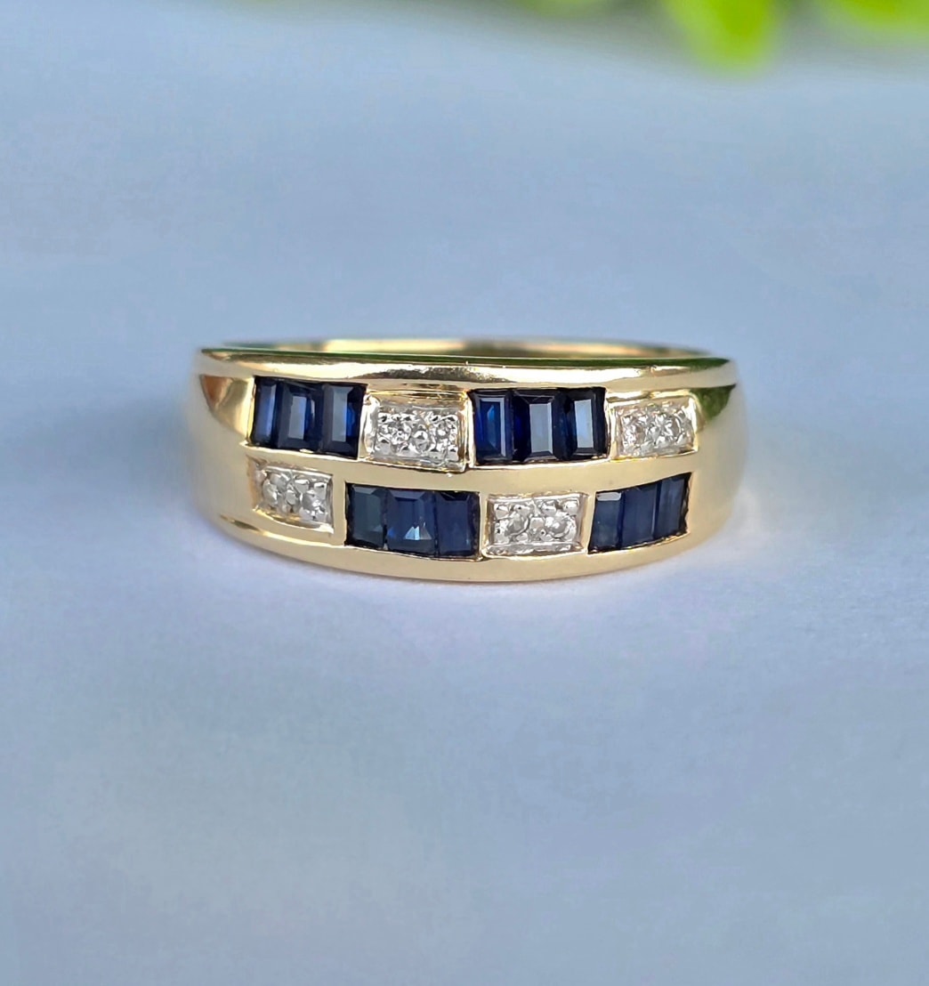 Inel vechi superb, din aur de 14K, cu 12 safire "baguette" și 8 diamante naturale.