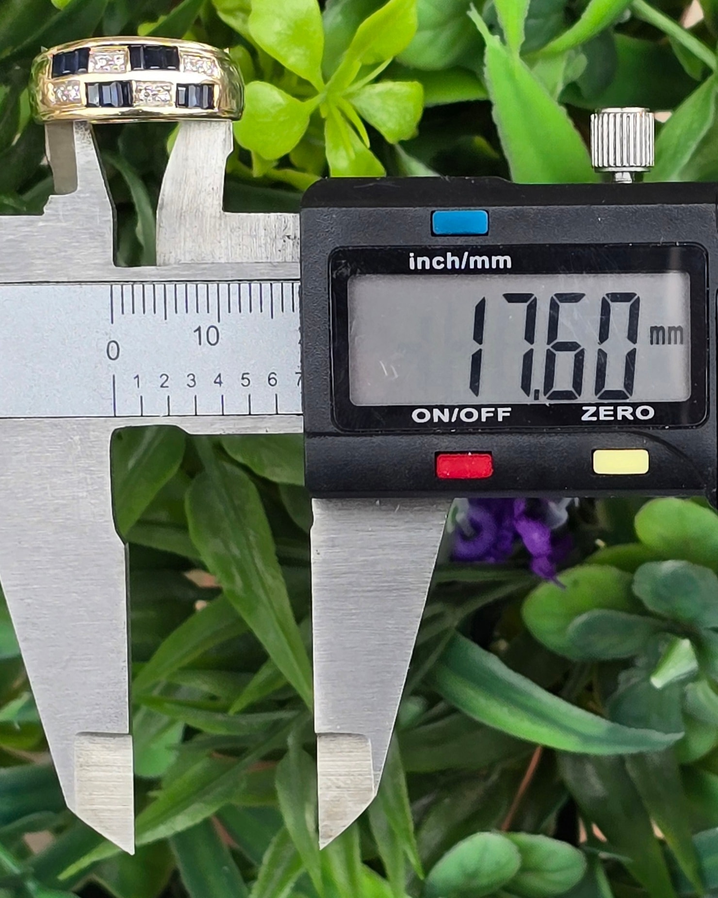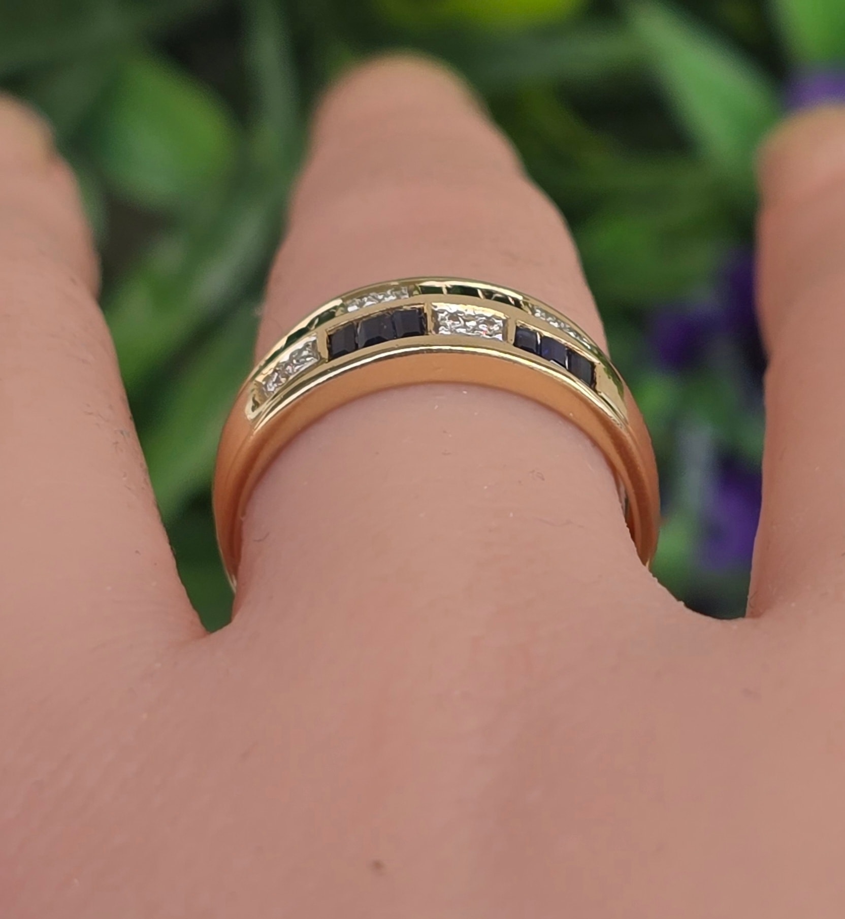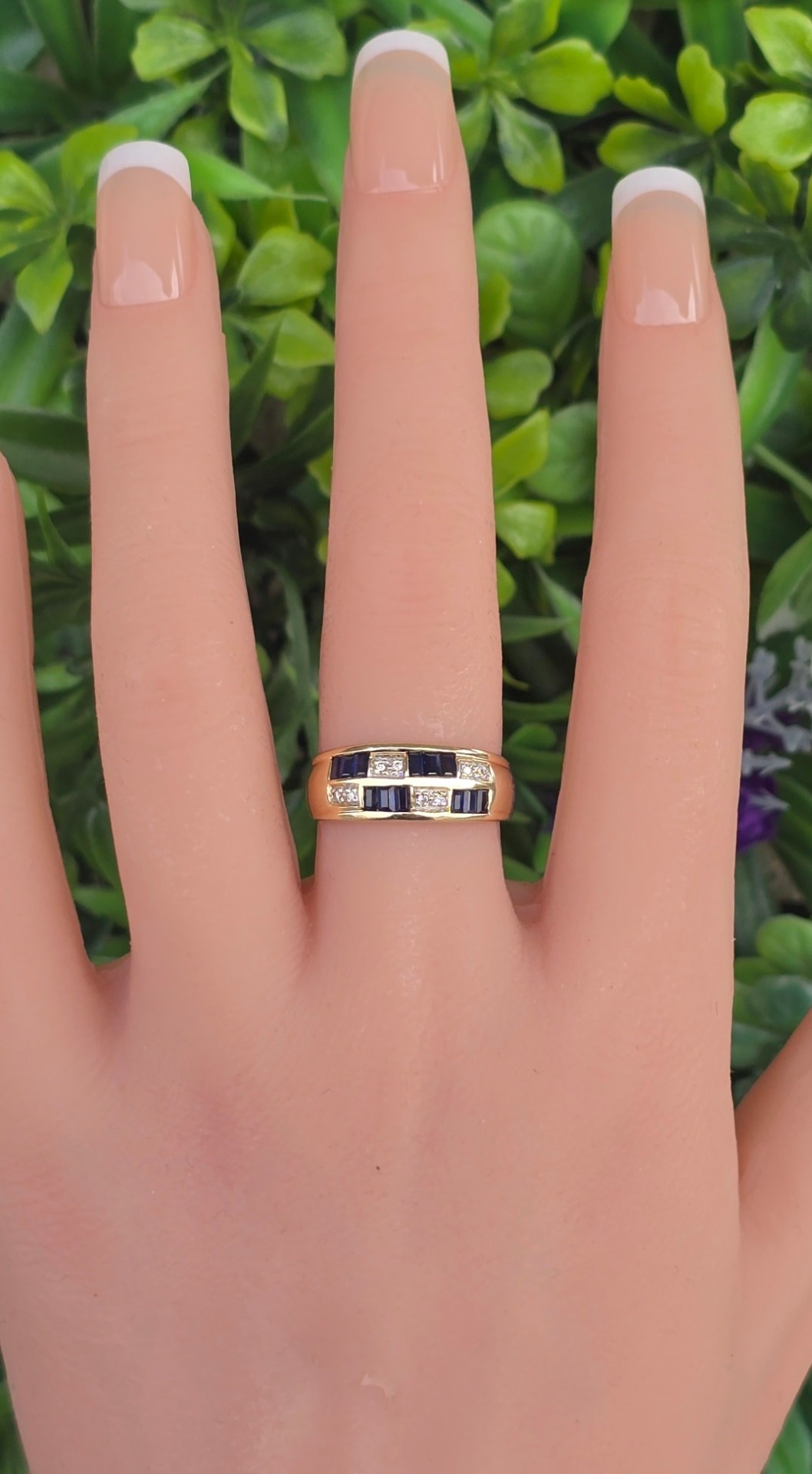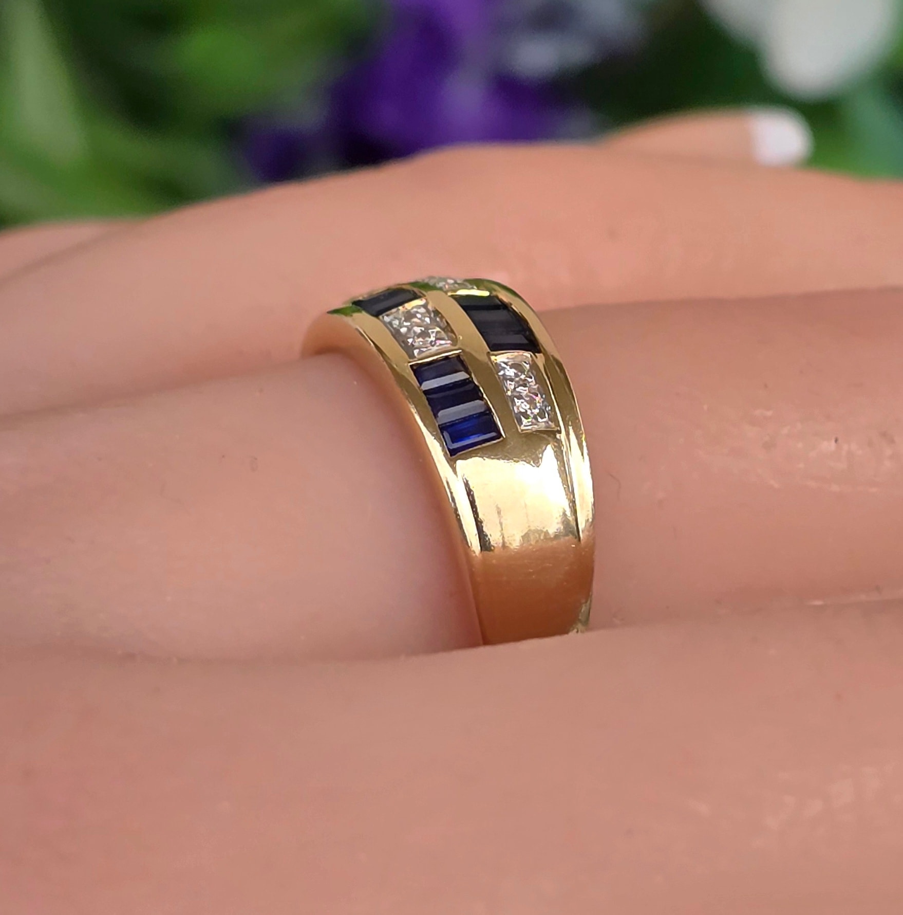 Inel vechi superb, din aur de 14K, cu 12 safire "baguette" și 8 diamante naturale.
