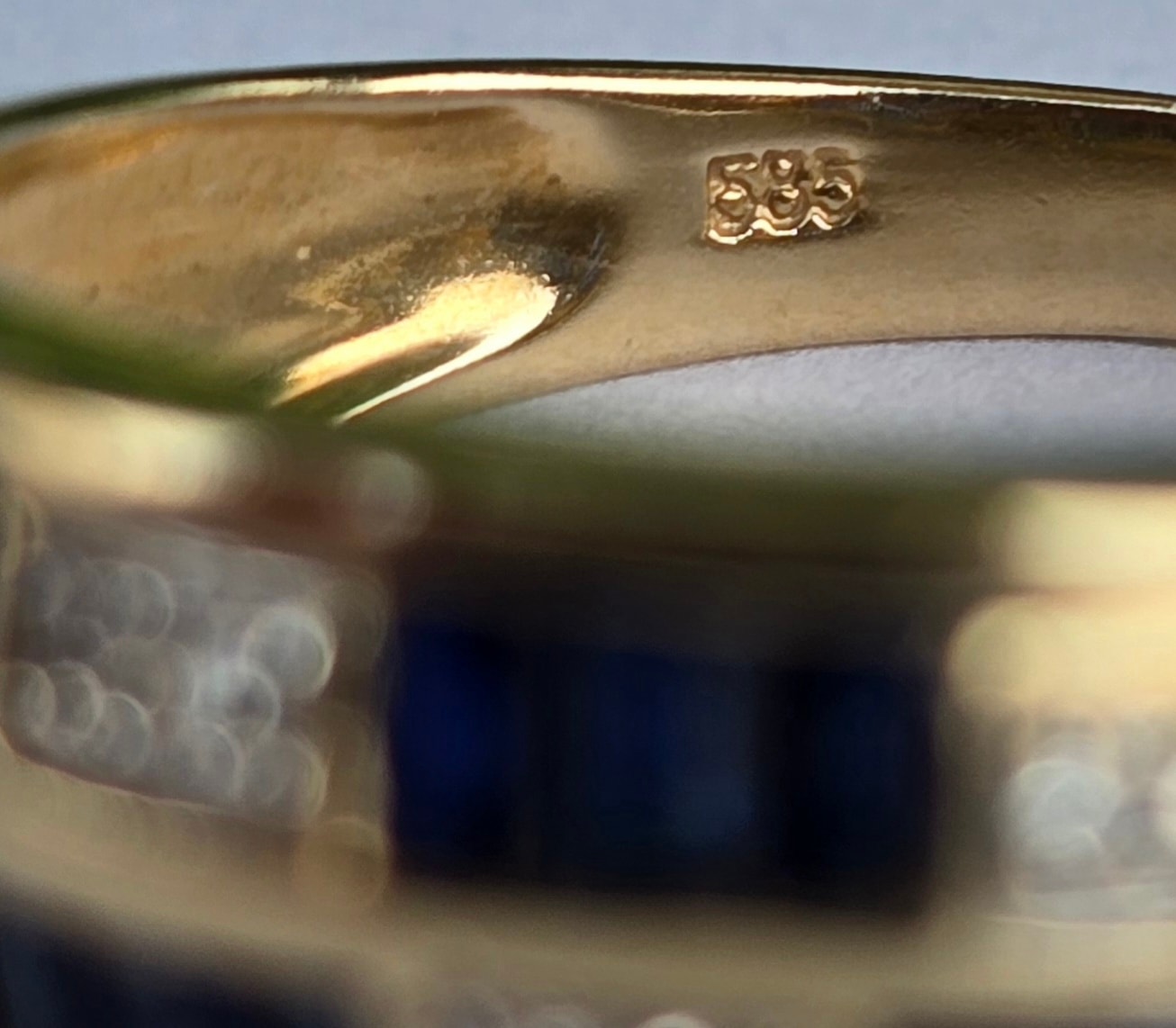 Prezintă marcaj 585 pentru puritate aur de 14K.