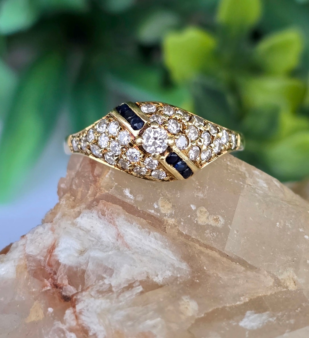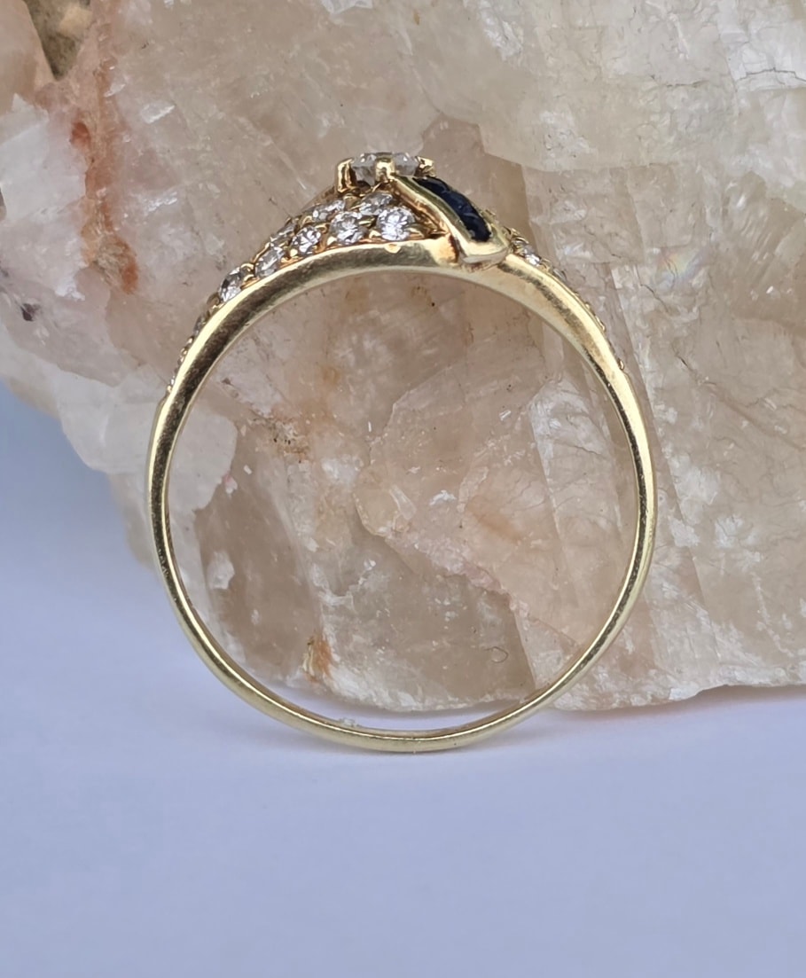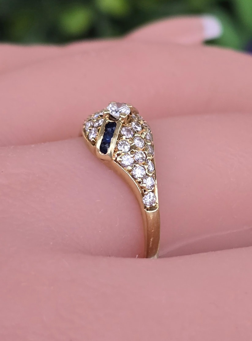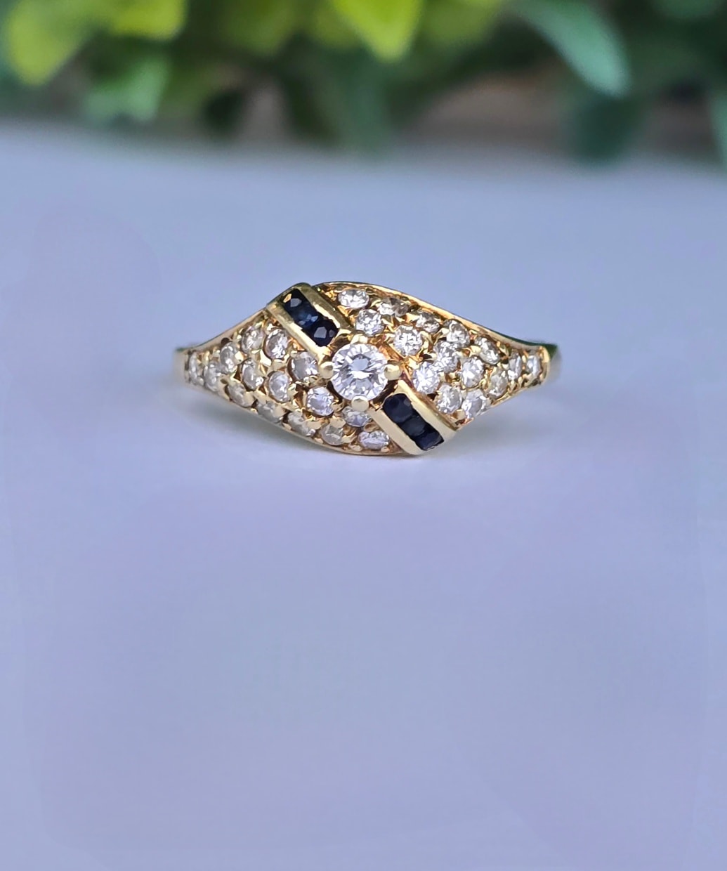 Inel vechi superb, din aur de 14K, cu 6 safire și 31 diamante (0.53ct) naturale de calitate superioară.