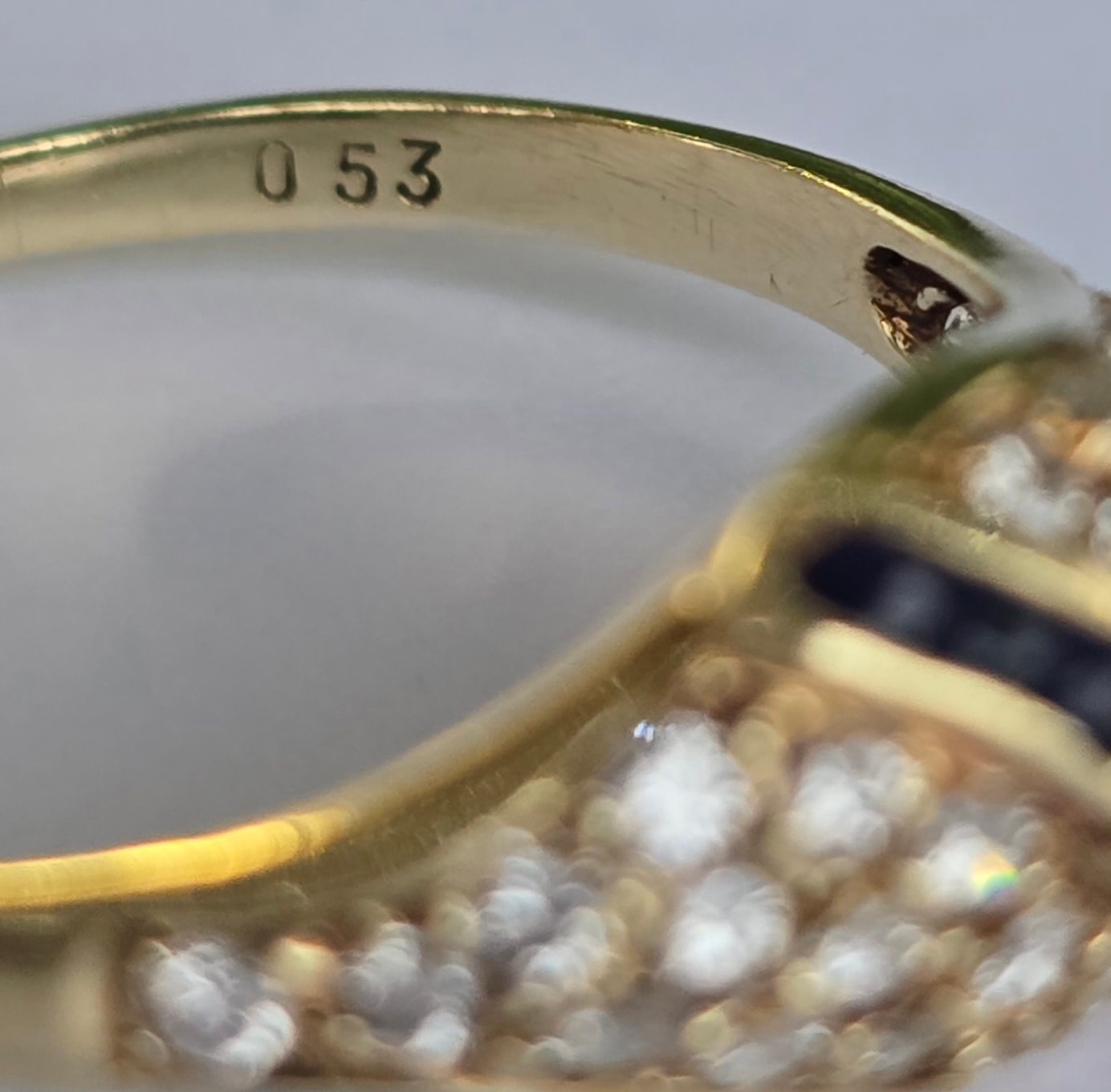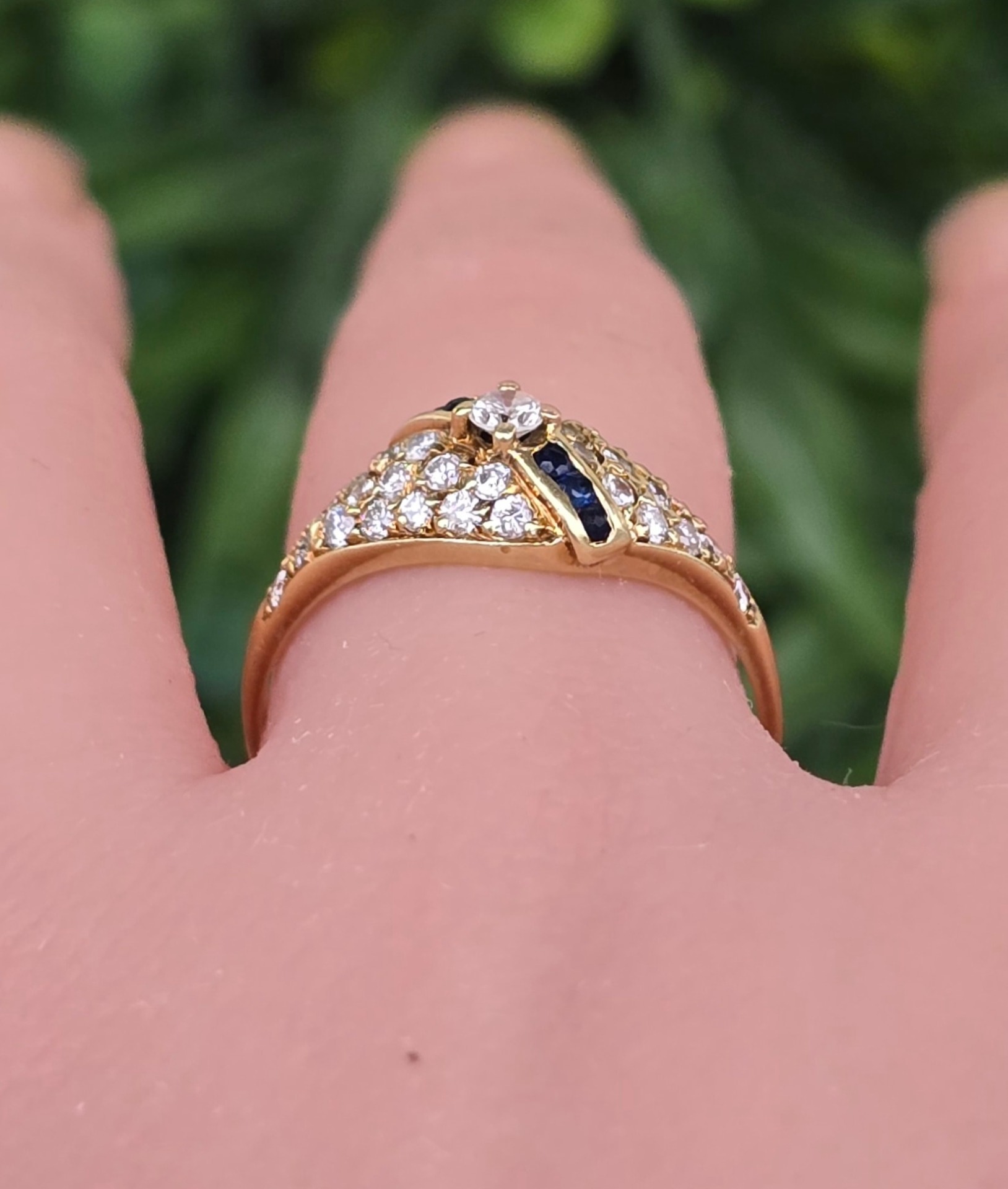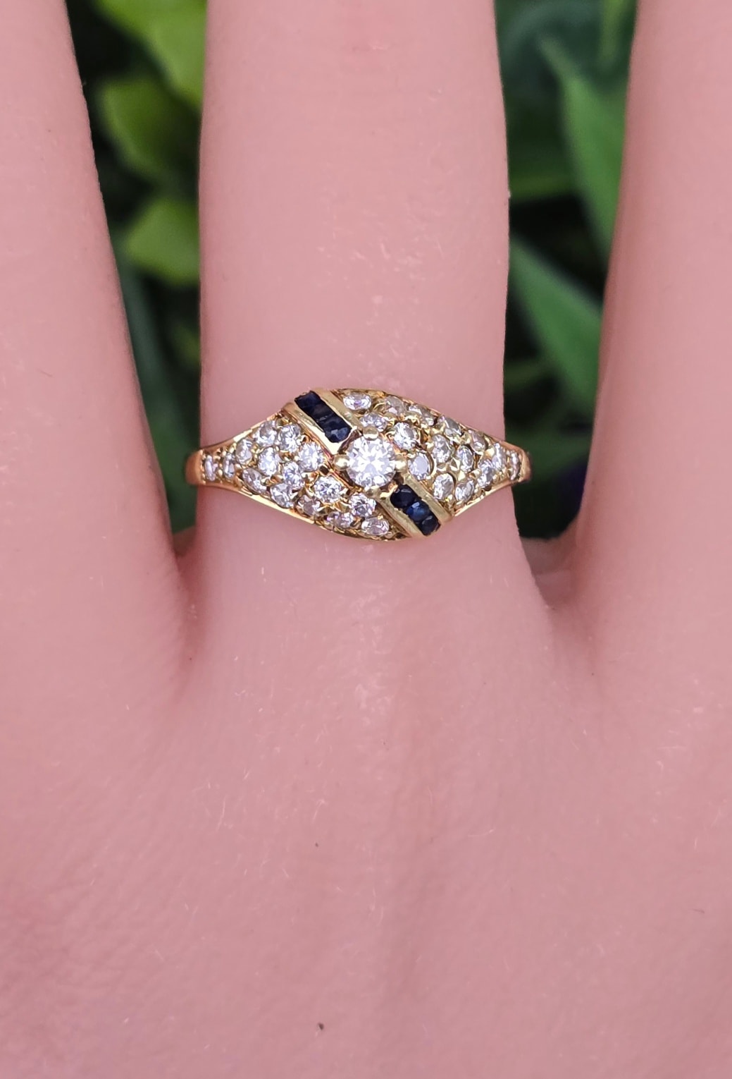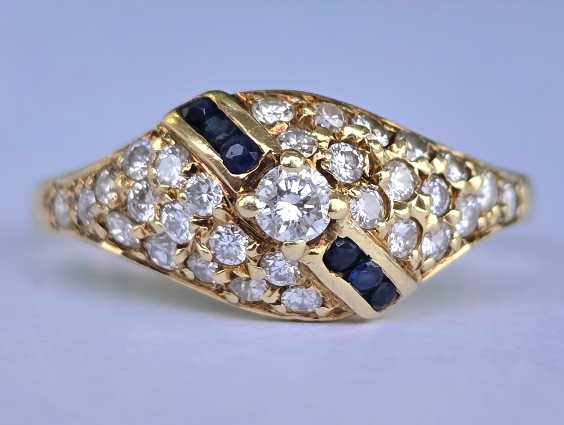 Inel vechi superb, din aur de 14K, cu 6 safire și 31 diamante (0.53ct) naturale de calitate superioară.