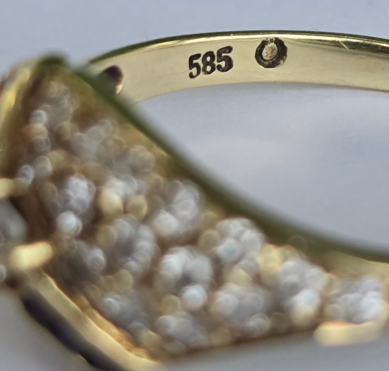 Prezintă marcaj 585 pentru puritate aur de 14K, marcaj "0.53" pentru caratajul diamantelor și marcaj de meșter.