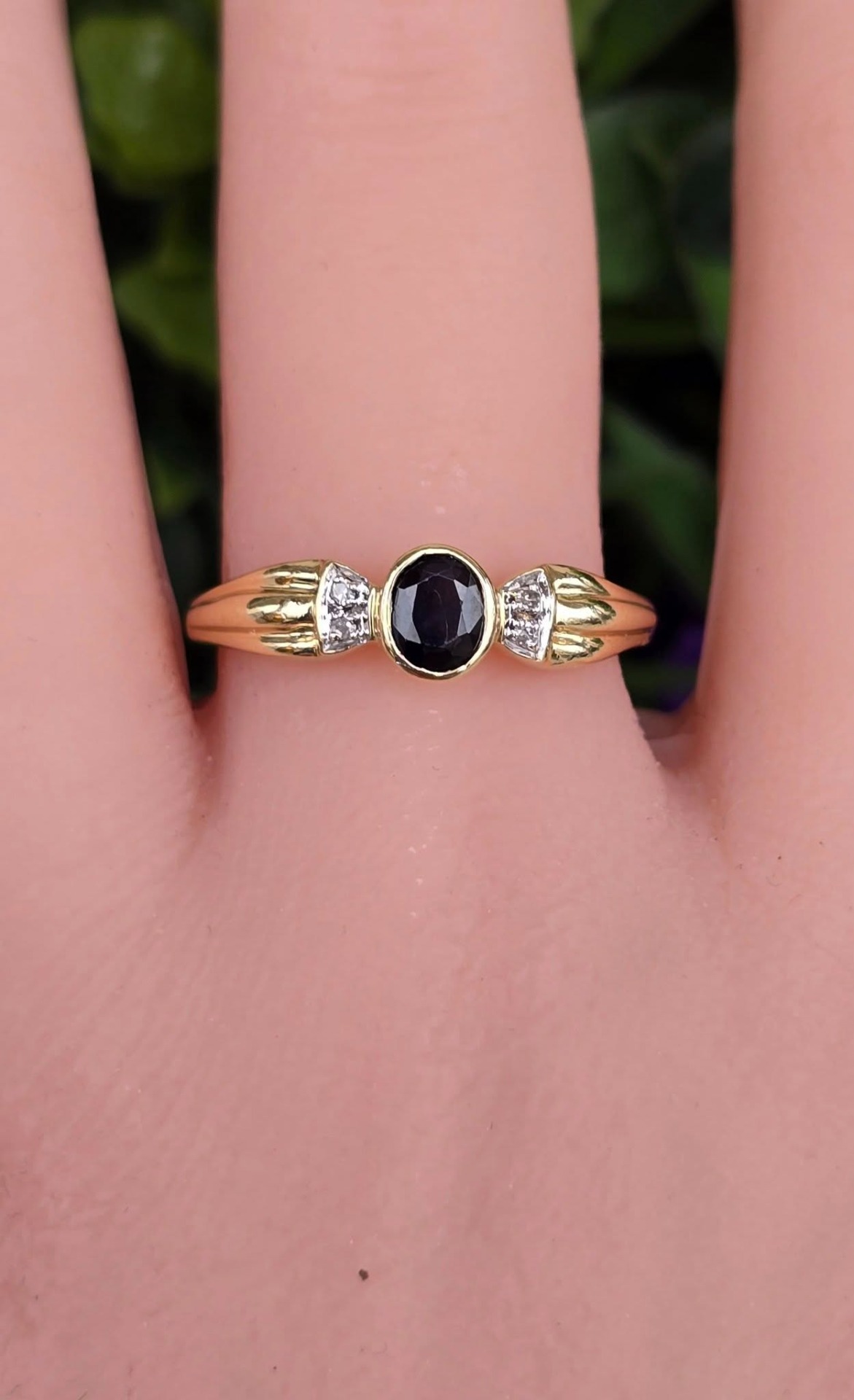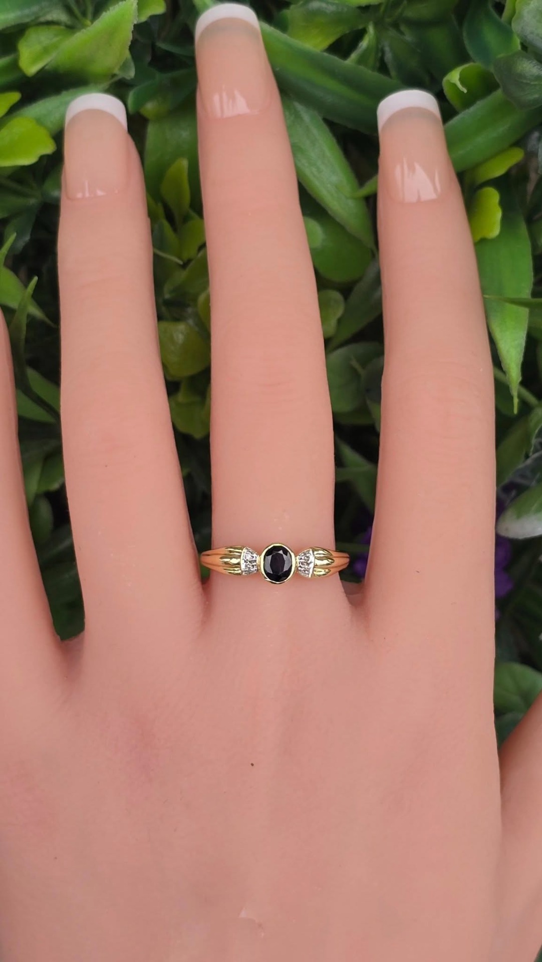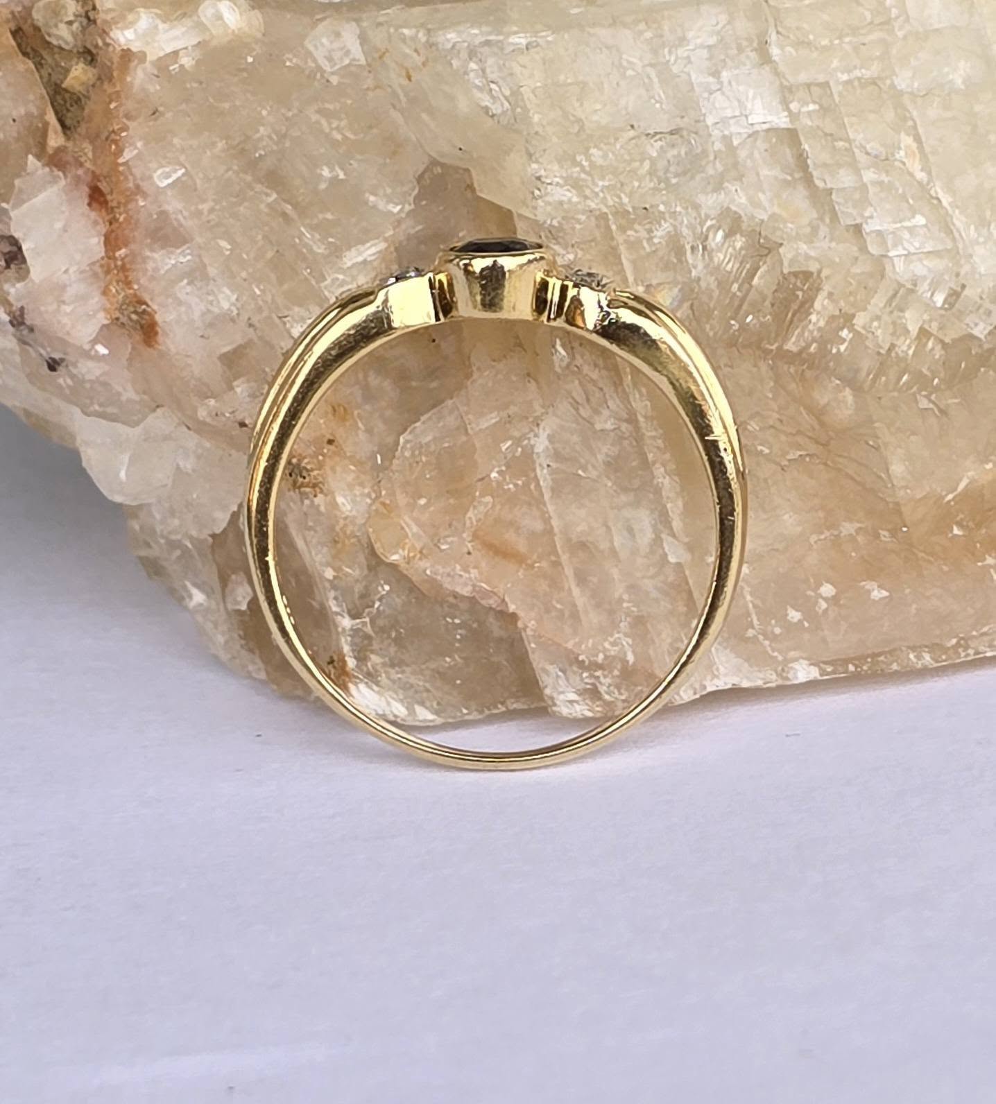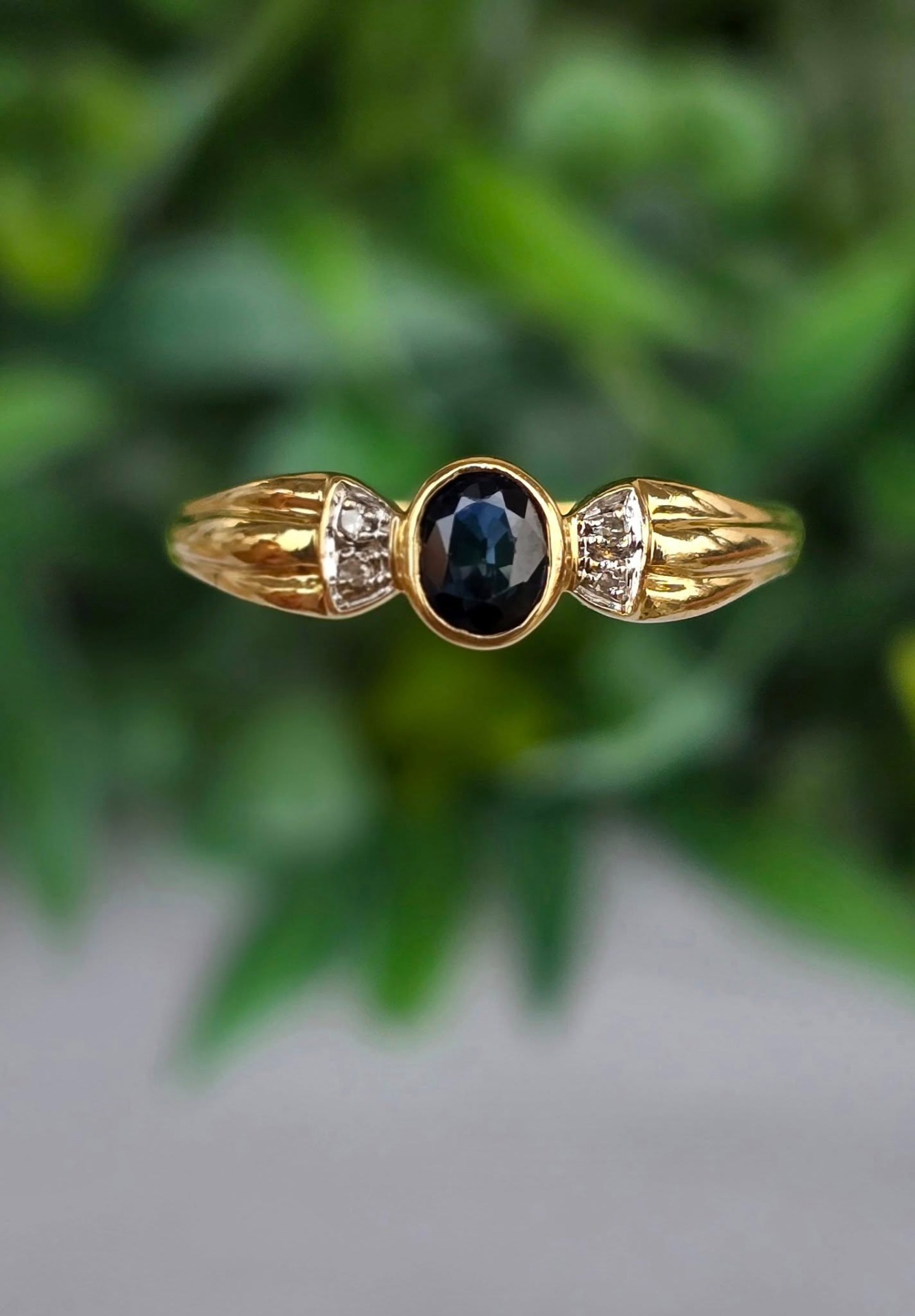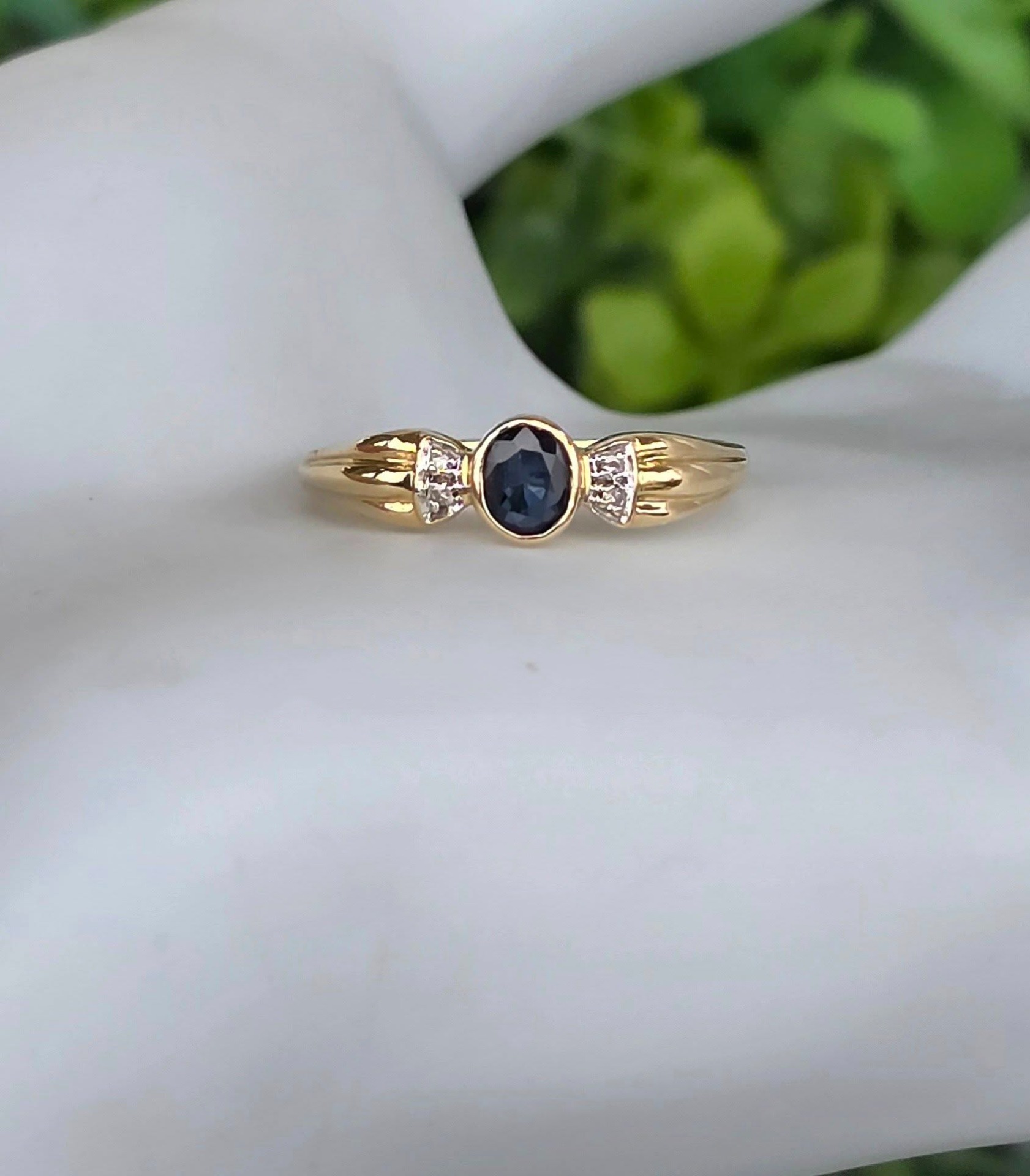 Inel vechi superb, din aur de 14K, cu safir și 4 diamante naturale.