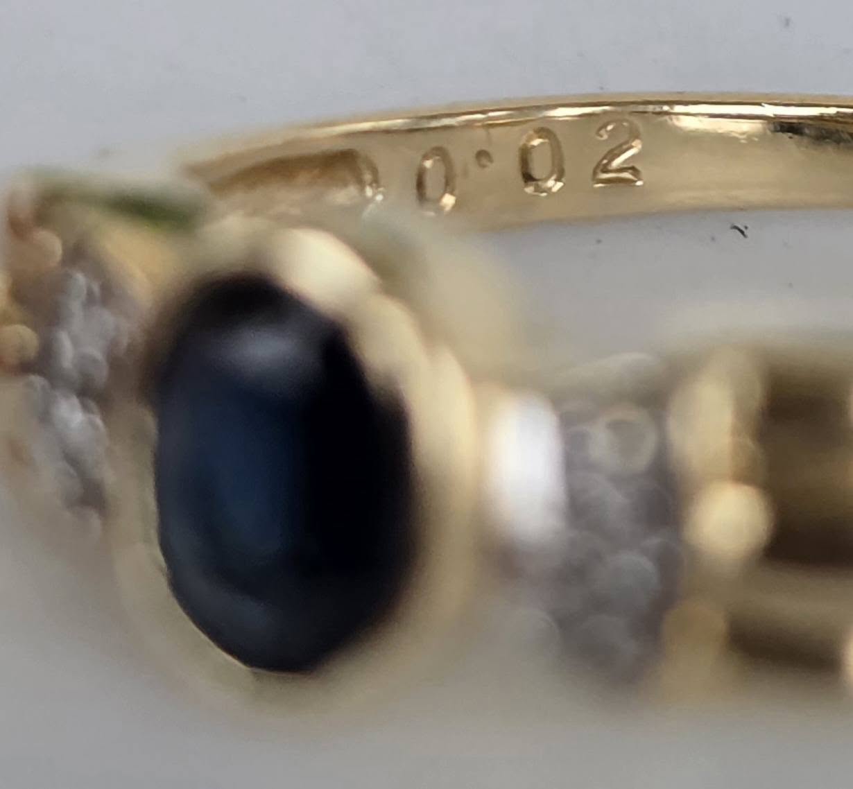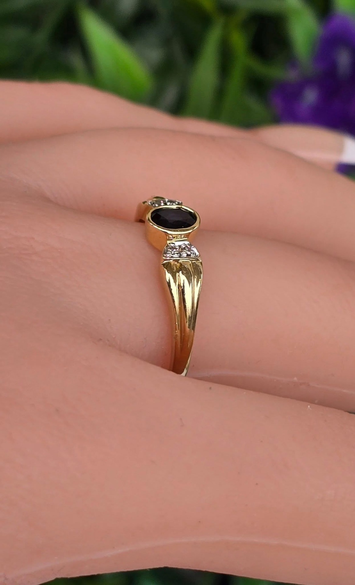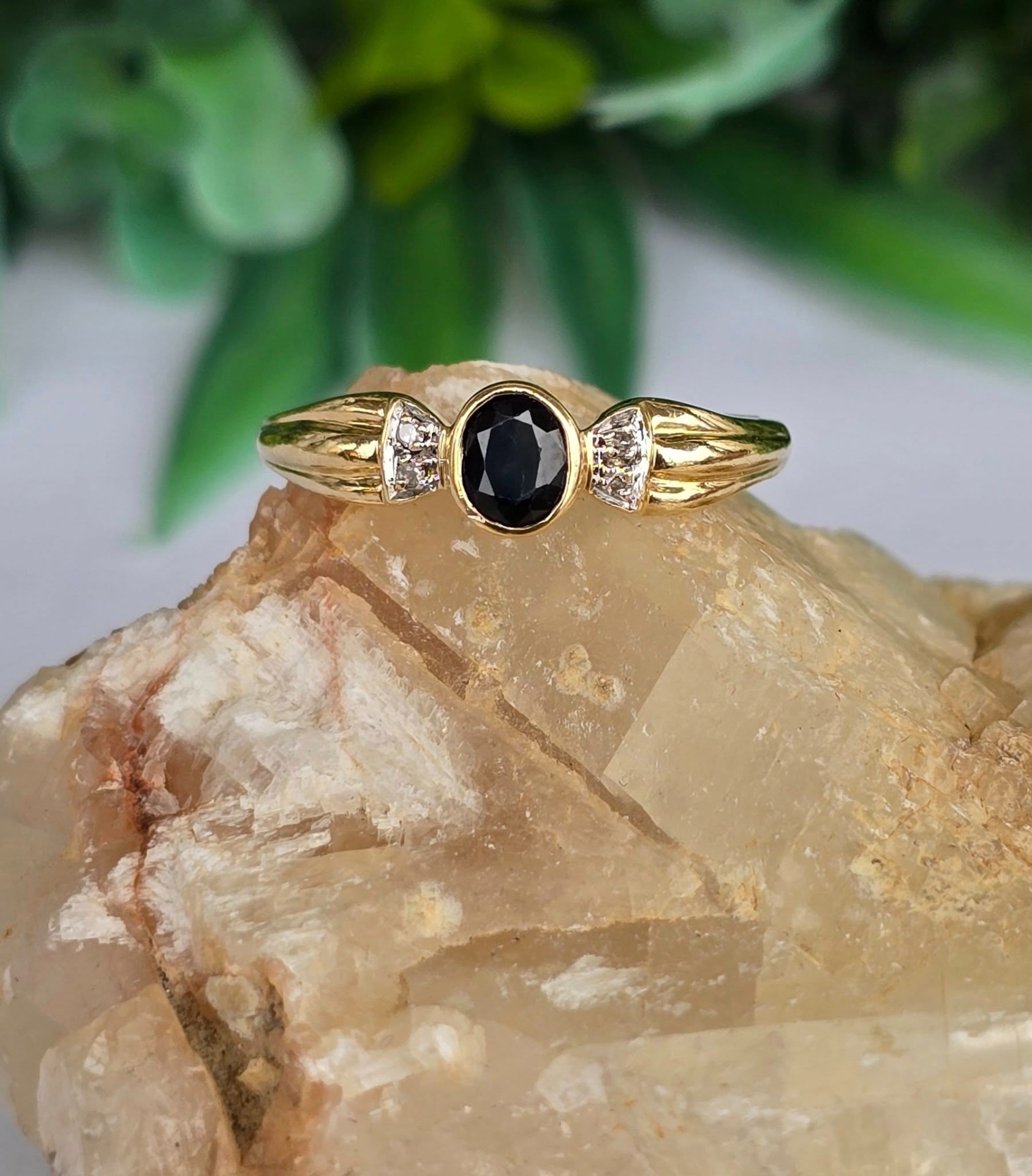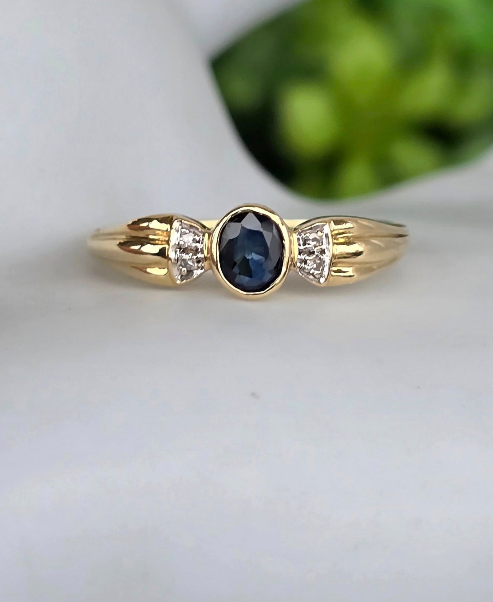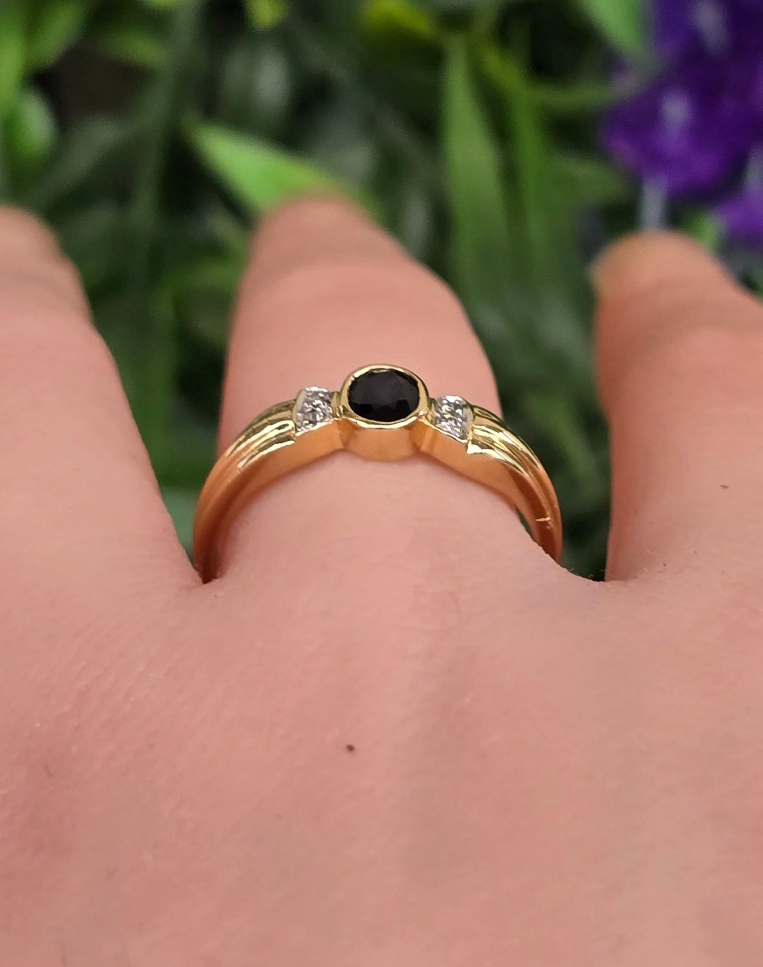Inel vechi superb, din aur de 14K, cu safir și 4 diamante naturale.