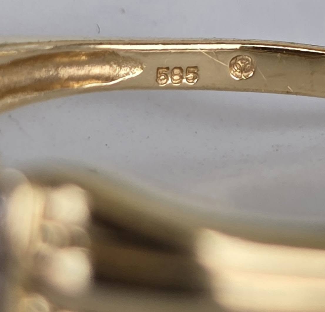 Prezintă marcaj 585 pentru puritate aur de 14K și marcaj "0.02" pentru caratajul diamantelor.