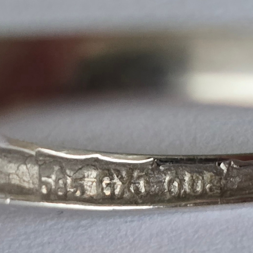 Prezintă marcaj 585 pentru puritate aur de 14K, marcaj "0.08" pentru caratajul diamantelor și marcaj de meșter.