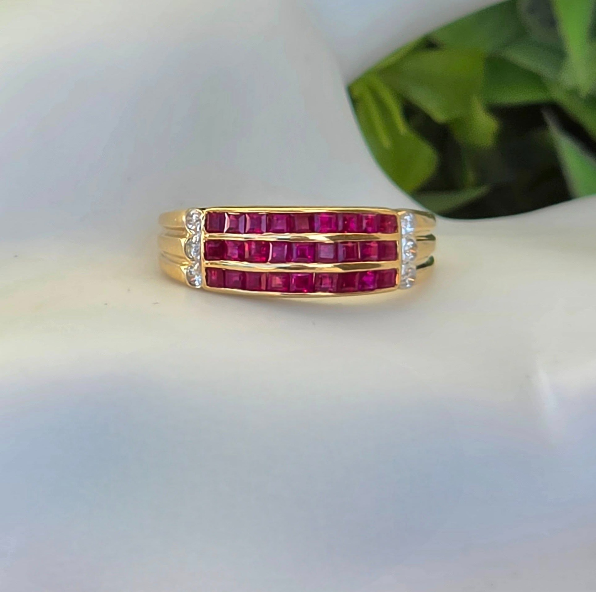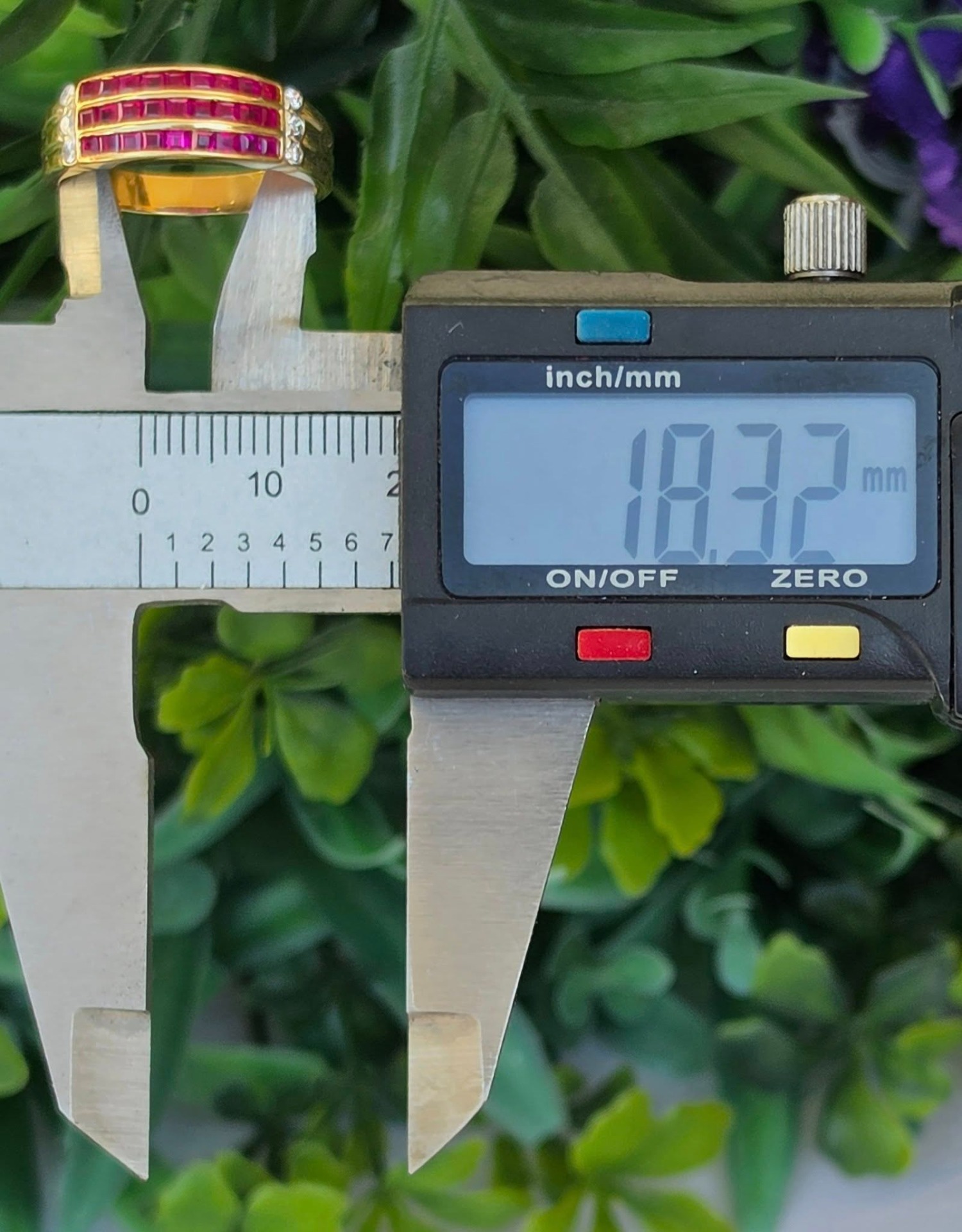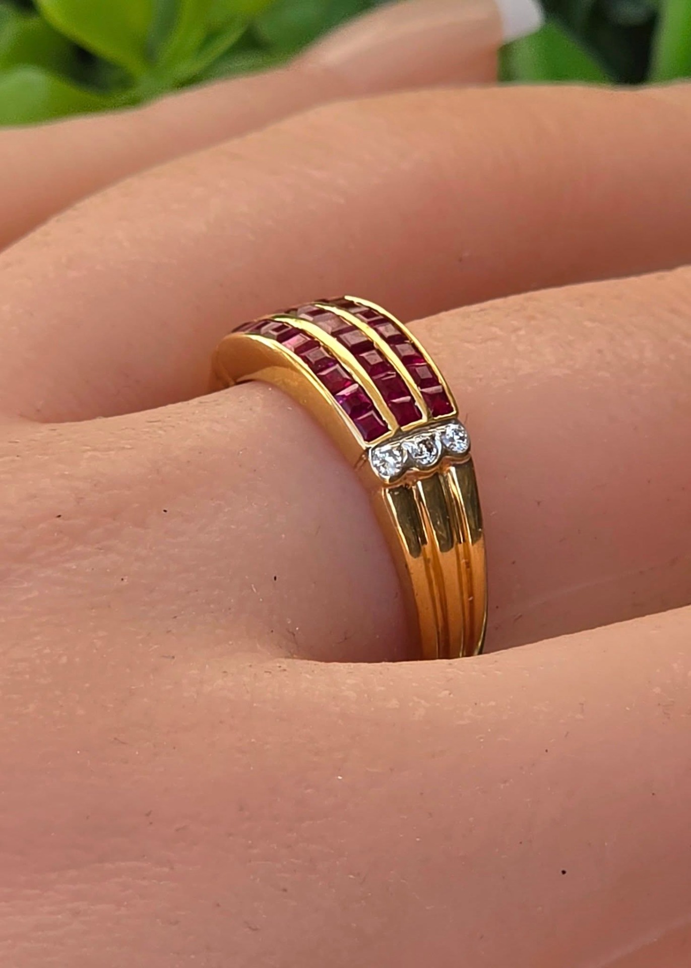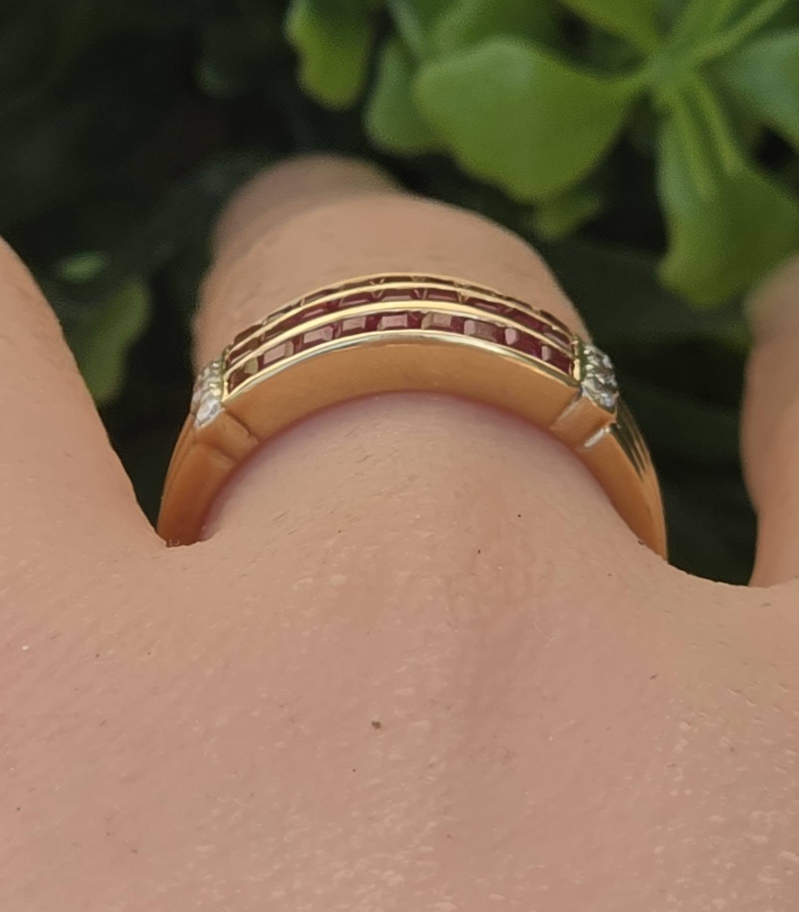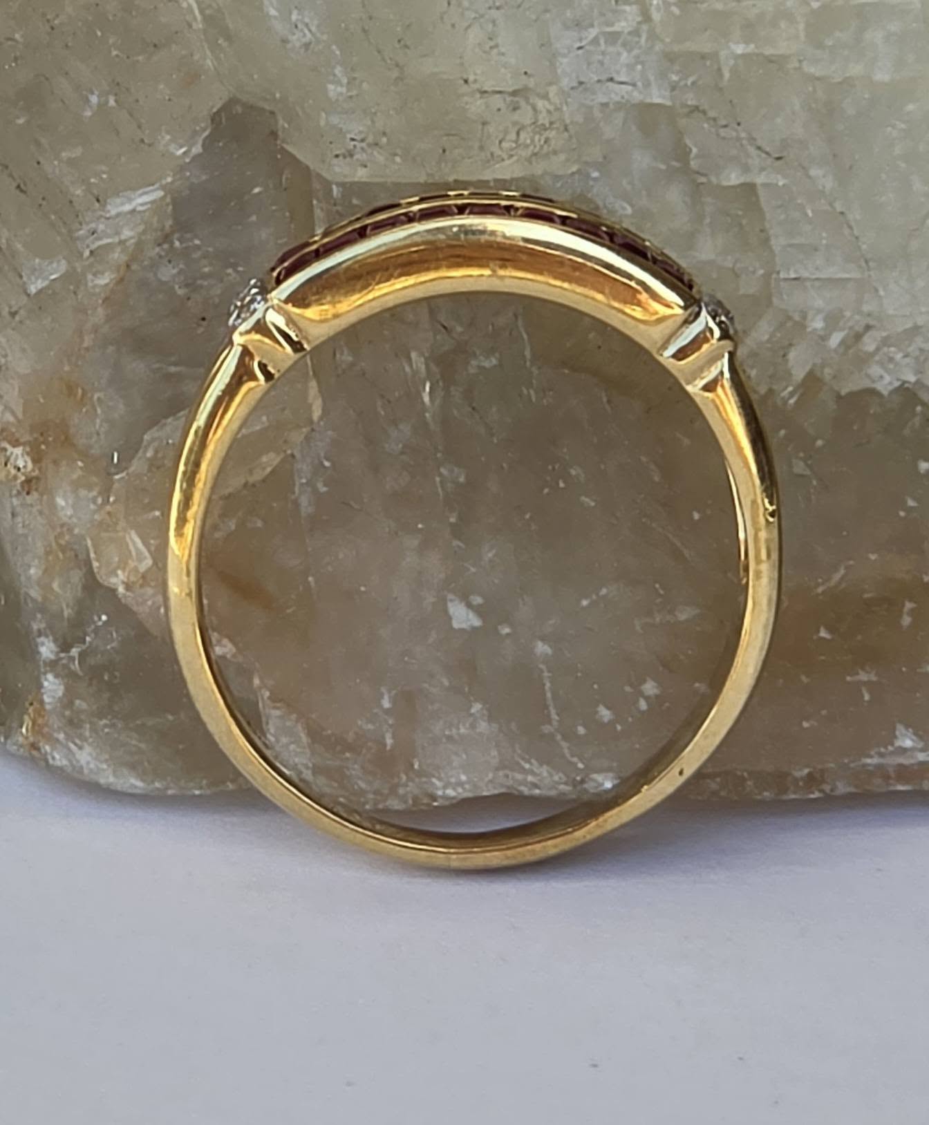 Inel vechi superb, din aur de 18K, cu 27 rubine și 6 diamante naturale, de calitate superioară.