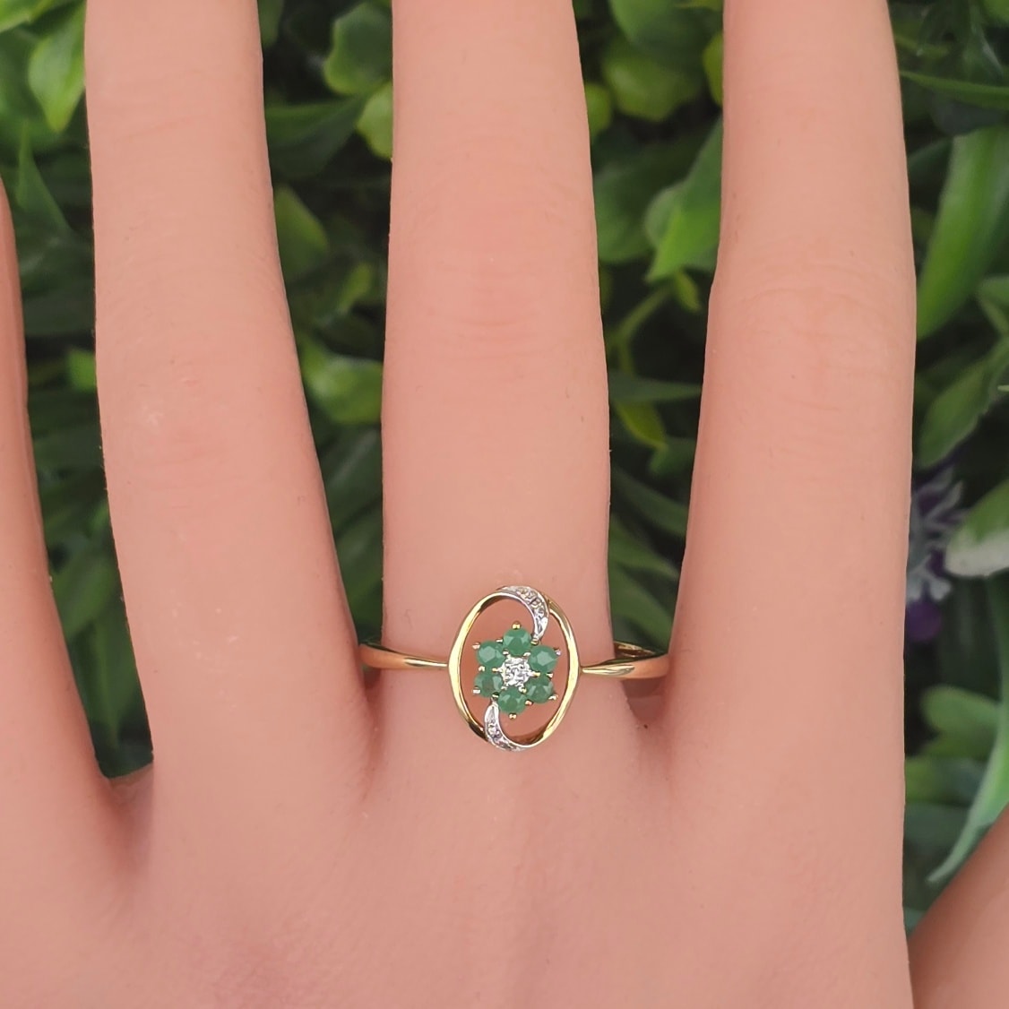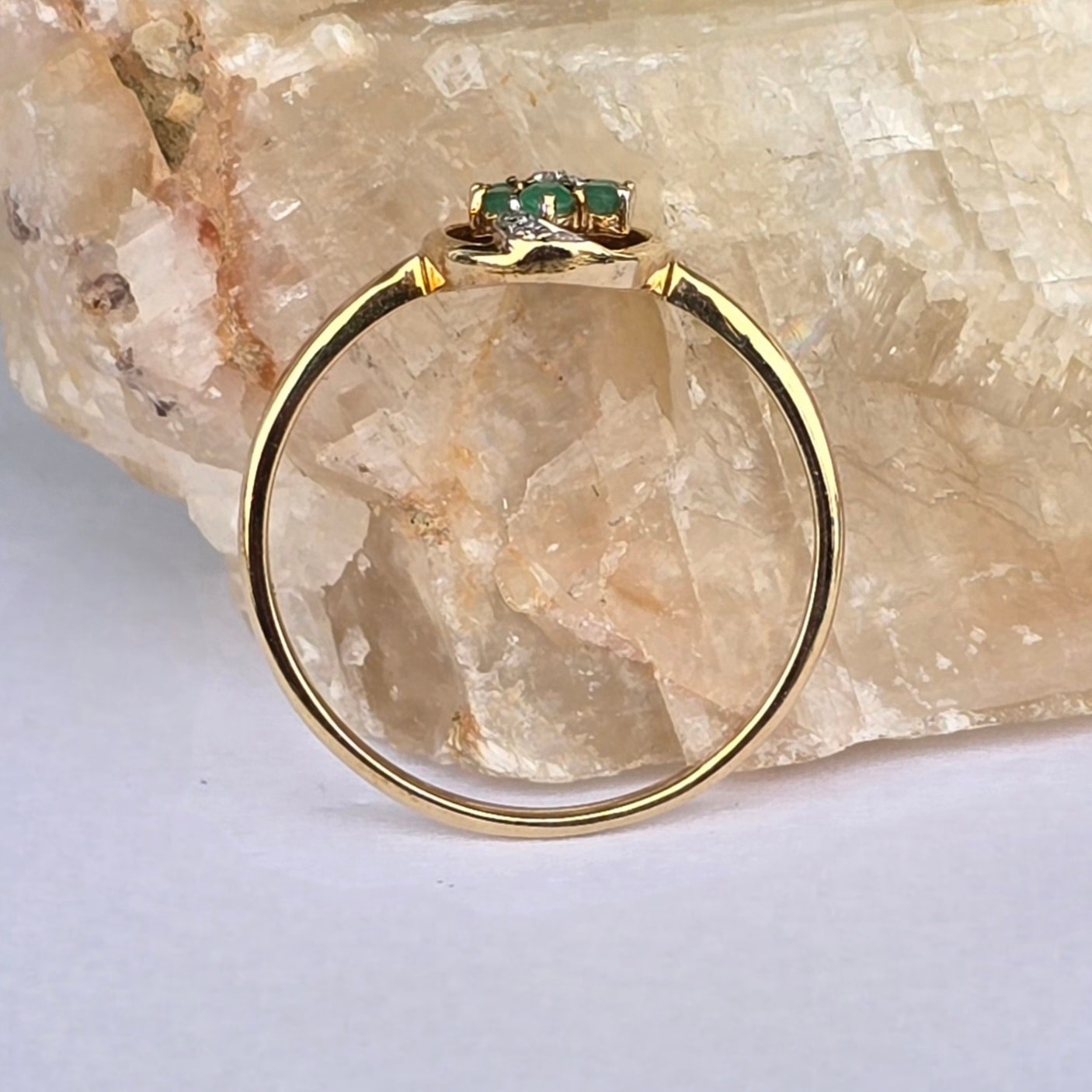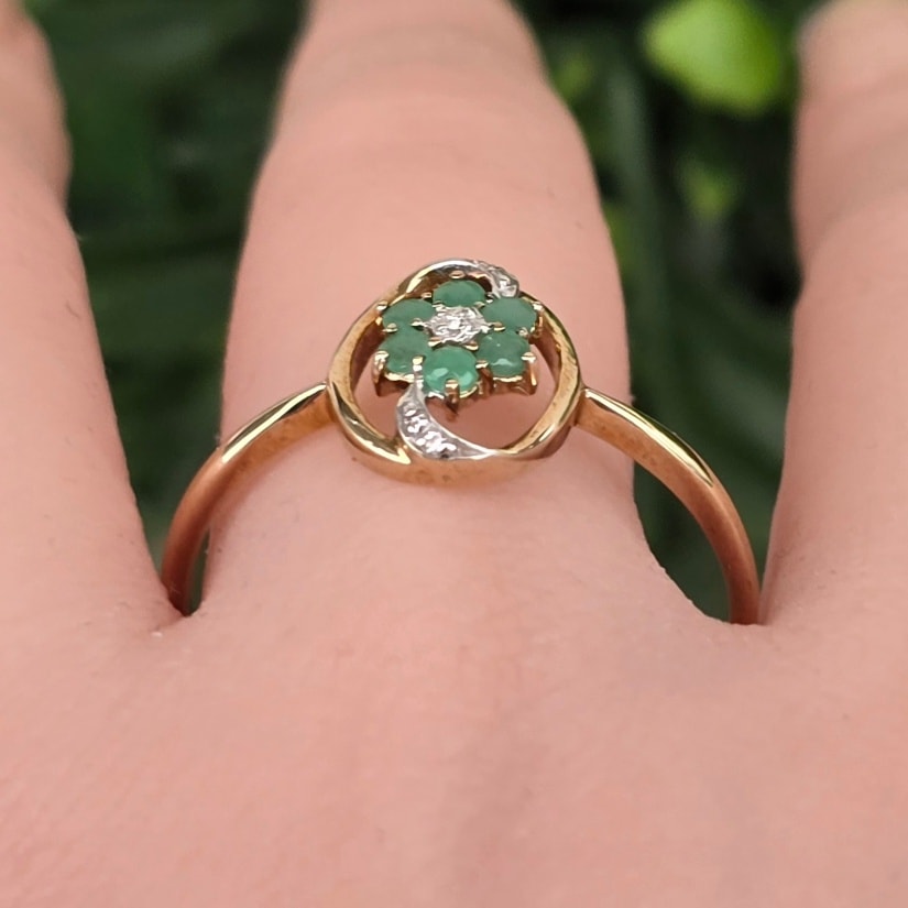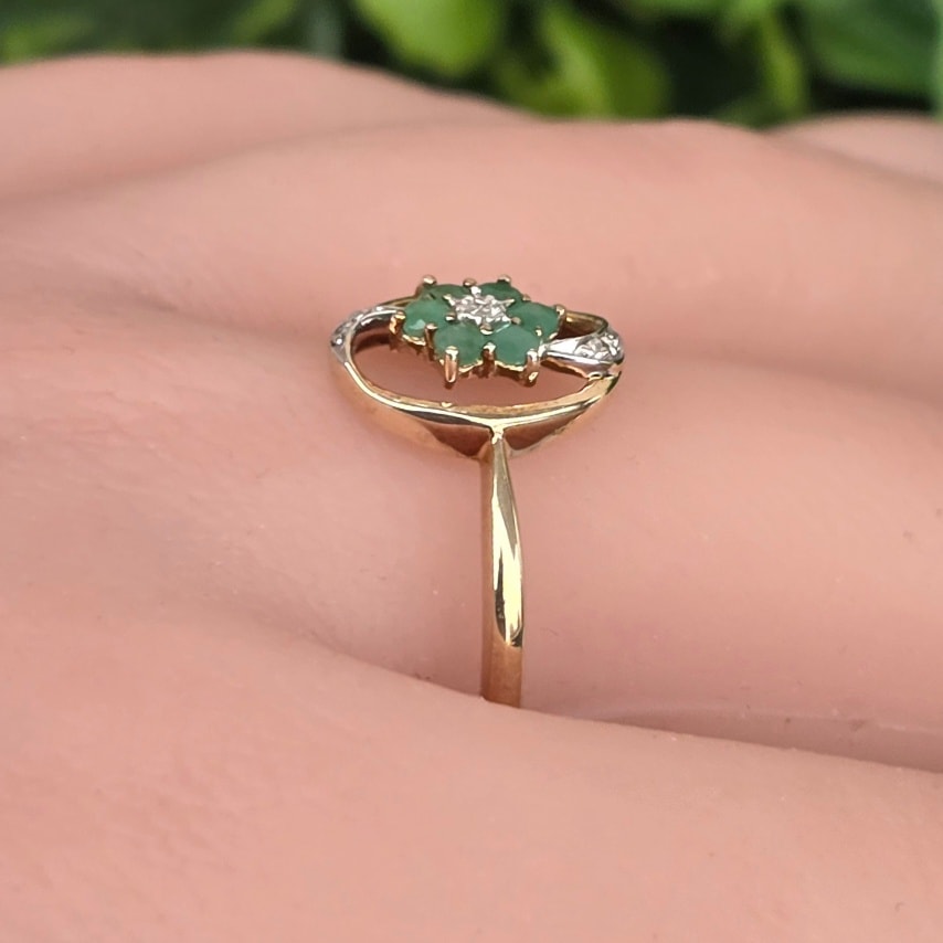 Inel vechi superb, din aur de 9K, cu 6 smaralde și 5 diamante naturale.