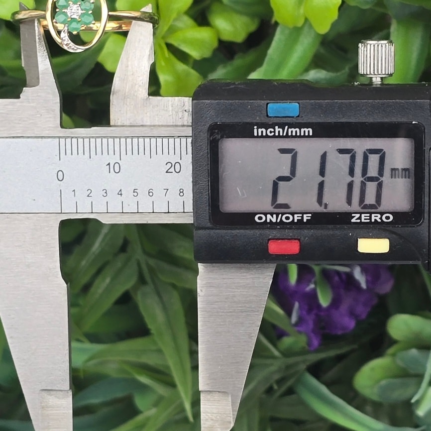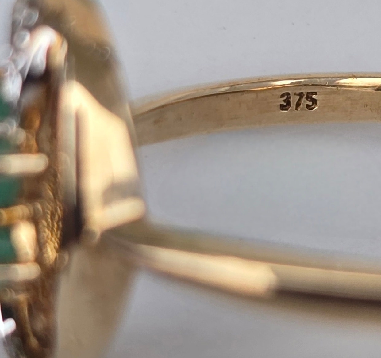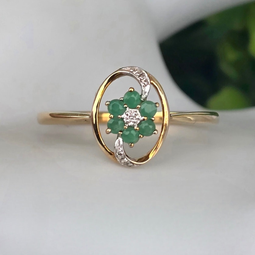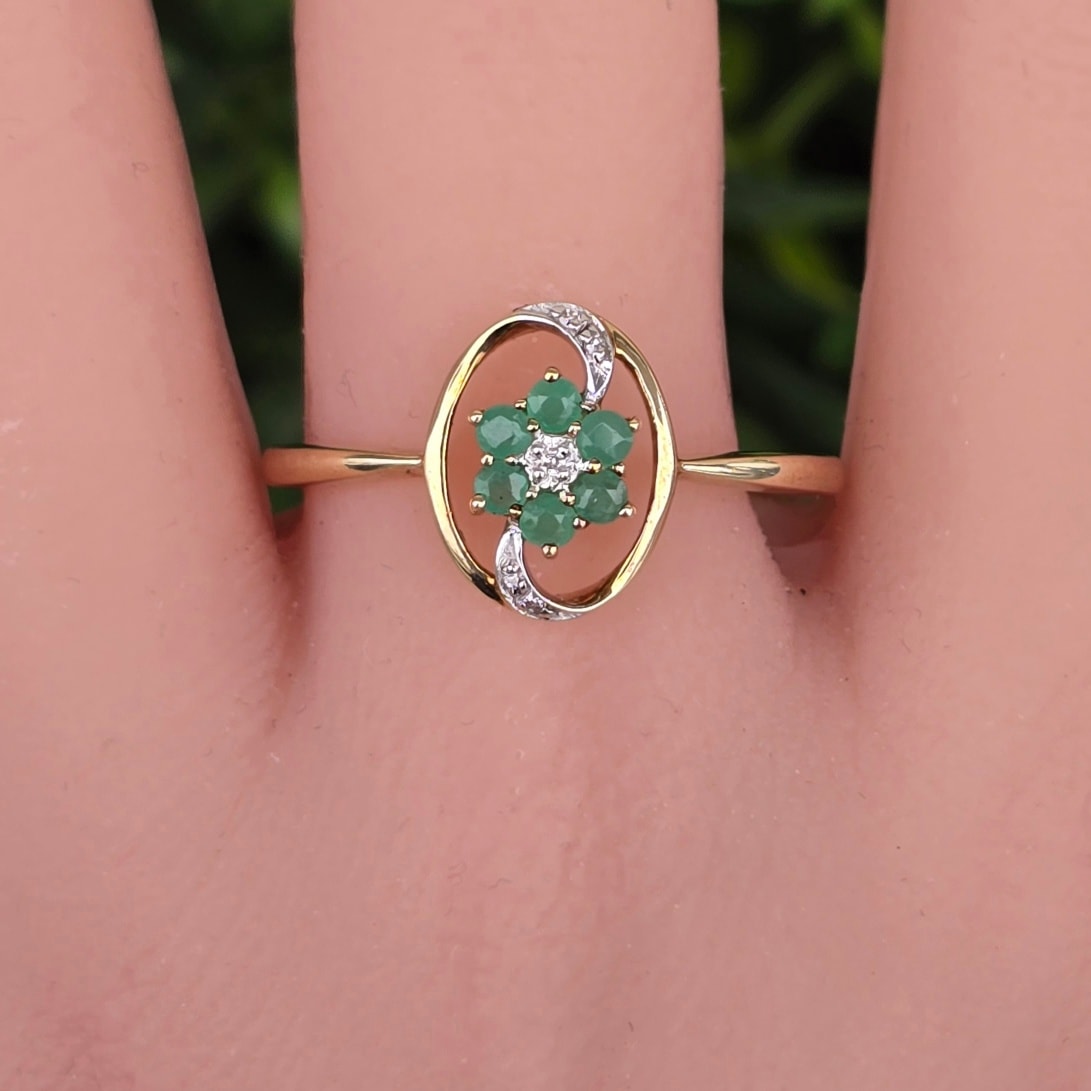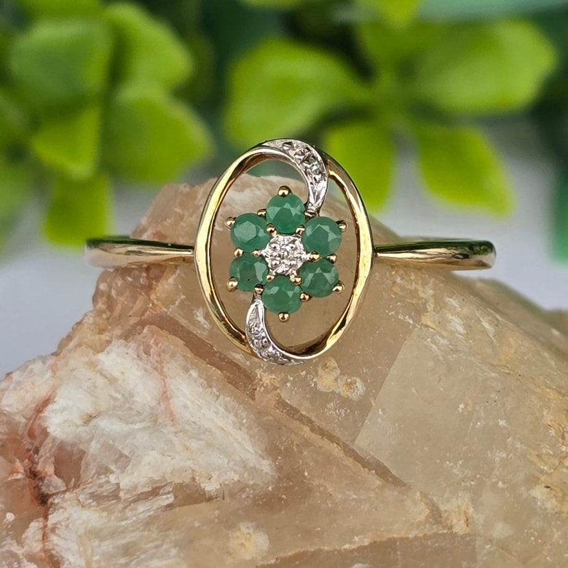 Inel vechi superb, din aur de 9K, cu 6 smaralde și 5 diamante naturale.