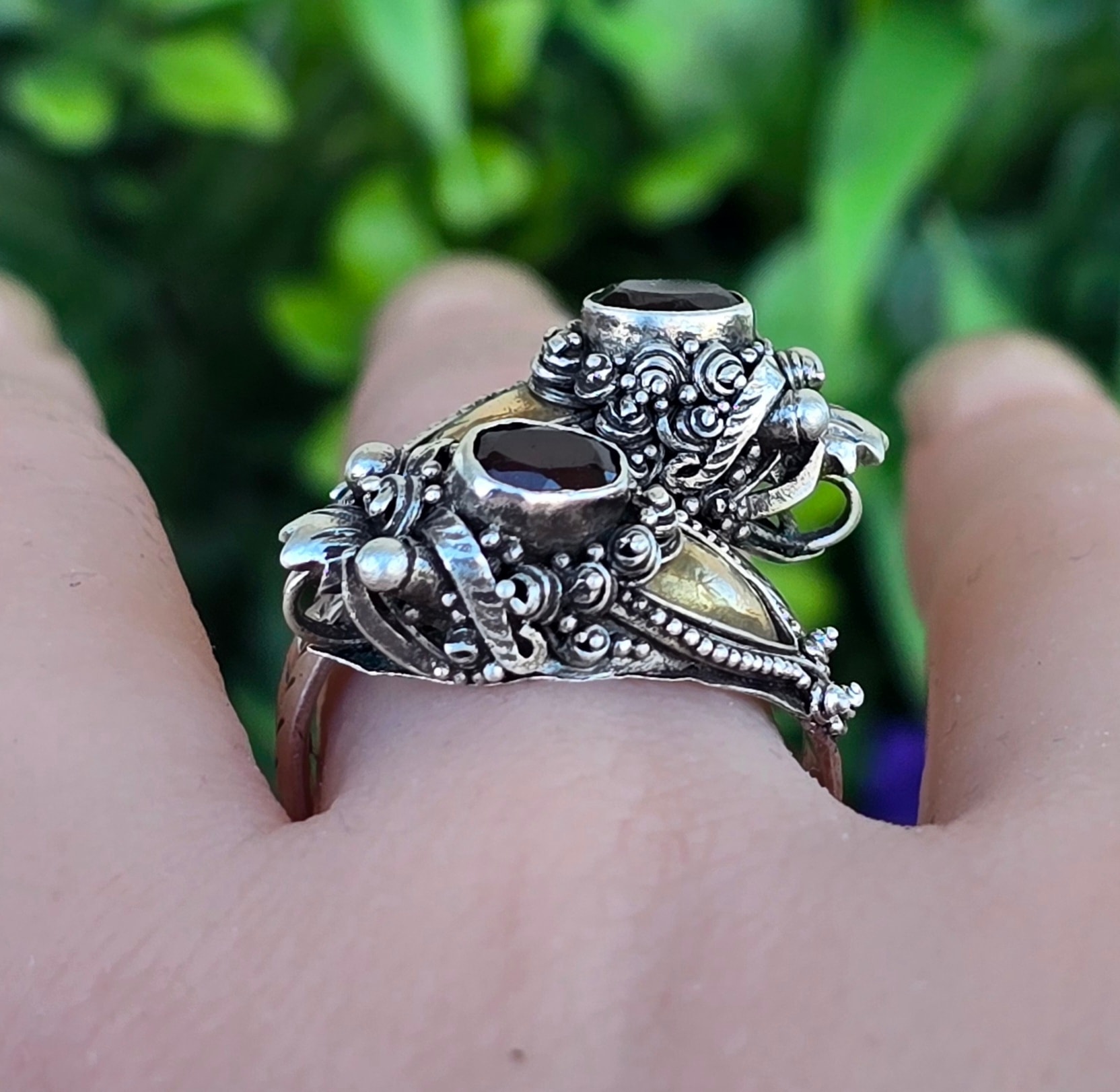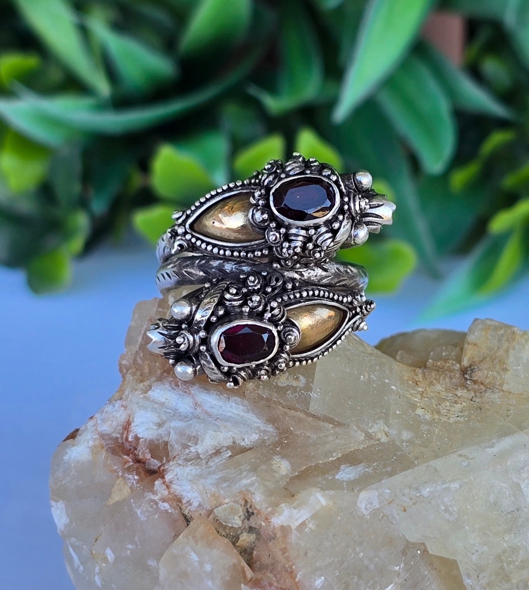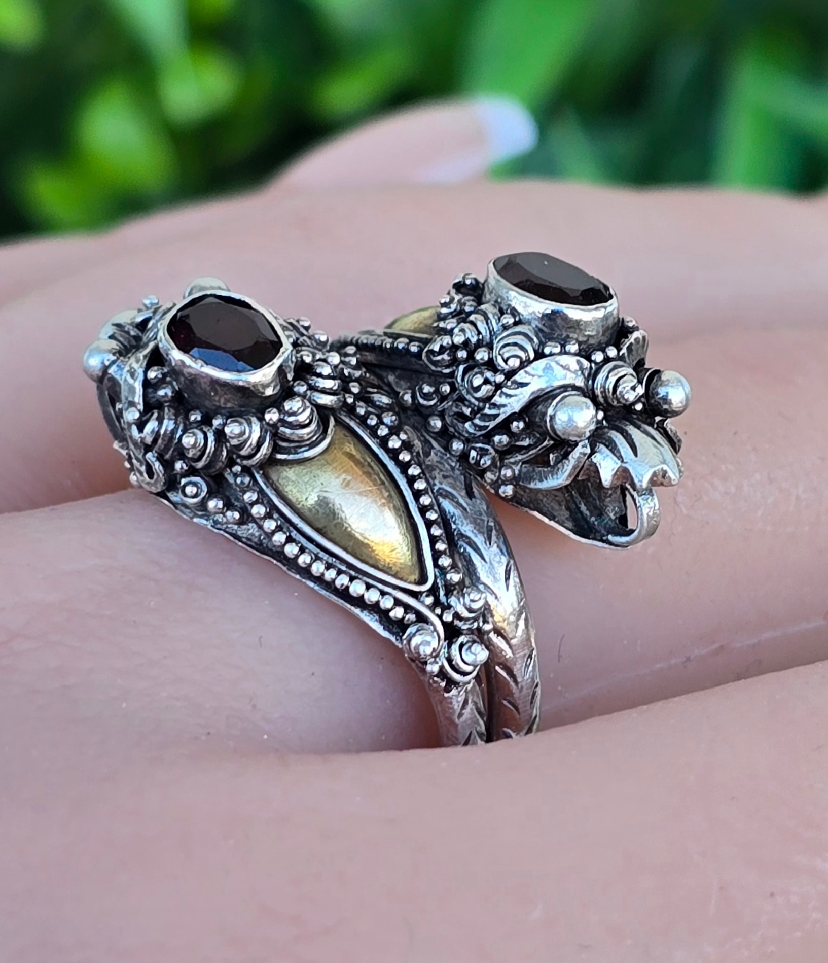 Inel vechi tradițional balinez, de colecție, din argint și elemente din aur, cu granate naturale, stilizat cu dragoni, manufactură complexă (anii 1960-1970, Bali, Indonezia).