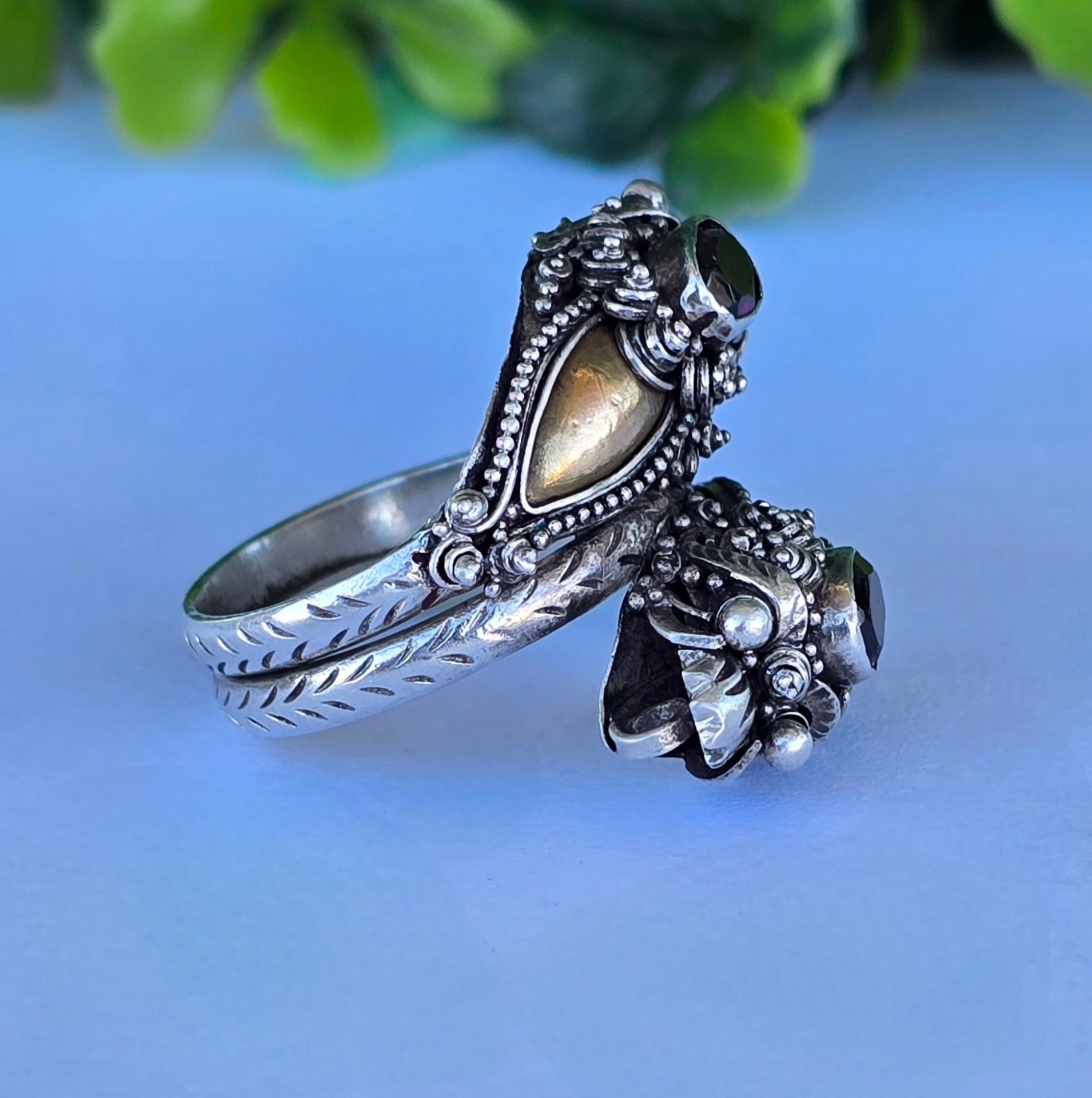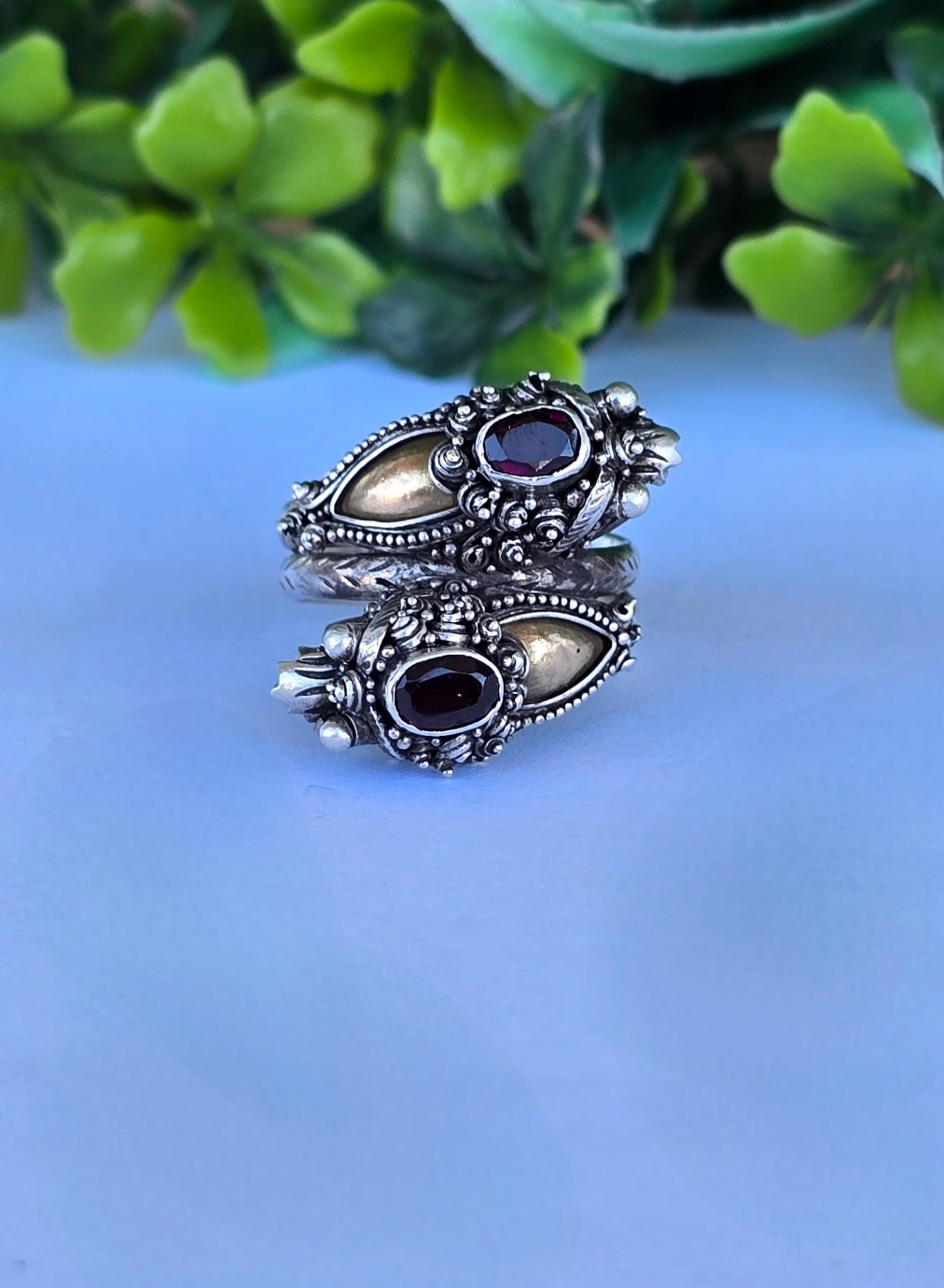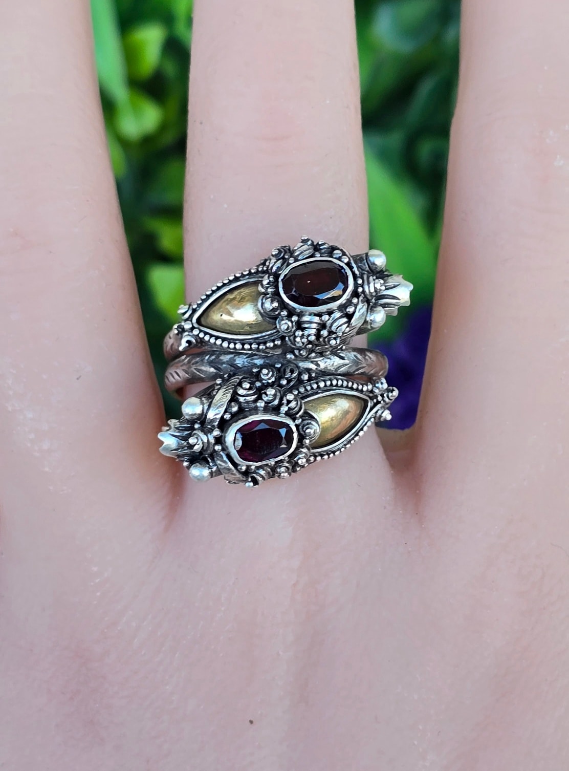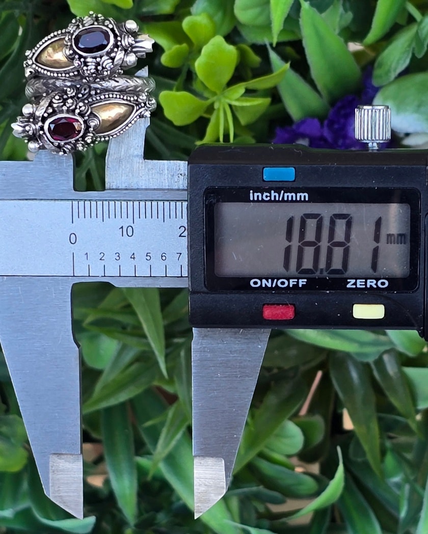 Inel vechi tradițional balinez, de colecție, din argint și elemente din aur, cu granate naturale, stilizat cu dragoni, manufactură complexă (anii 1960-1970, Bali, Indonezia).