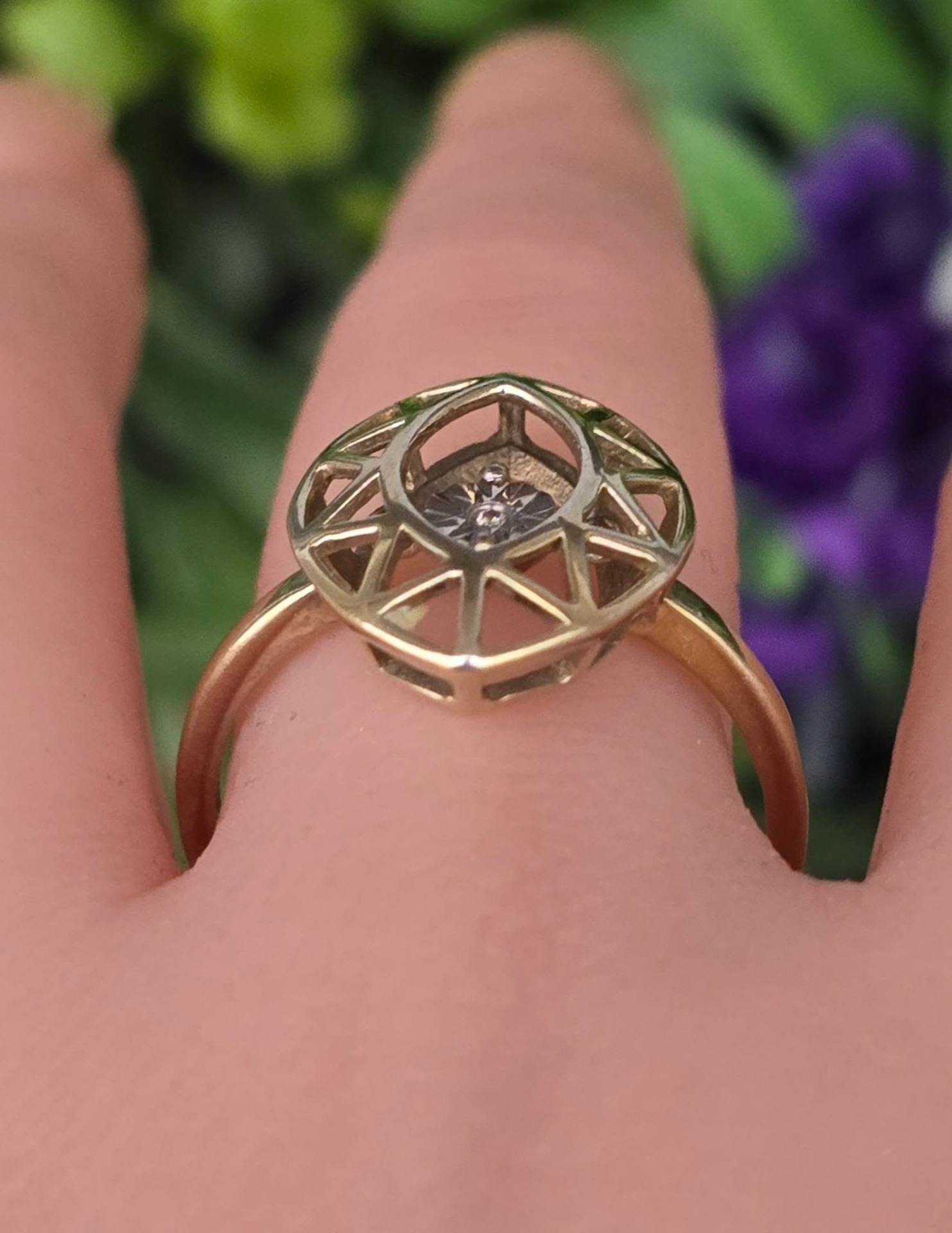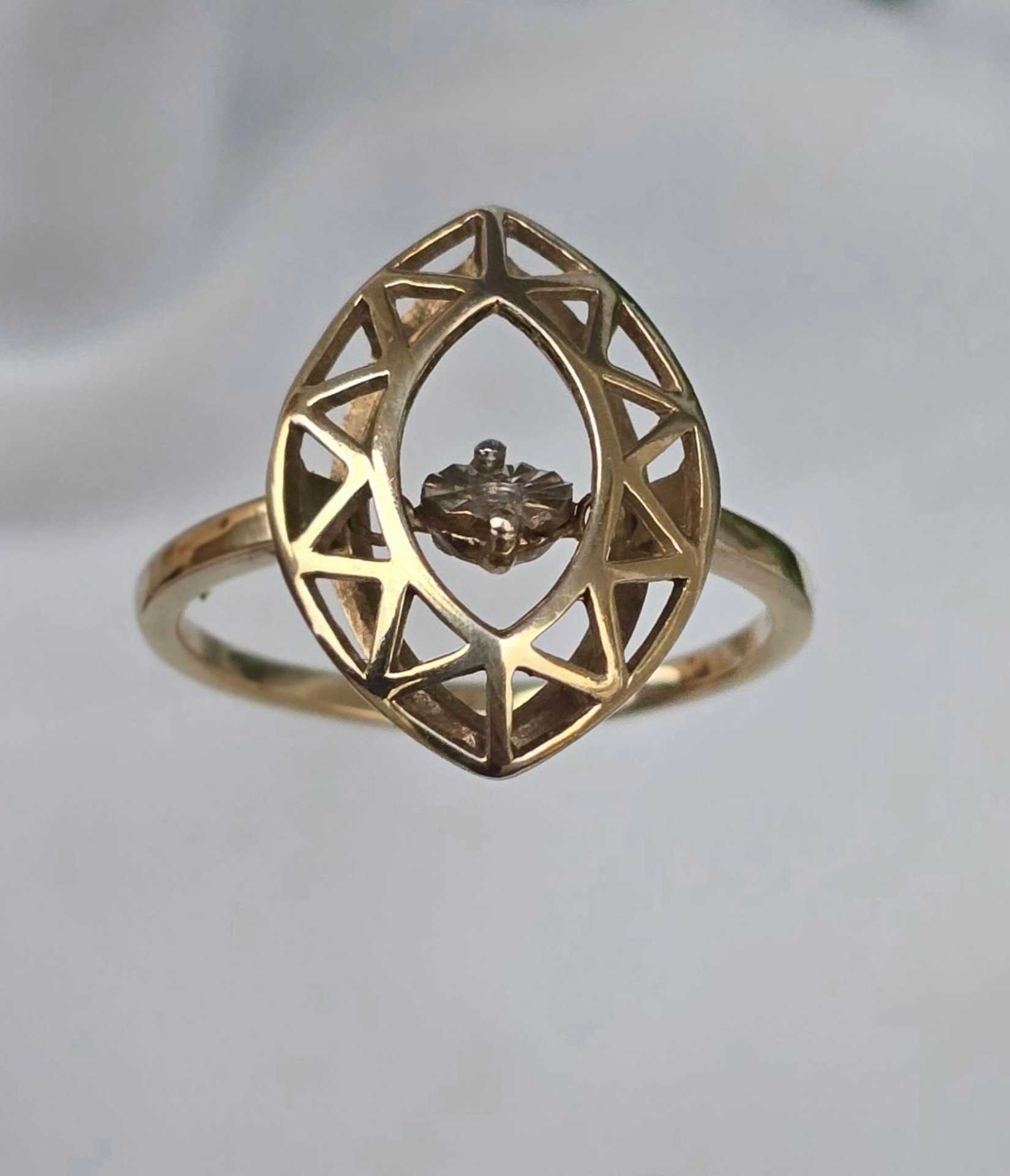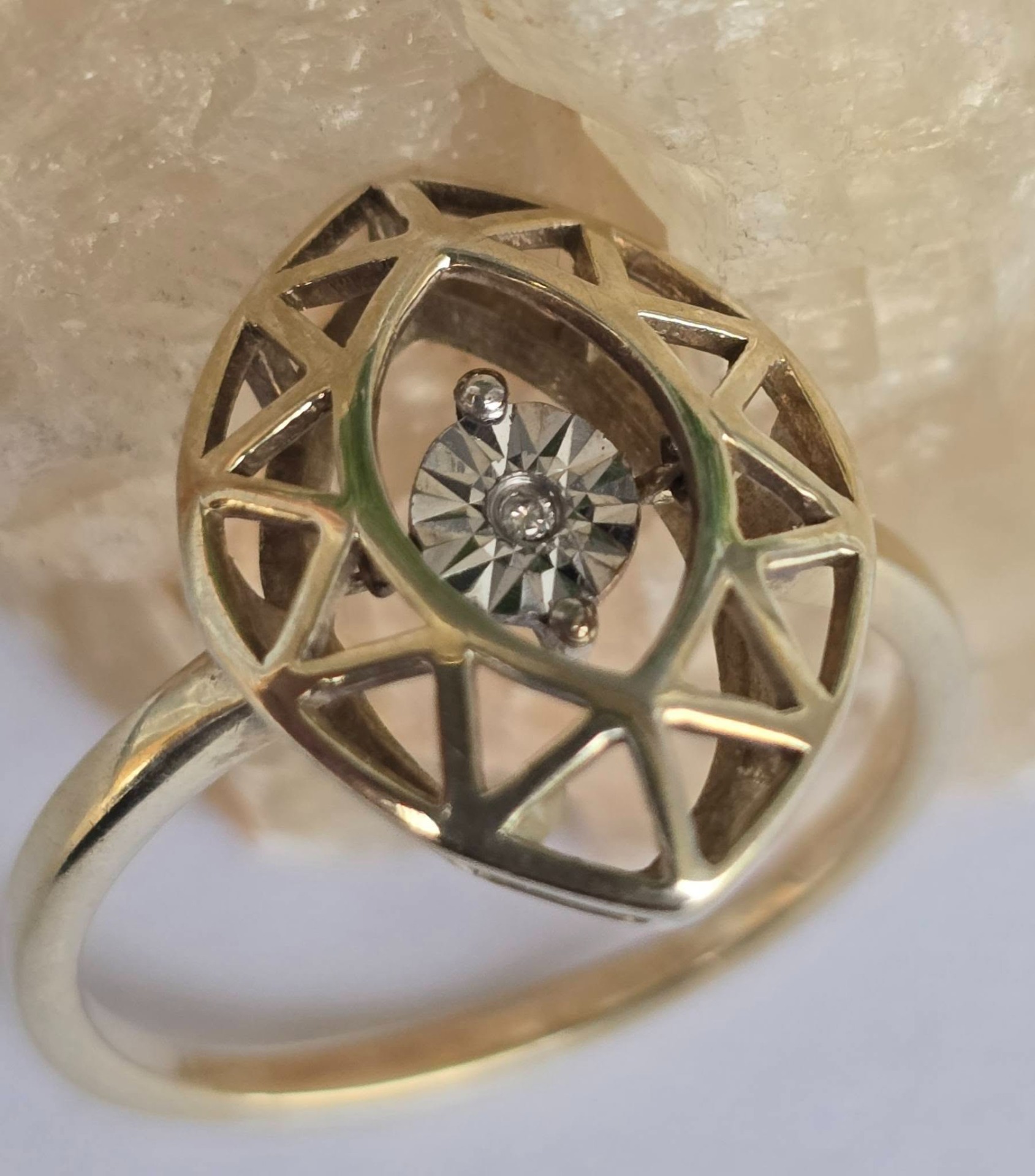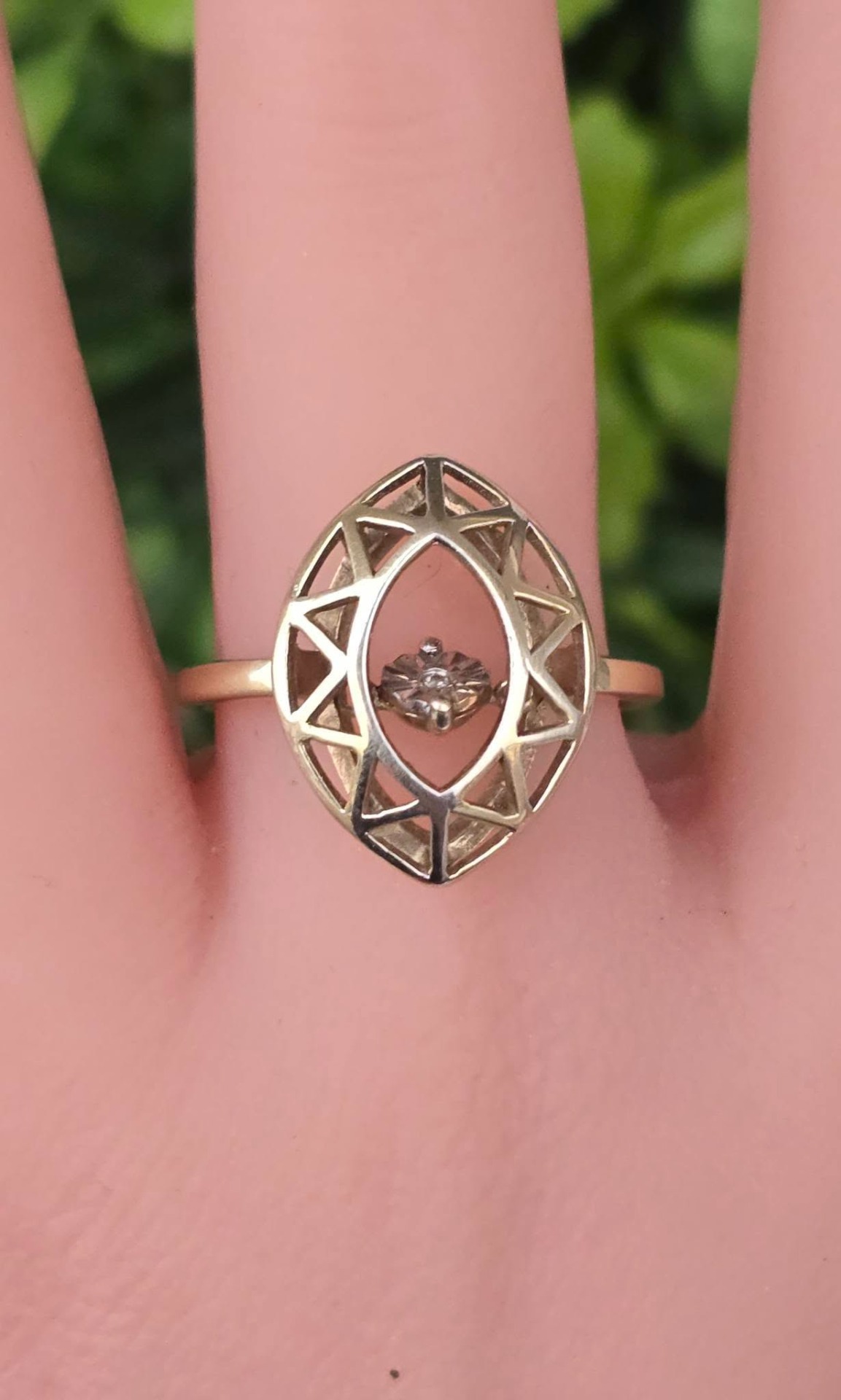 Inel vintage deosebit, din argint aurit, cu diamant natural "illusion setting", montat într-un mecanism kinetic care folosește forța gravitațională pentru a