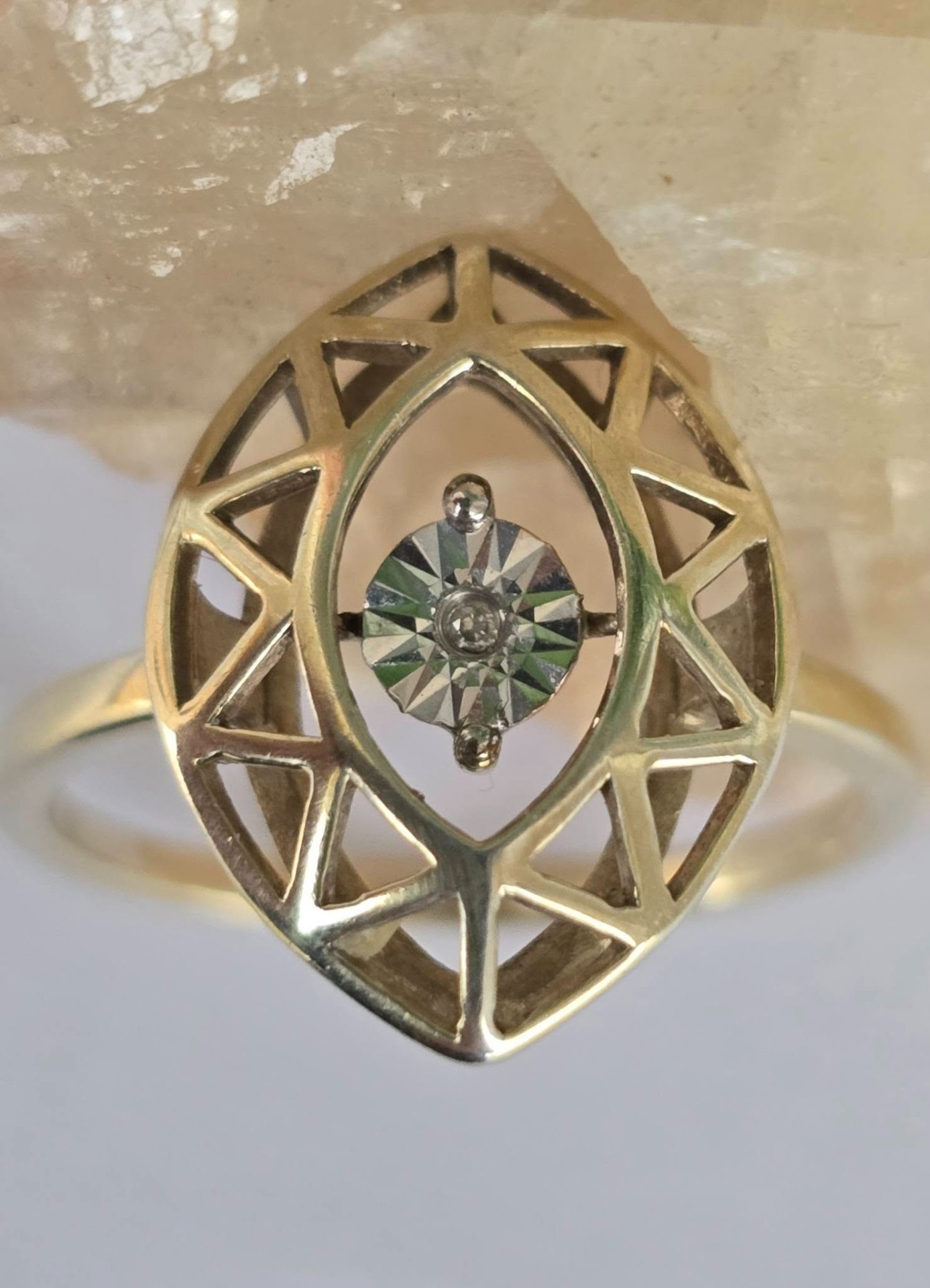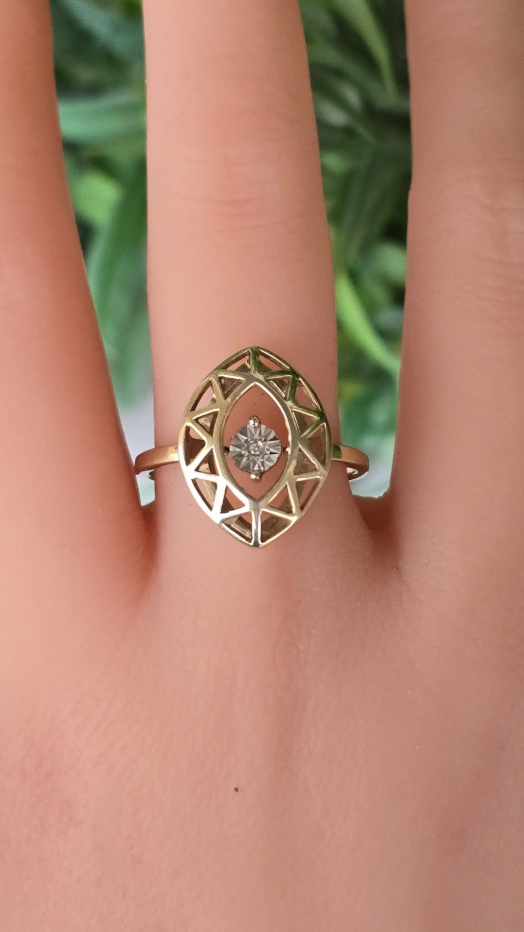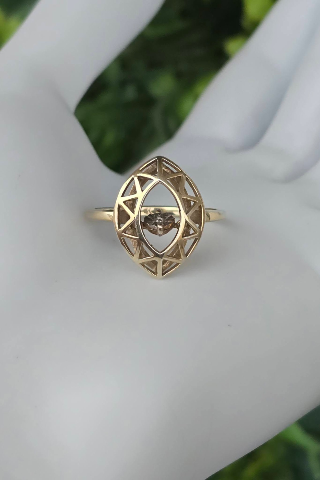 Inel vintage deosebit, din argint aurit, cu diamant natural "illusion setting", montat într-un mecanism kinetic care folosește forța gravitațională pentru a
