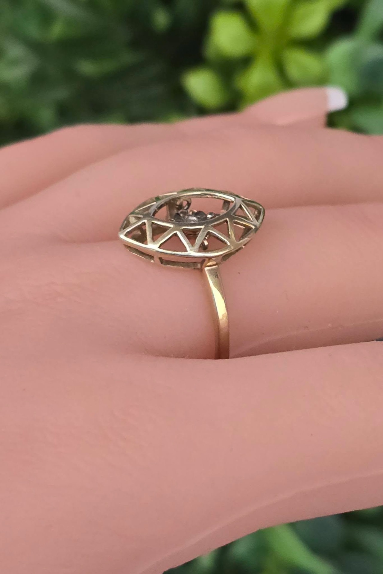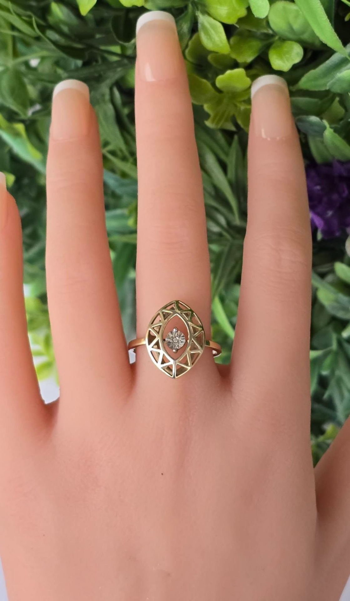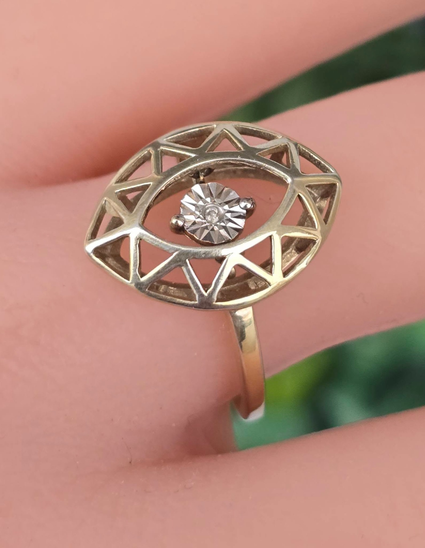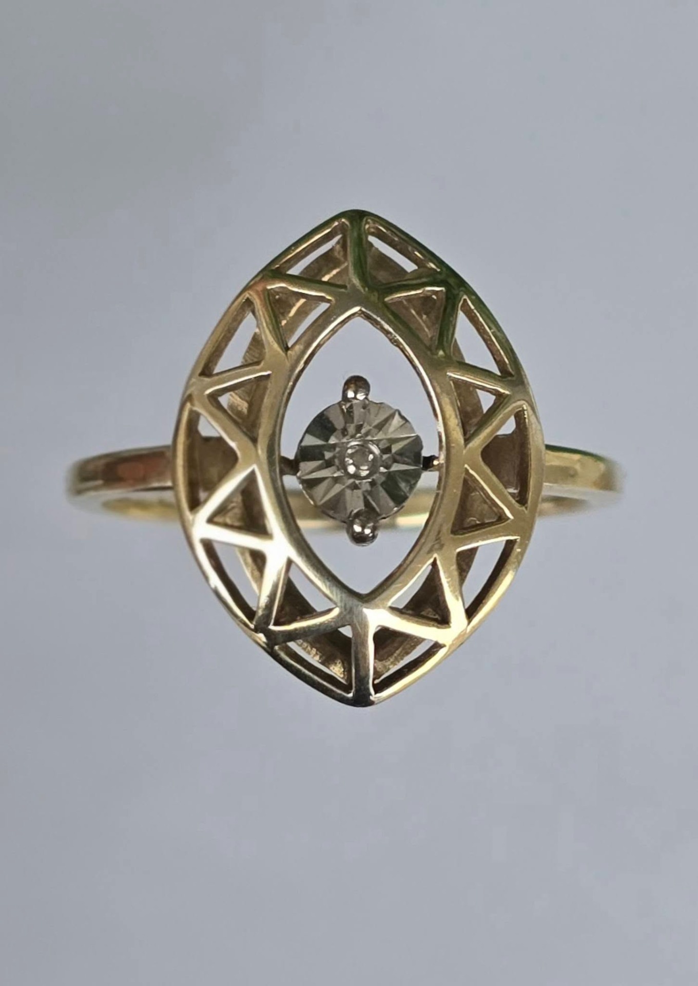 Inel vintage deosebit, din argint aurit, cu diamant natural "illusion setting", montat într-un mecanism kinetic care folosește forța gravitațională pentru a