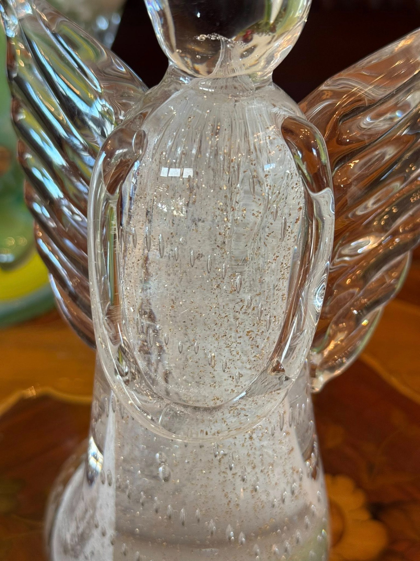 Îngeraș delicat din sticlă în stil Murano cu foiță aurie creând acel efect de „praf de stele”.