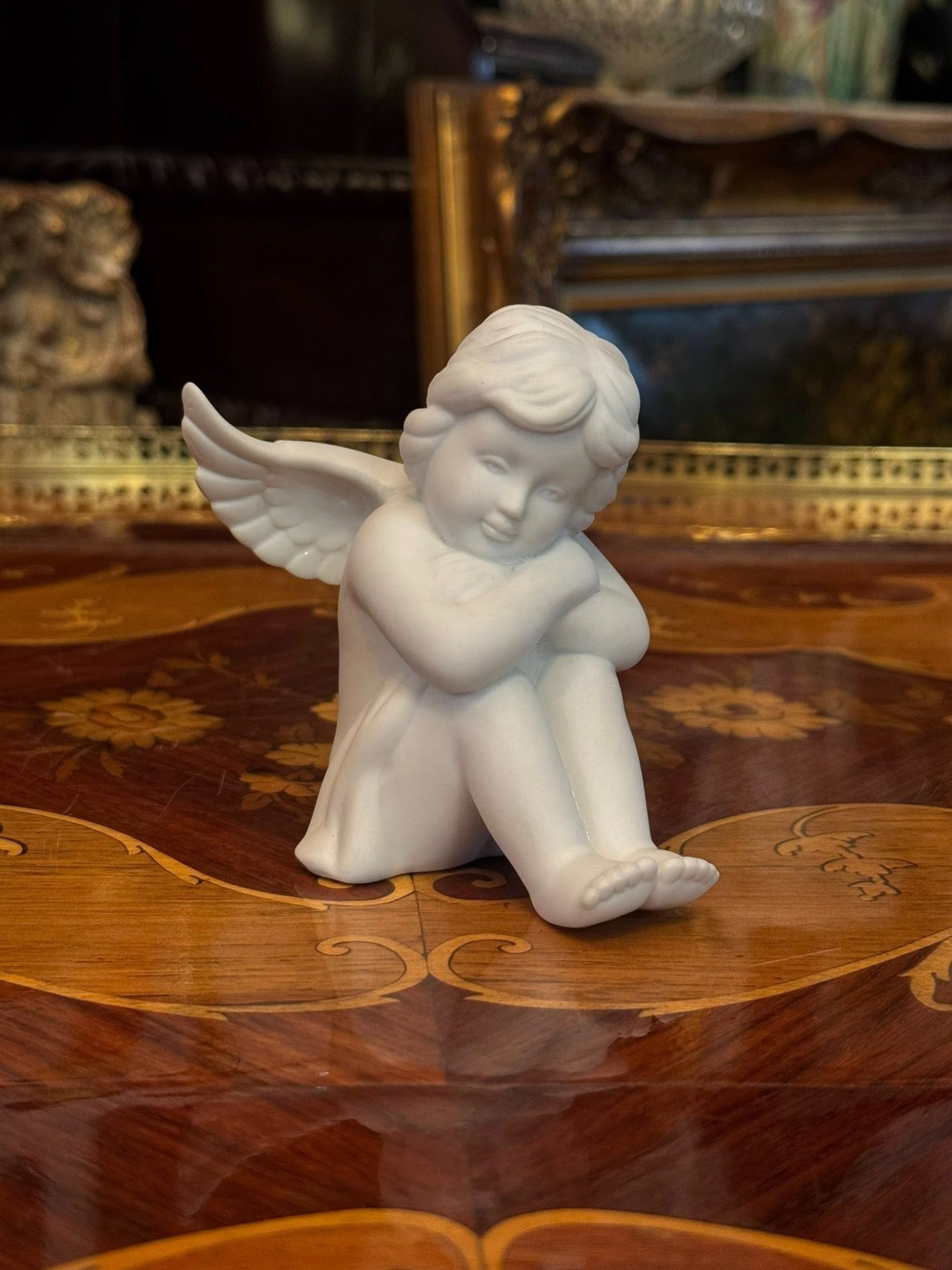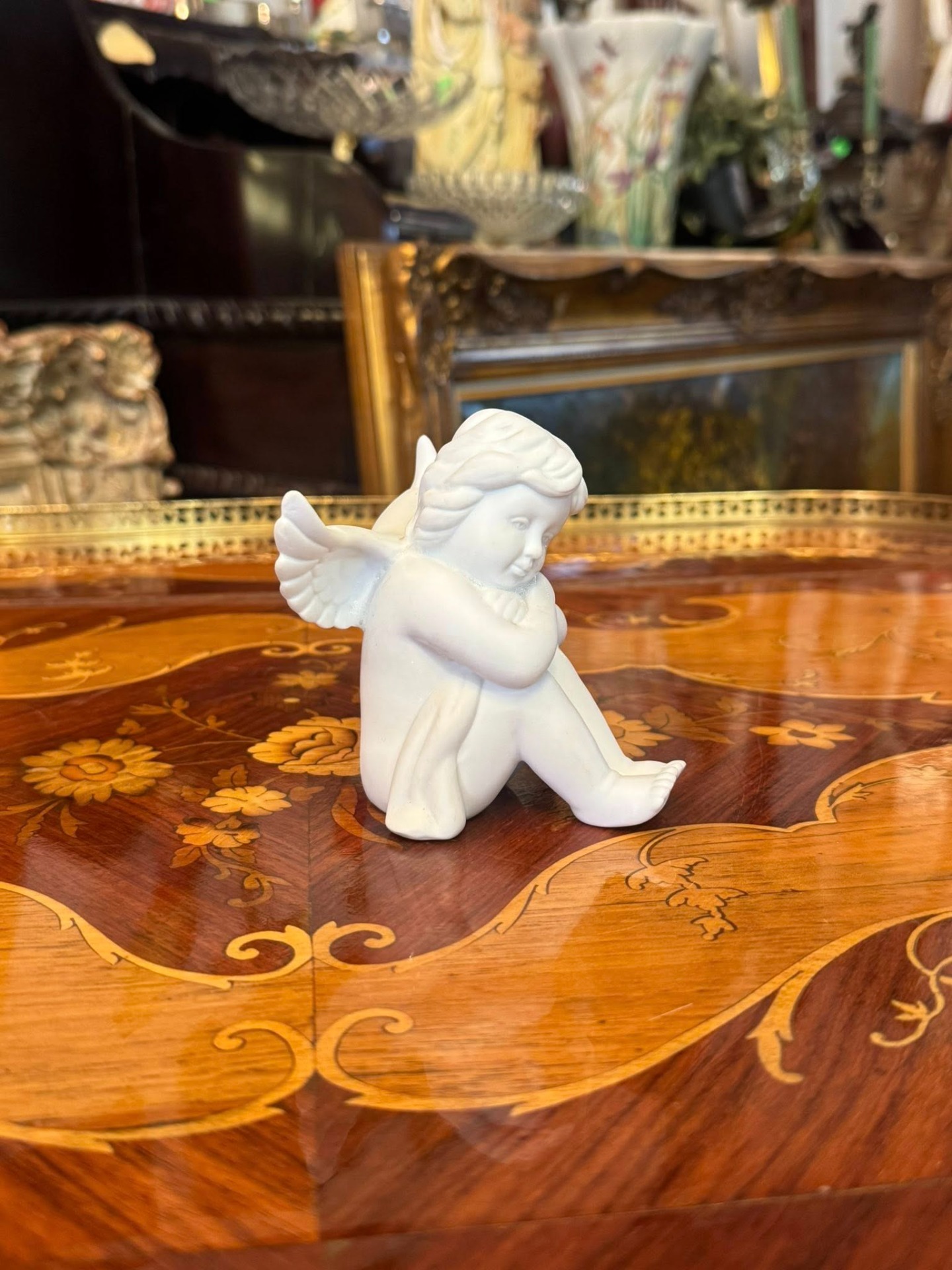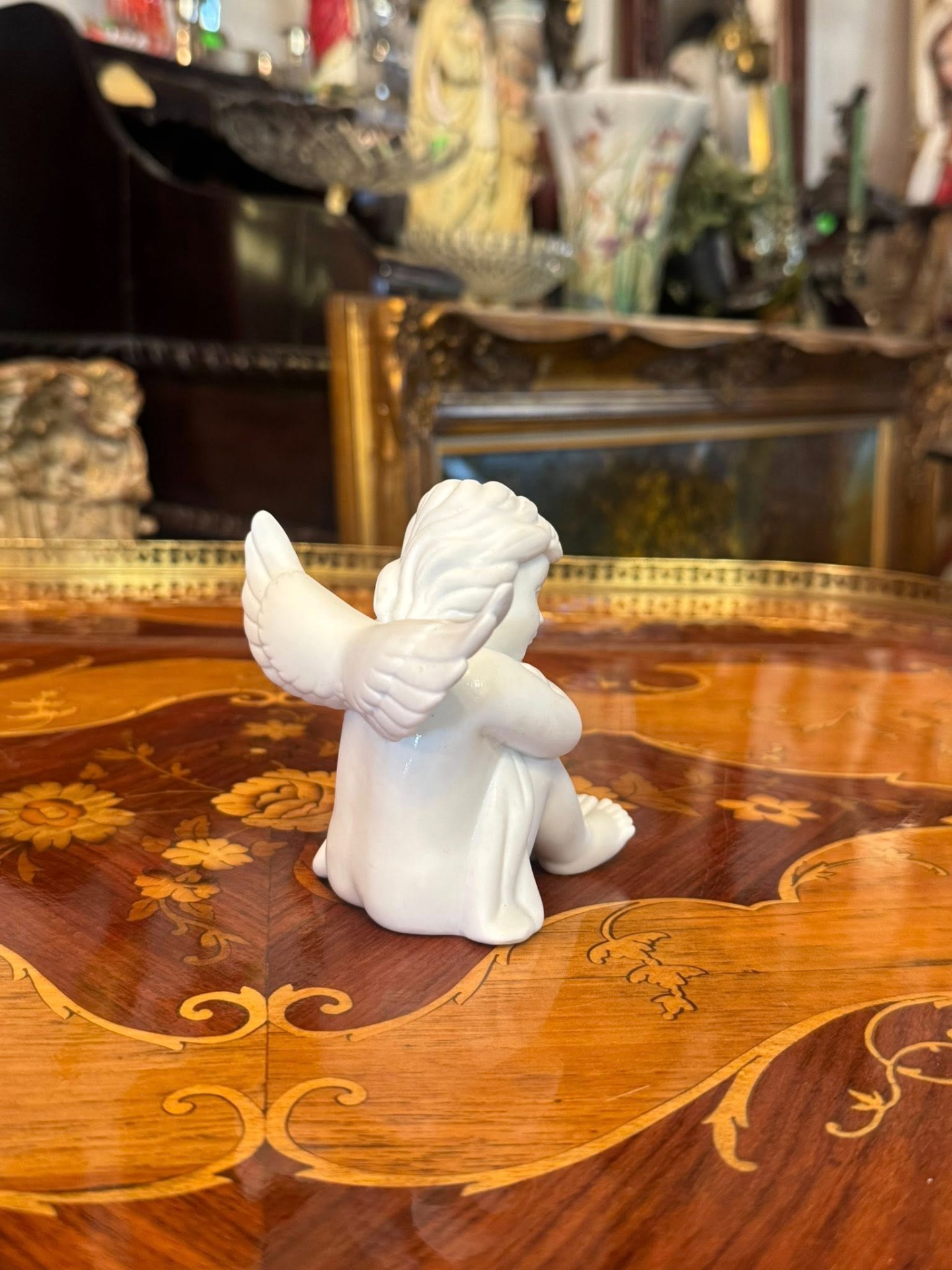 Îngeraș din porțelan alb, mat (biscuit), reprezentând un îngeraș (sau putto) într-o poziție visătoare, realizată de producătorul german Rosenthal.