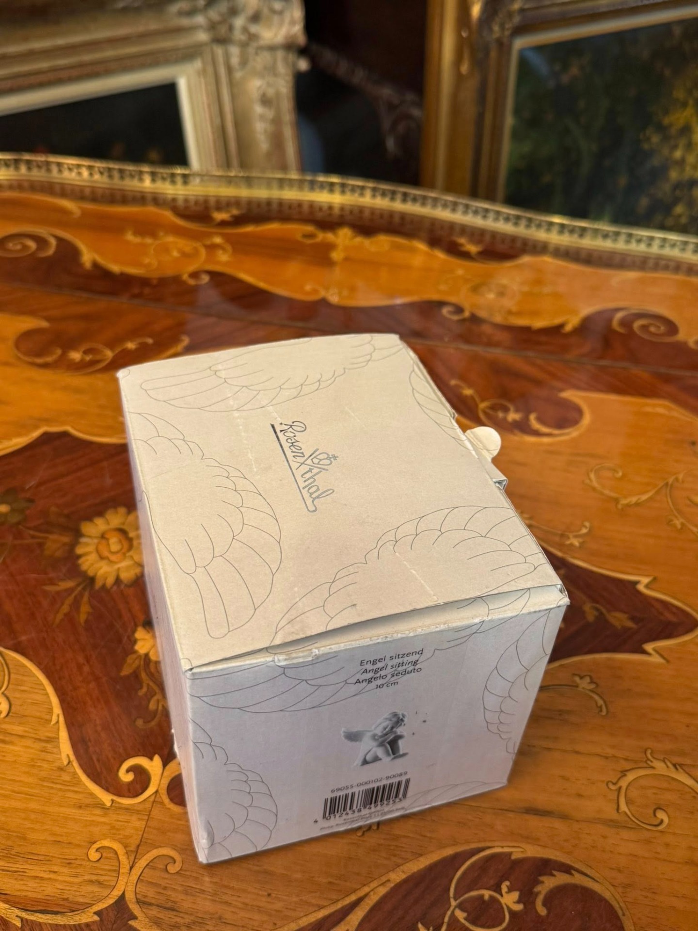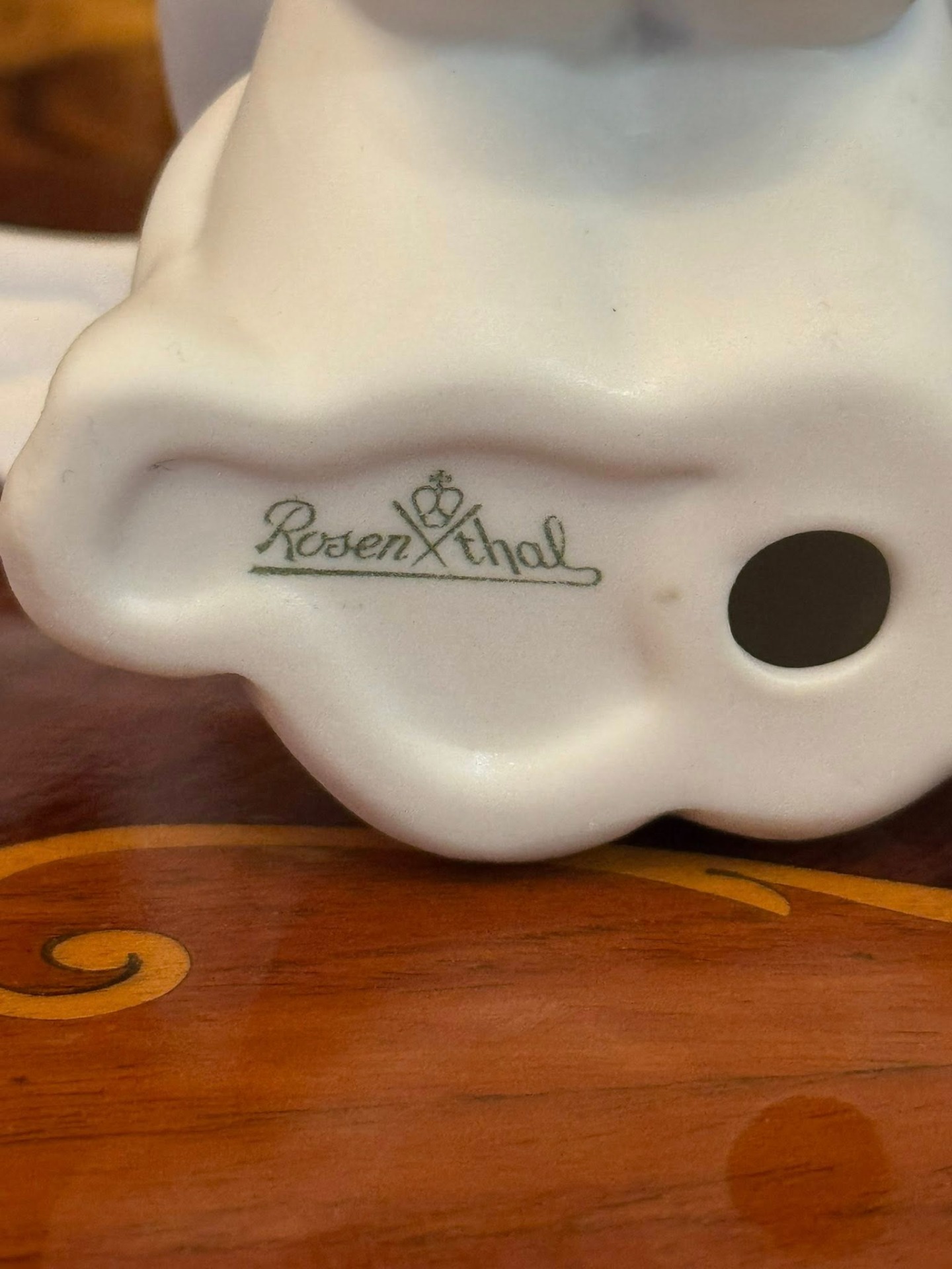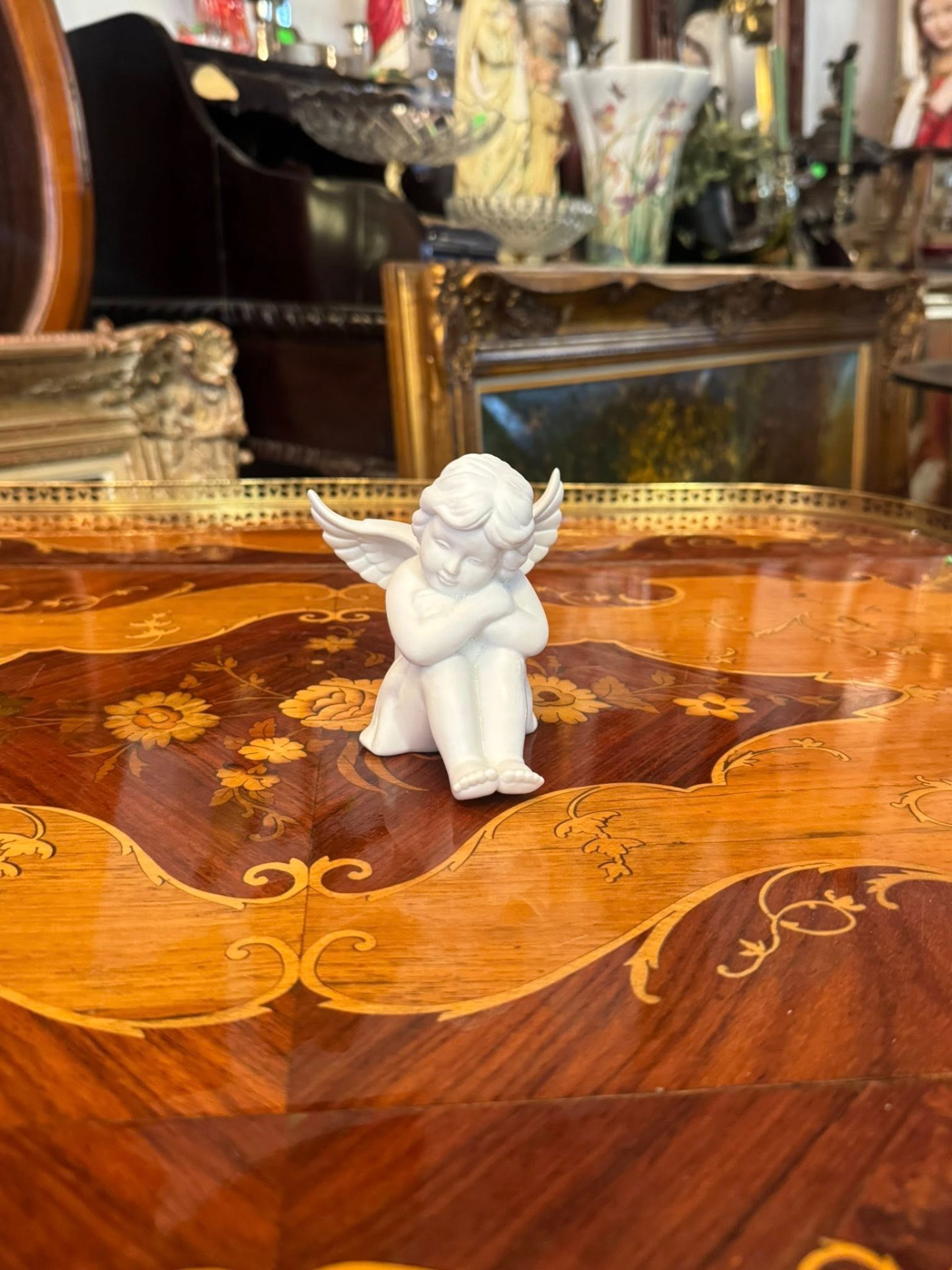 Îngeraș din porțelan alb, mat (biscuit), reprezentând un îngeraș (sau putto) într-o poziție visătoare, realizată de producătorul german Rosenthal.