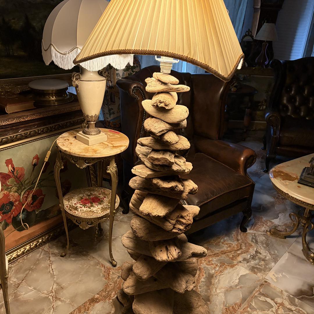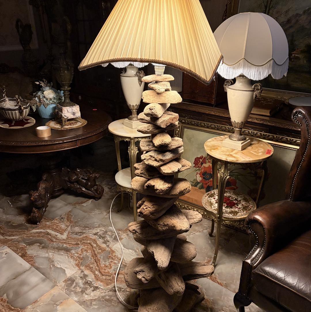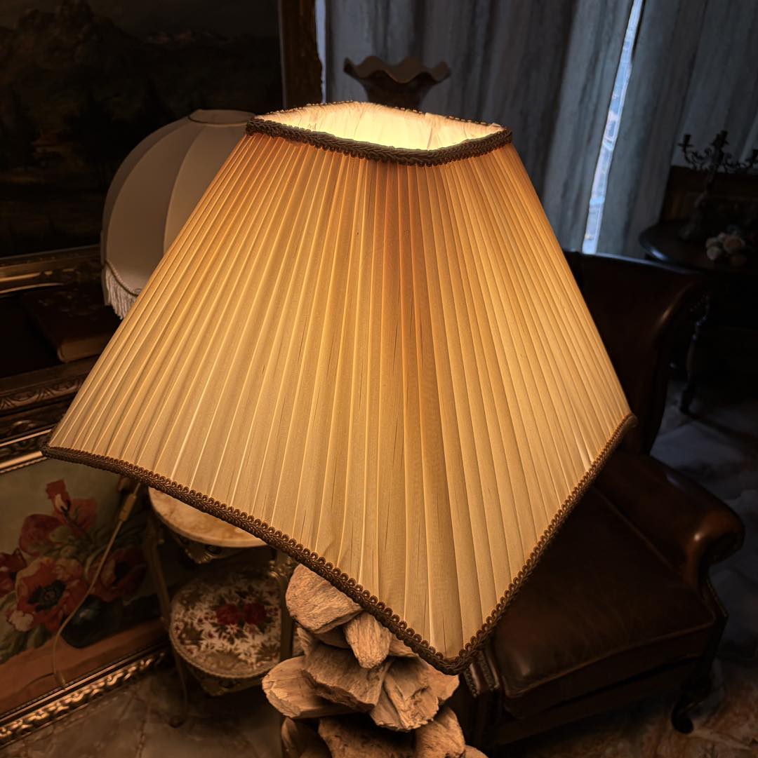 Lampa cu picior de lemn scufundat(purtat de apa sau driftwood),si abajur voluminos din material textil cu pliuri avand latura de 47 cm