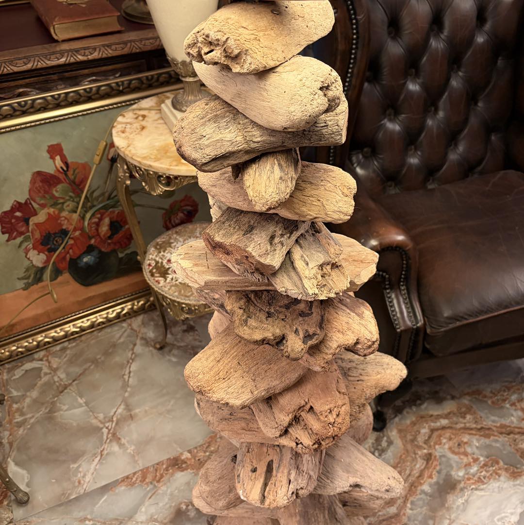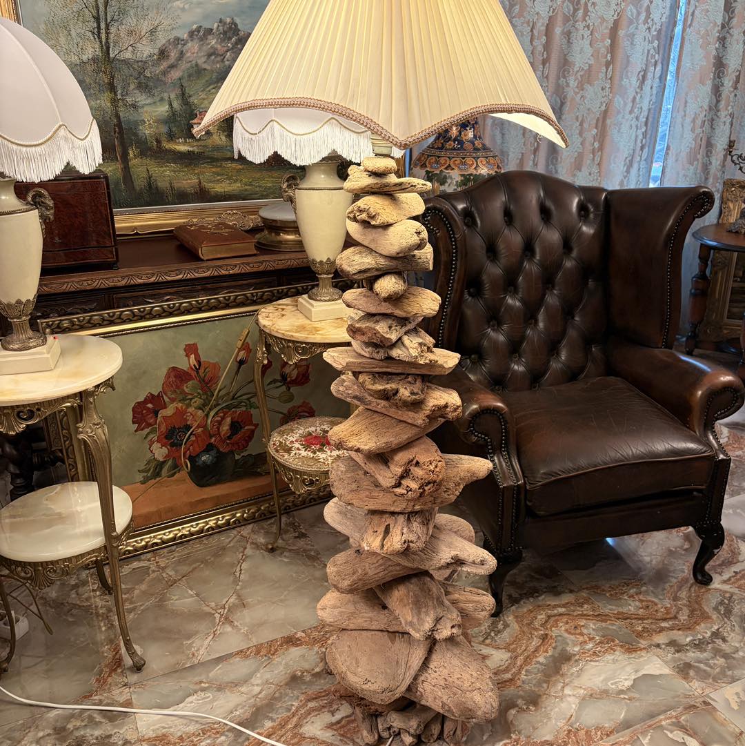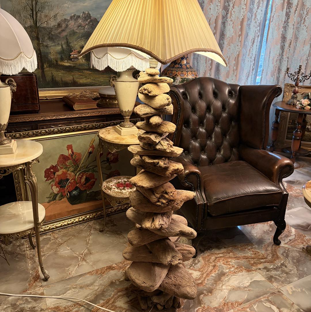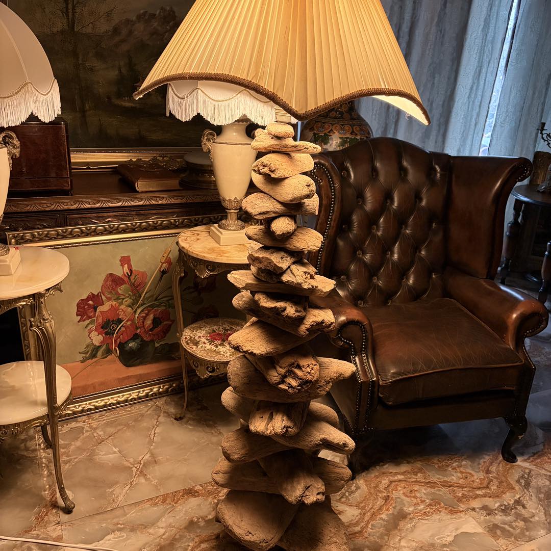 Lampa cu picior de lemn scufundat(purtat de apa sau driftwood),si abajur voluminos din material textil cu pliuri avand latura de 47 cm