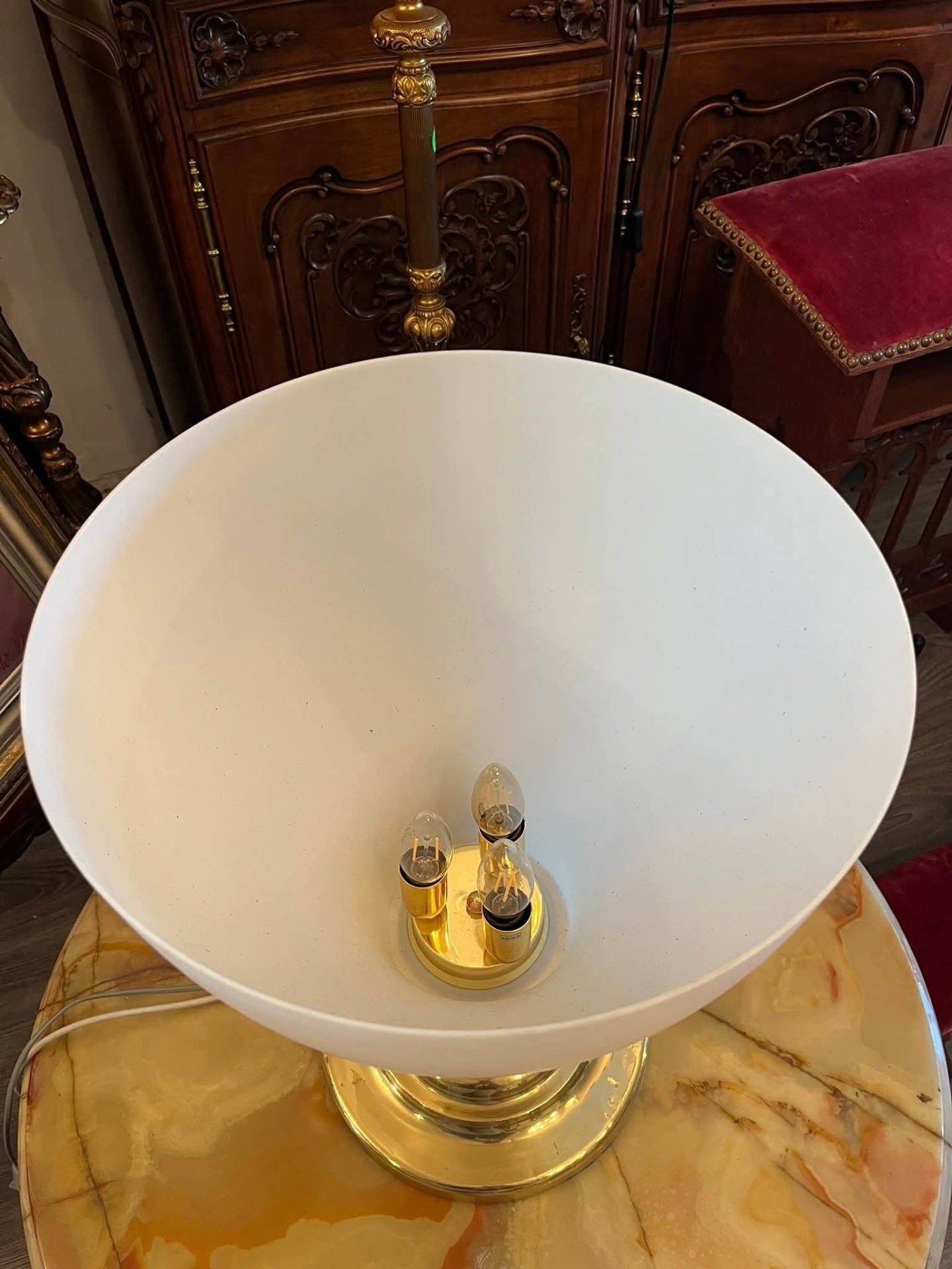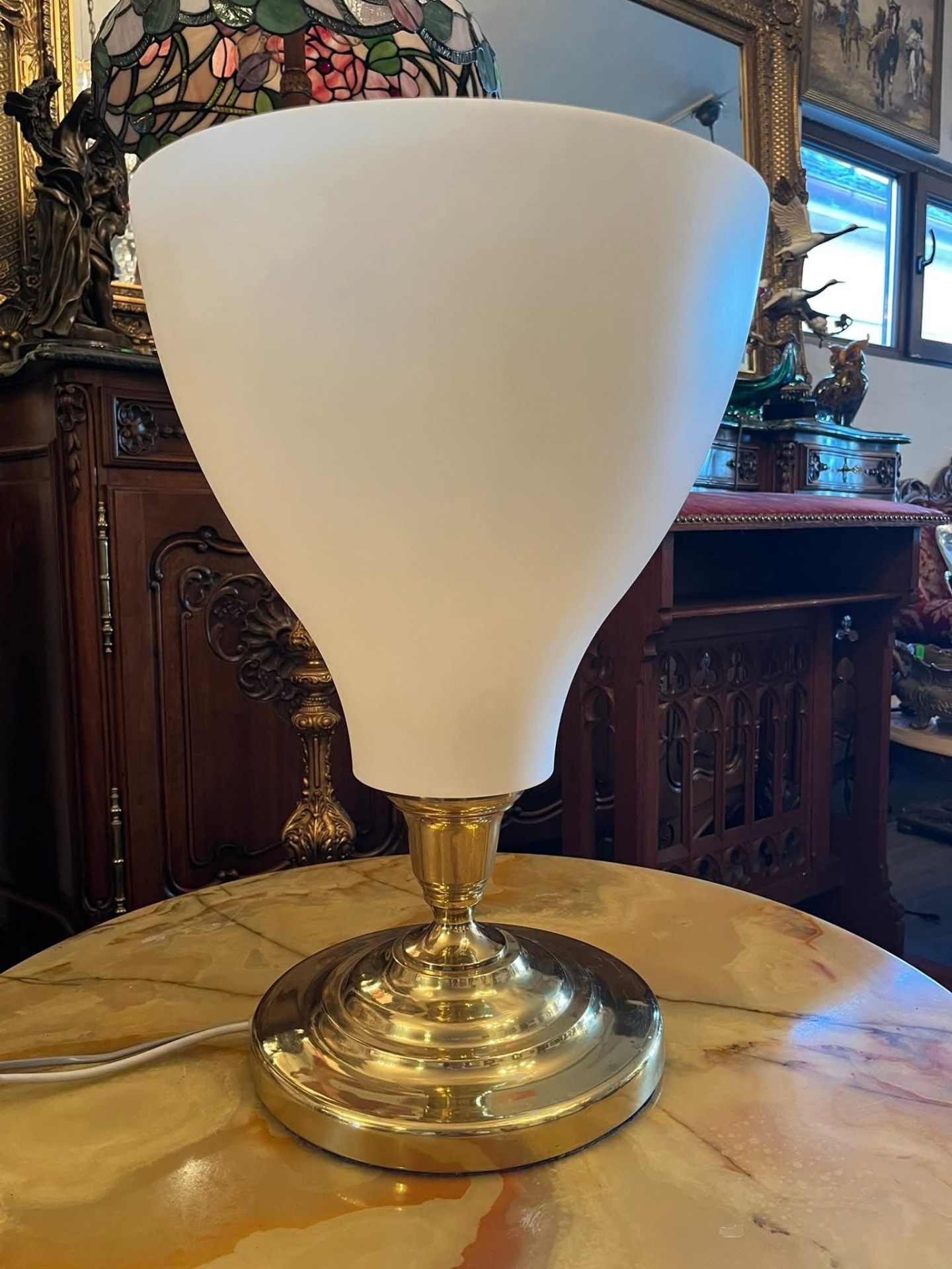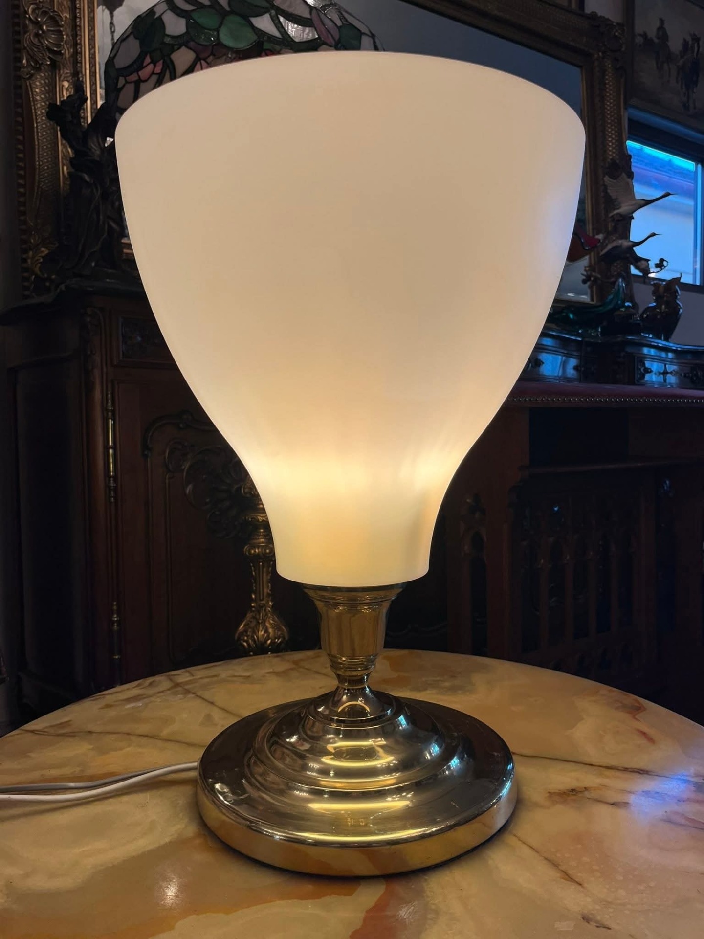 Lampă de masă deosebită, cu design elegant și rafinat, ideală pentru living, dormitor sau birou. Abajurul este realizat din sticlă mată de calitate, care oferă o lumină caldă și plăcută, creând o atmosferă confortabilă. Baza este solidă, metalică, cu finisaj auriu lucios, stabilă și rezistentă.
