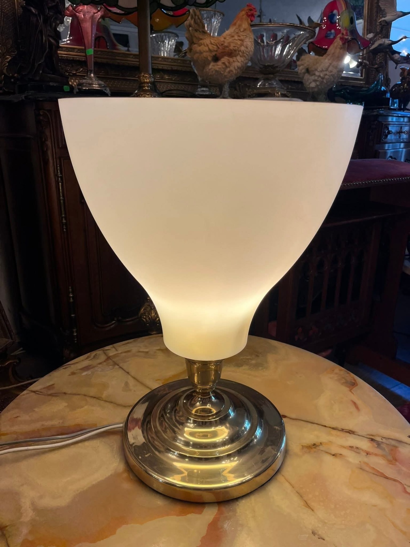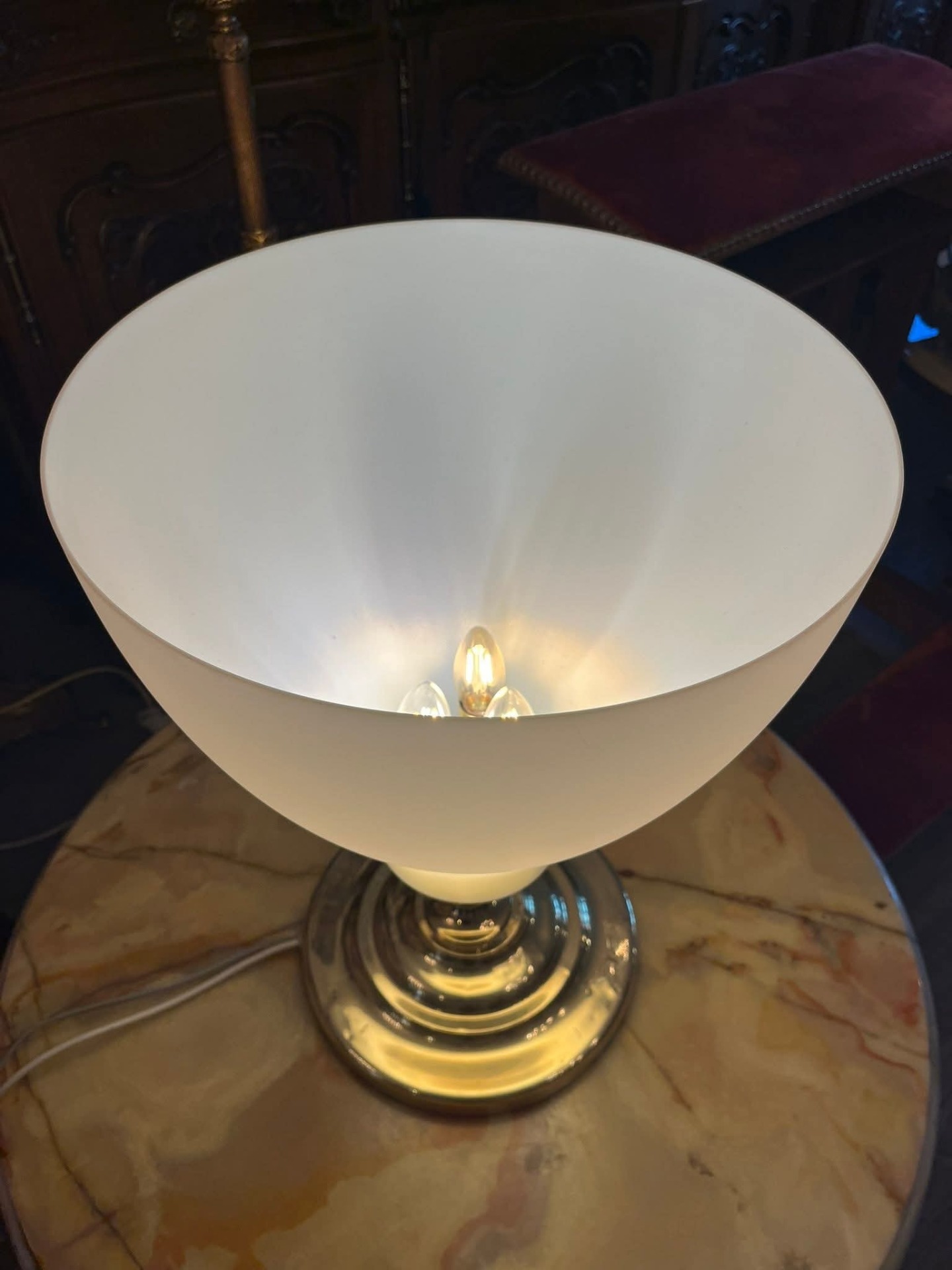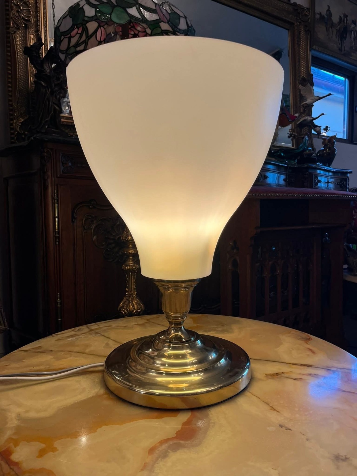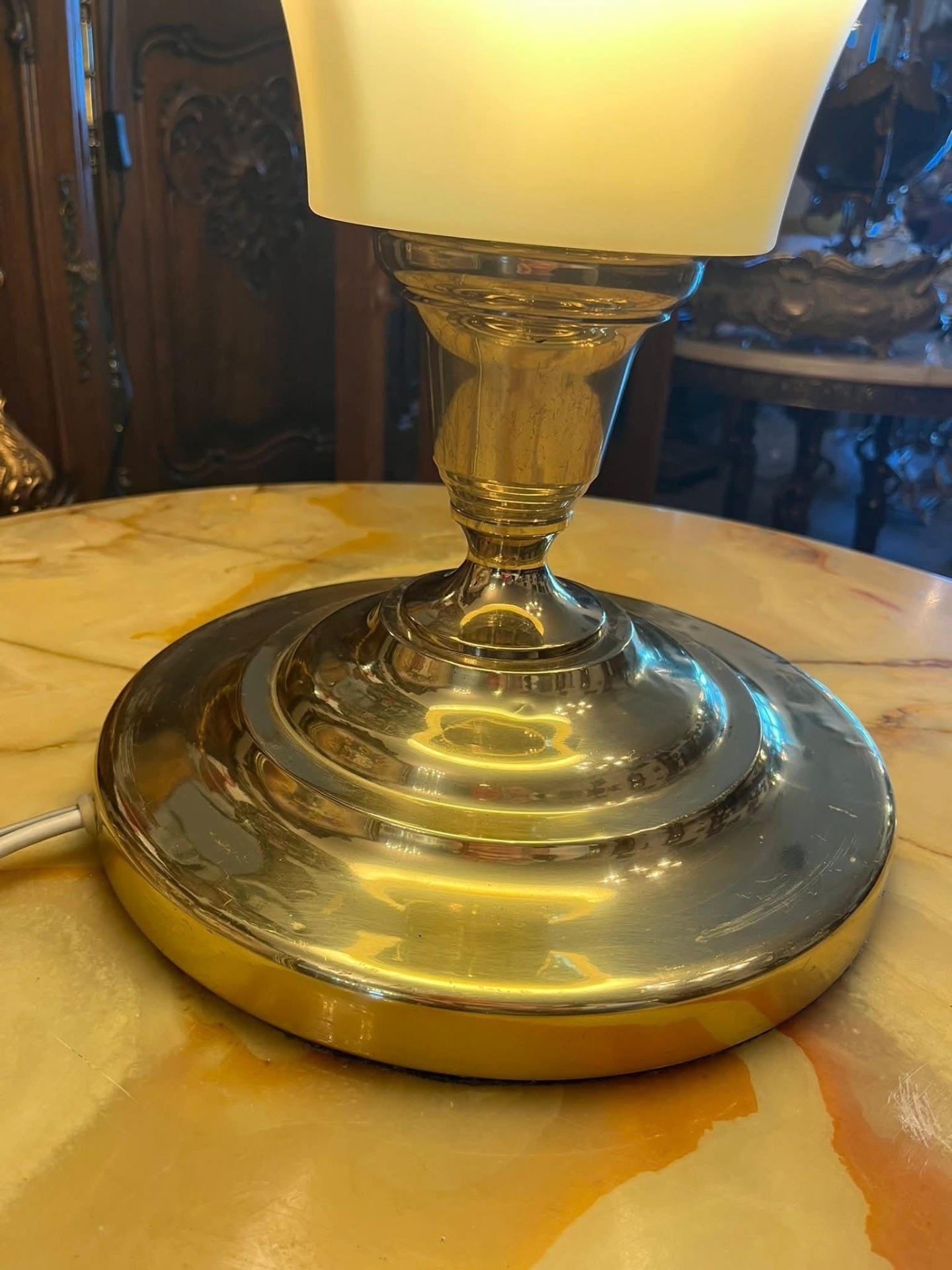 Lampă de masă deosebită, cu design elegant și rafinat, ideală pentru living, dormitor sau birou. Abajurul este realizat din sticlă mată de calitate, care oferă o lumină caldă și plăcută, creând o atmosferă confortabilă. Baza este solidă, metalică, cu finisaj auriu lucios, stabilă și rezistentă.
