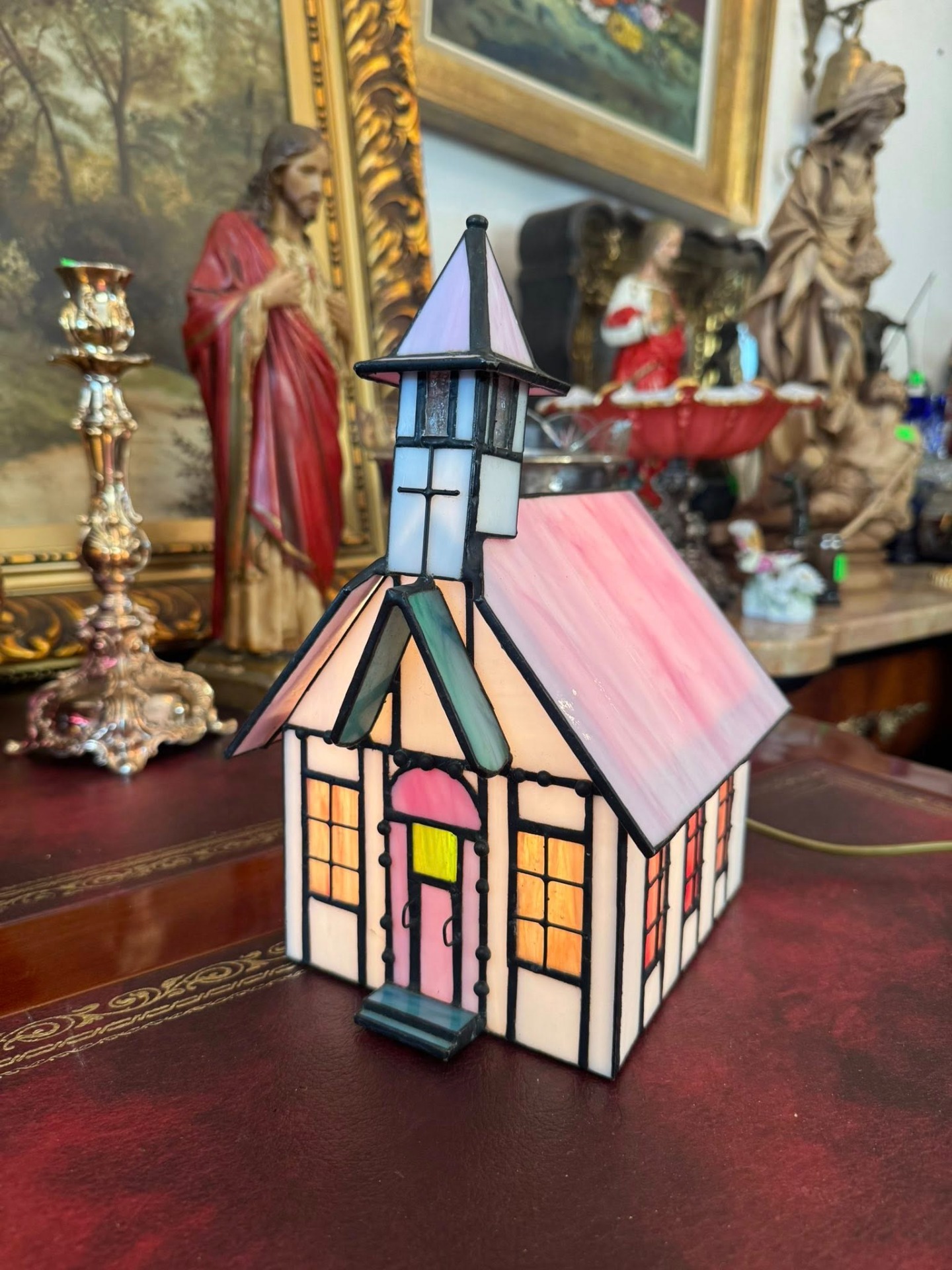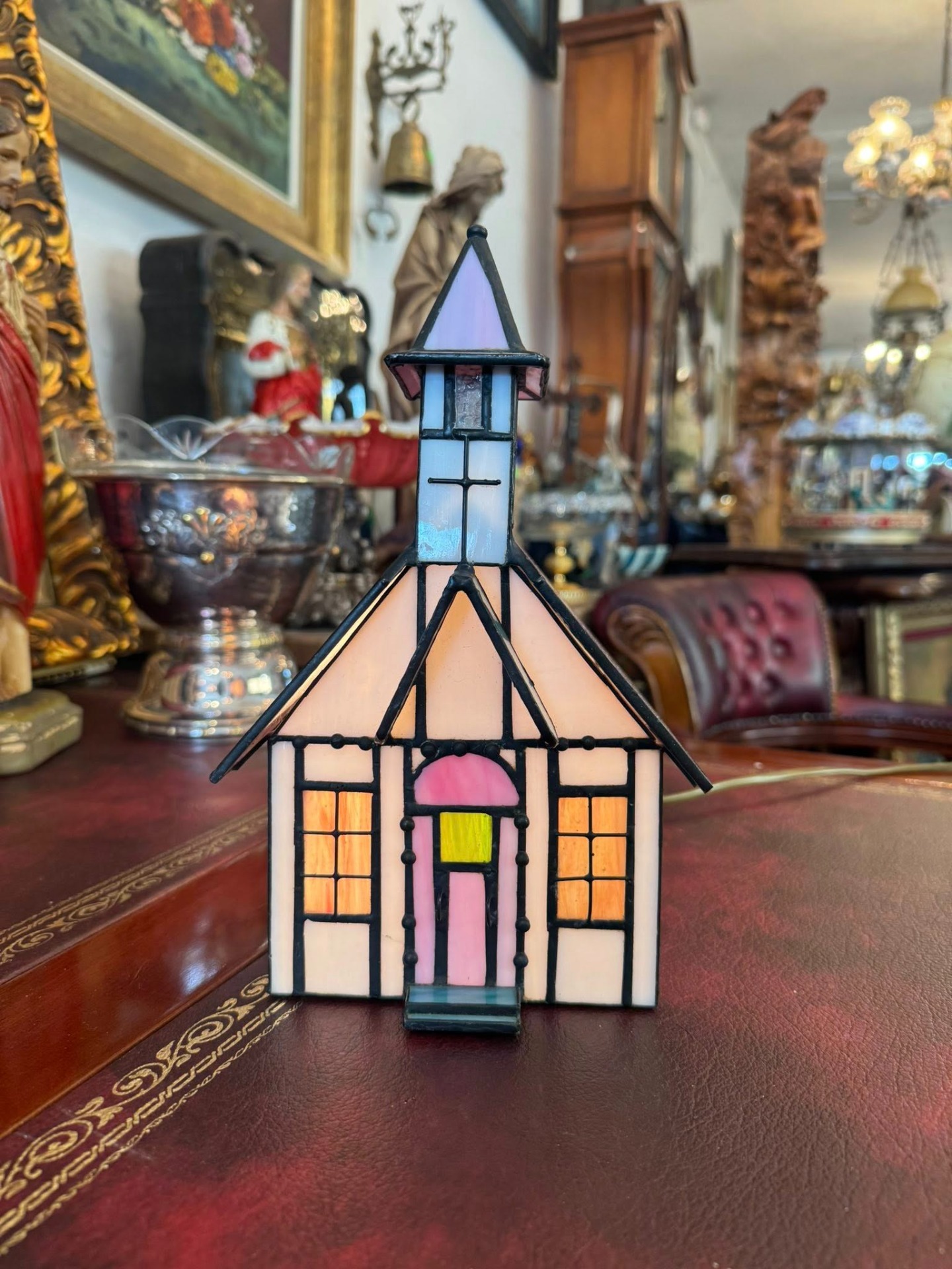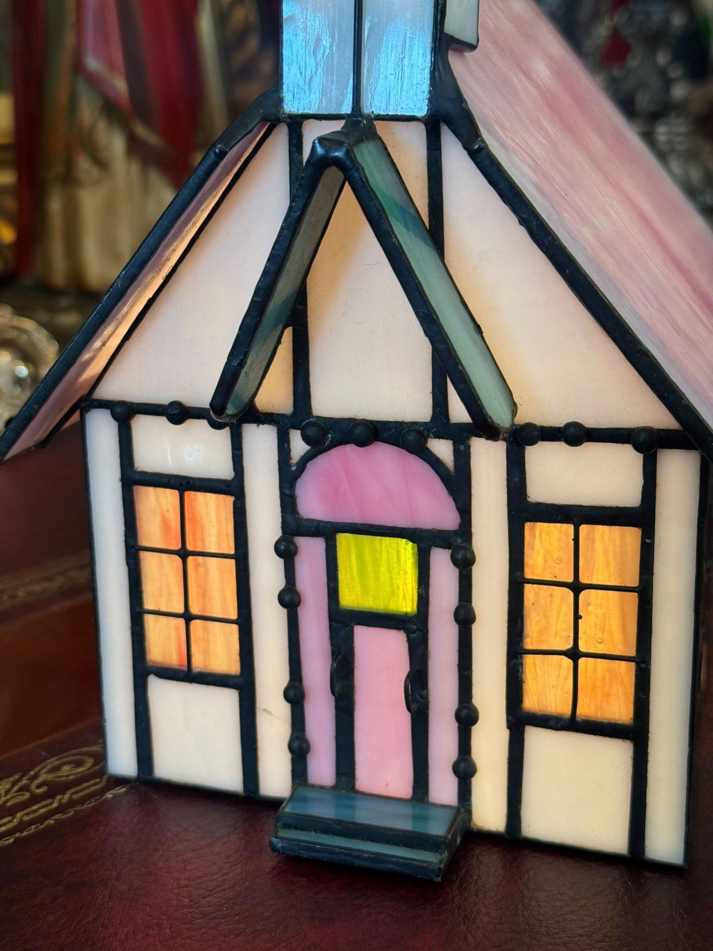 Lampă decorativă în formă de biserică, în stil Tiffany. (cca 1950)