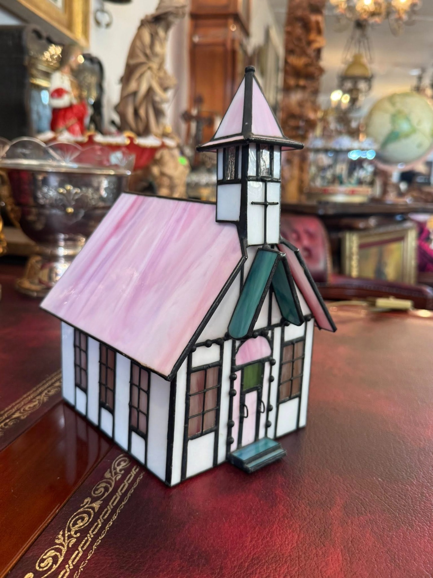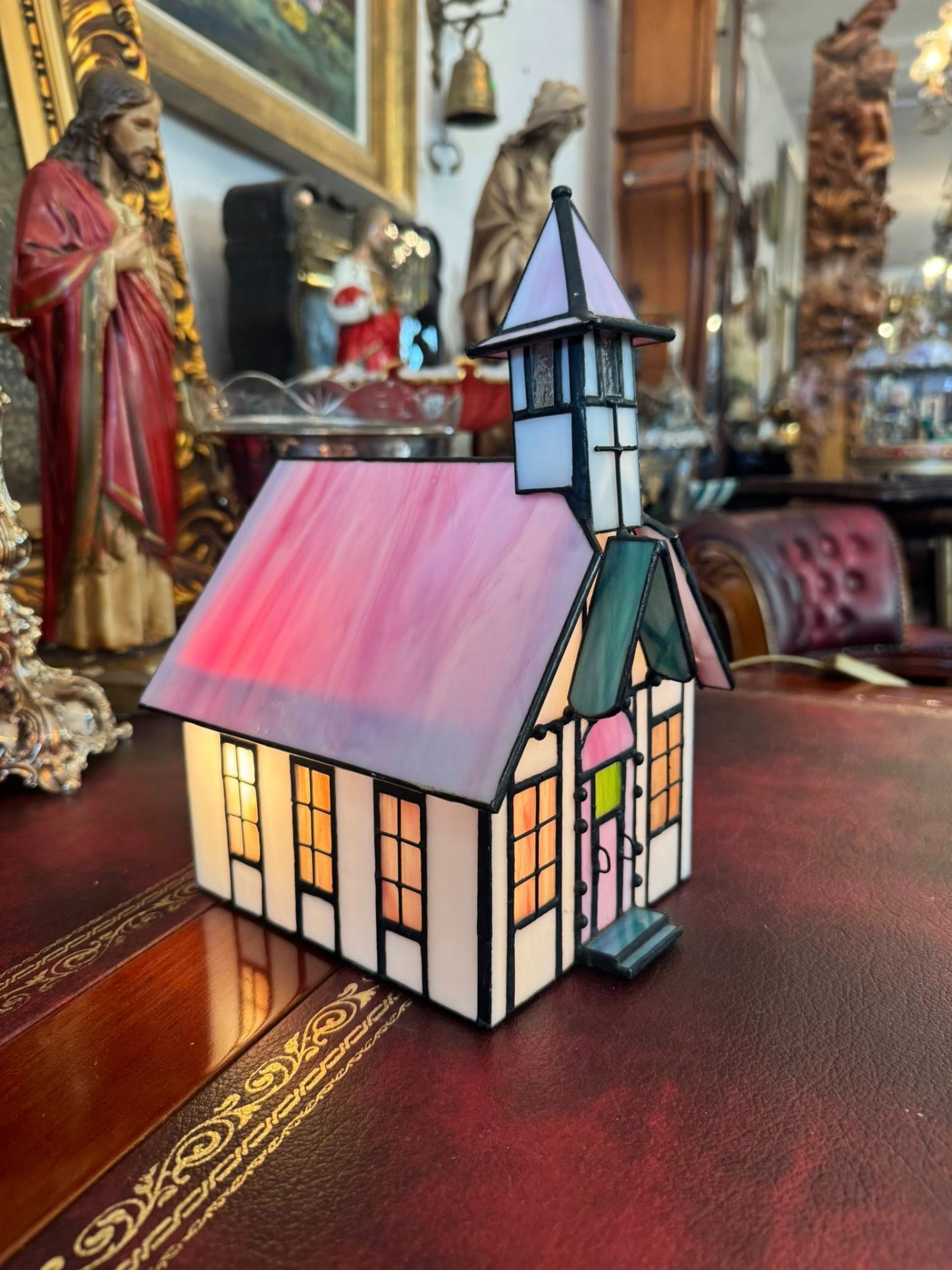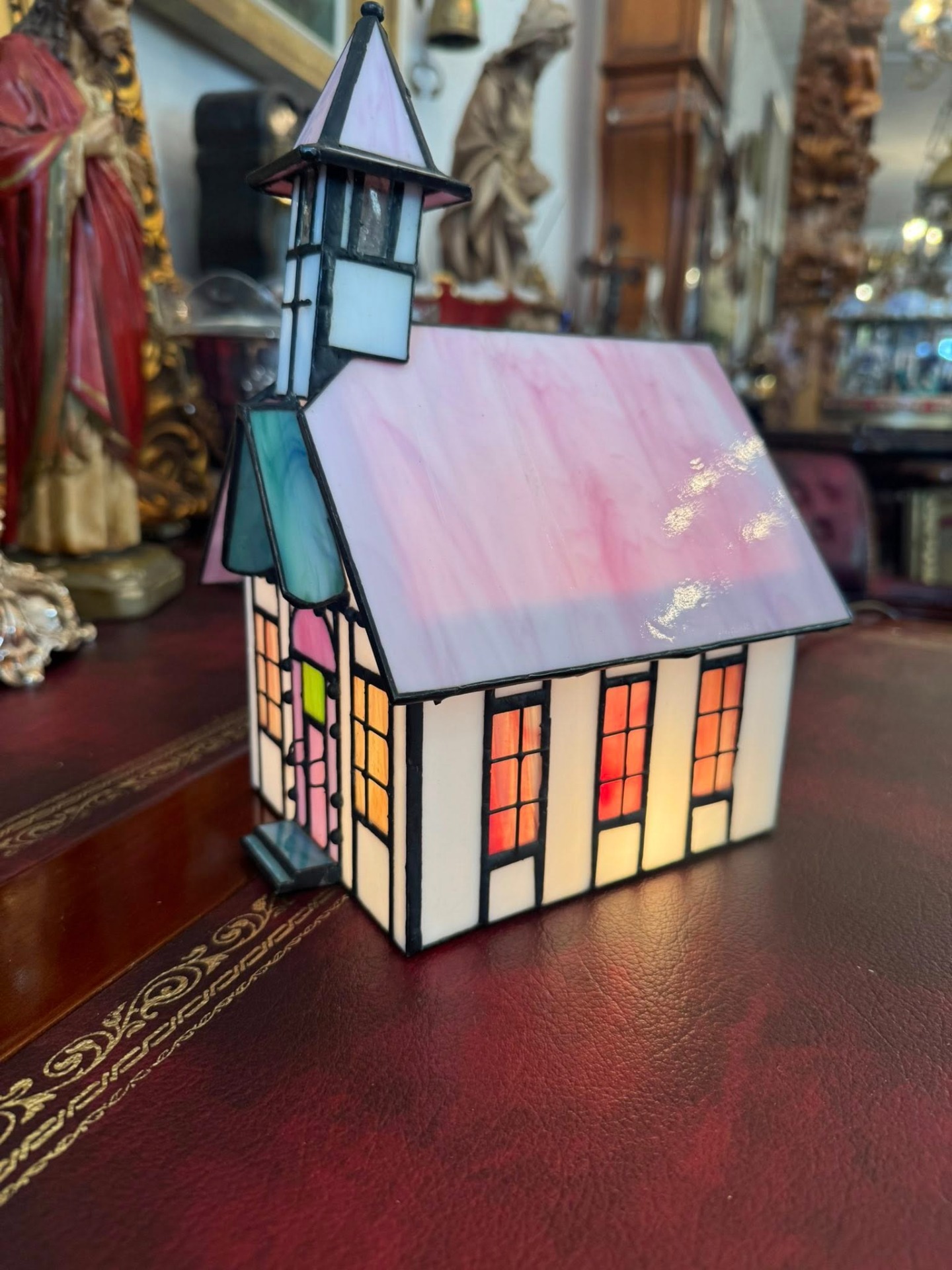Lampă decorativă în formă de biserică, în stil Tiffany. (cca 1950)