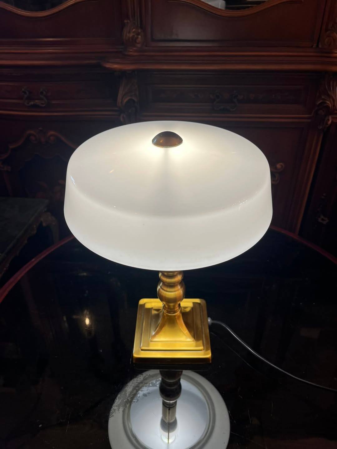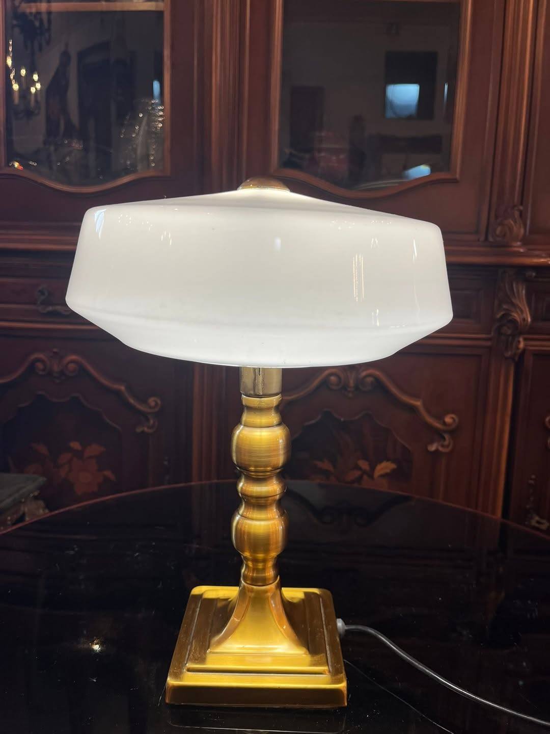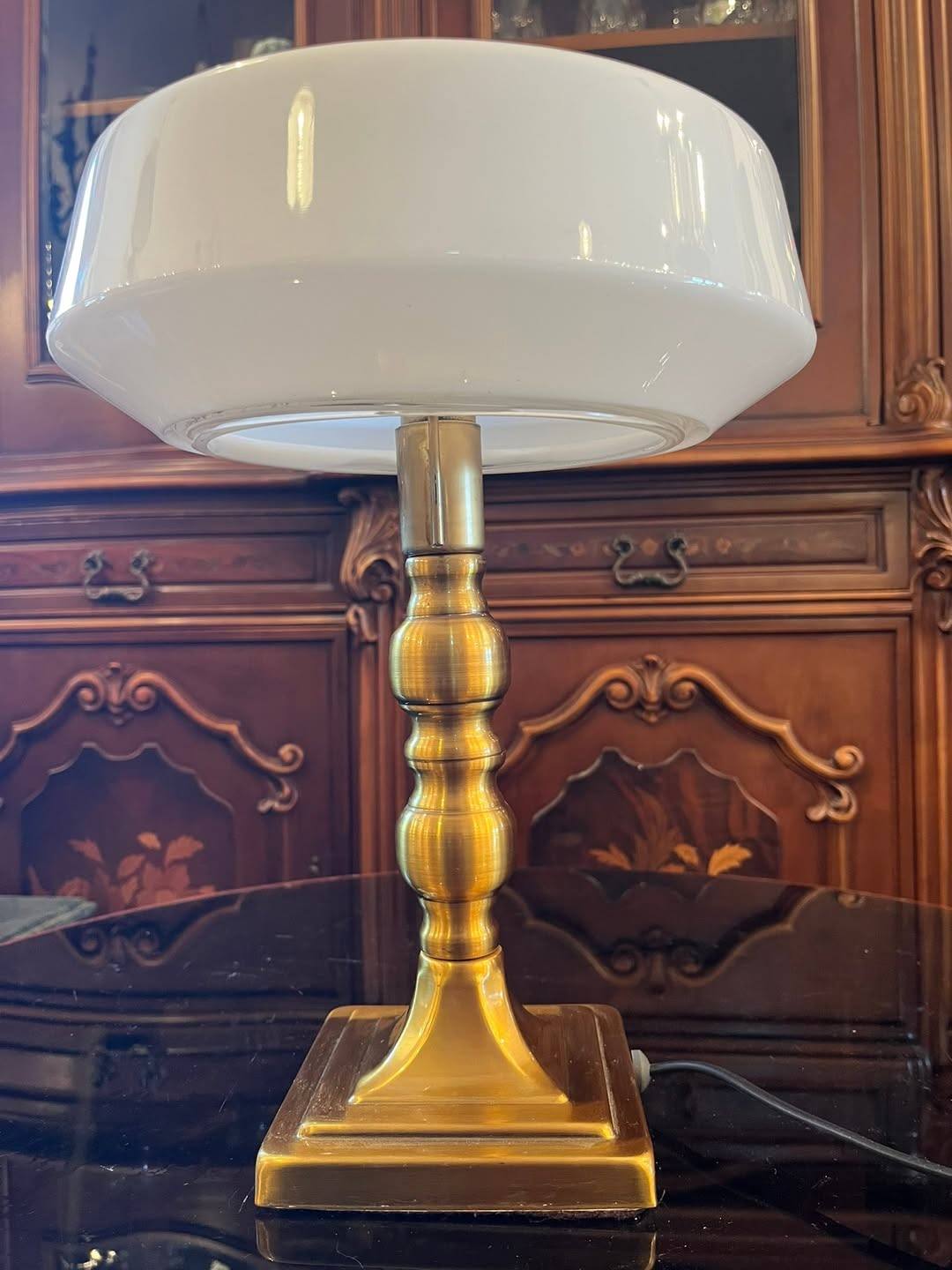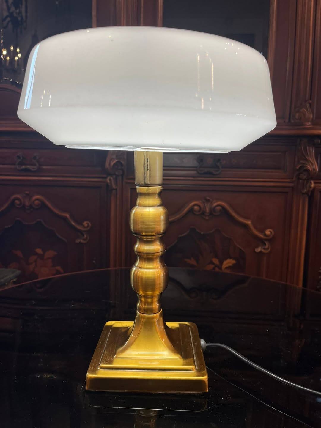 Lampă elegantă, cu design clasic, ideală pentru birou, living sau bibliotecă. Piciorul este realizat din alama, iar abajurul din sticlă opalină albă oferă o lumină caldă și plăcută, perfectă pentru citit sau ambient.