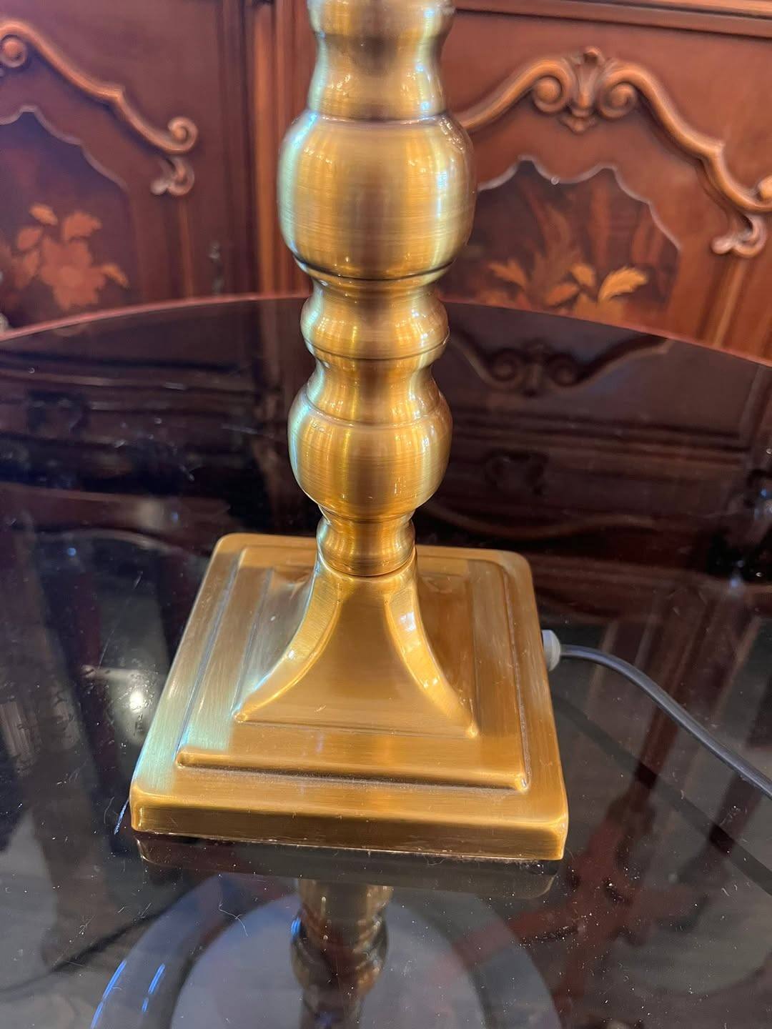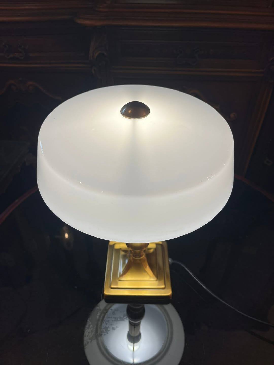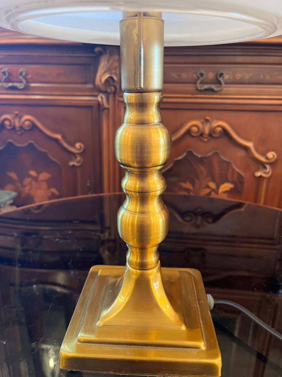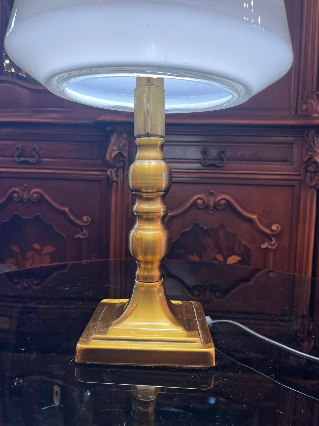 Lampă elegantă, cu design clasic, ideală pentru birou, living sau bibliotecă. Piciorul este realizat din alama, iar abajurul din sticlă opalină albă oferă o lumină caldă și plăcută, perfectă pentru citit sau ambient.