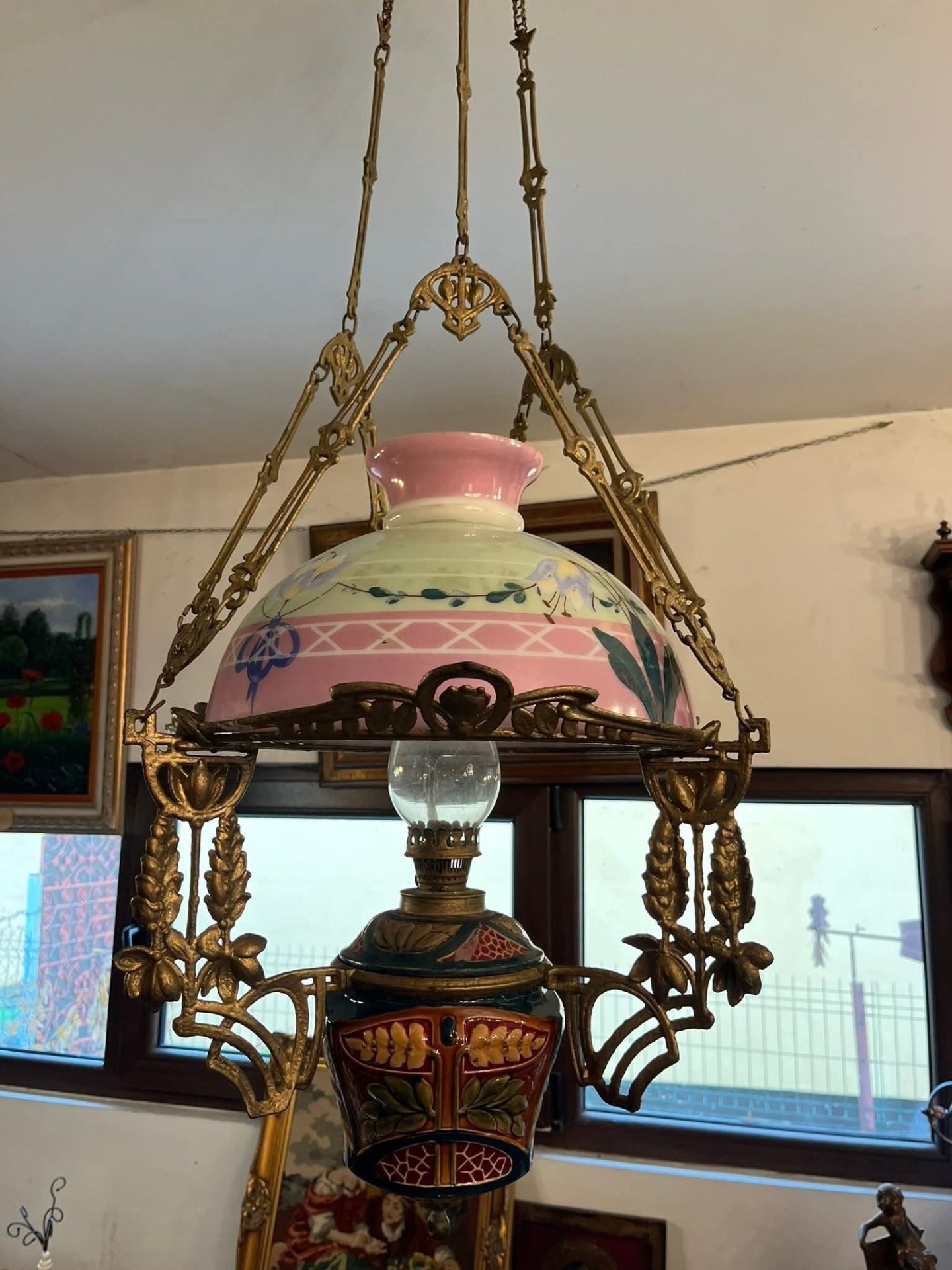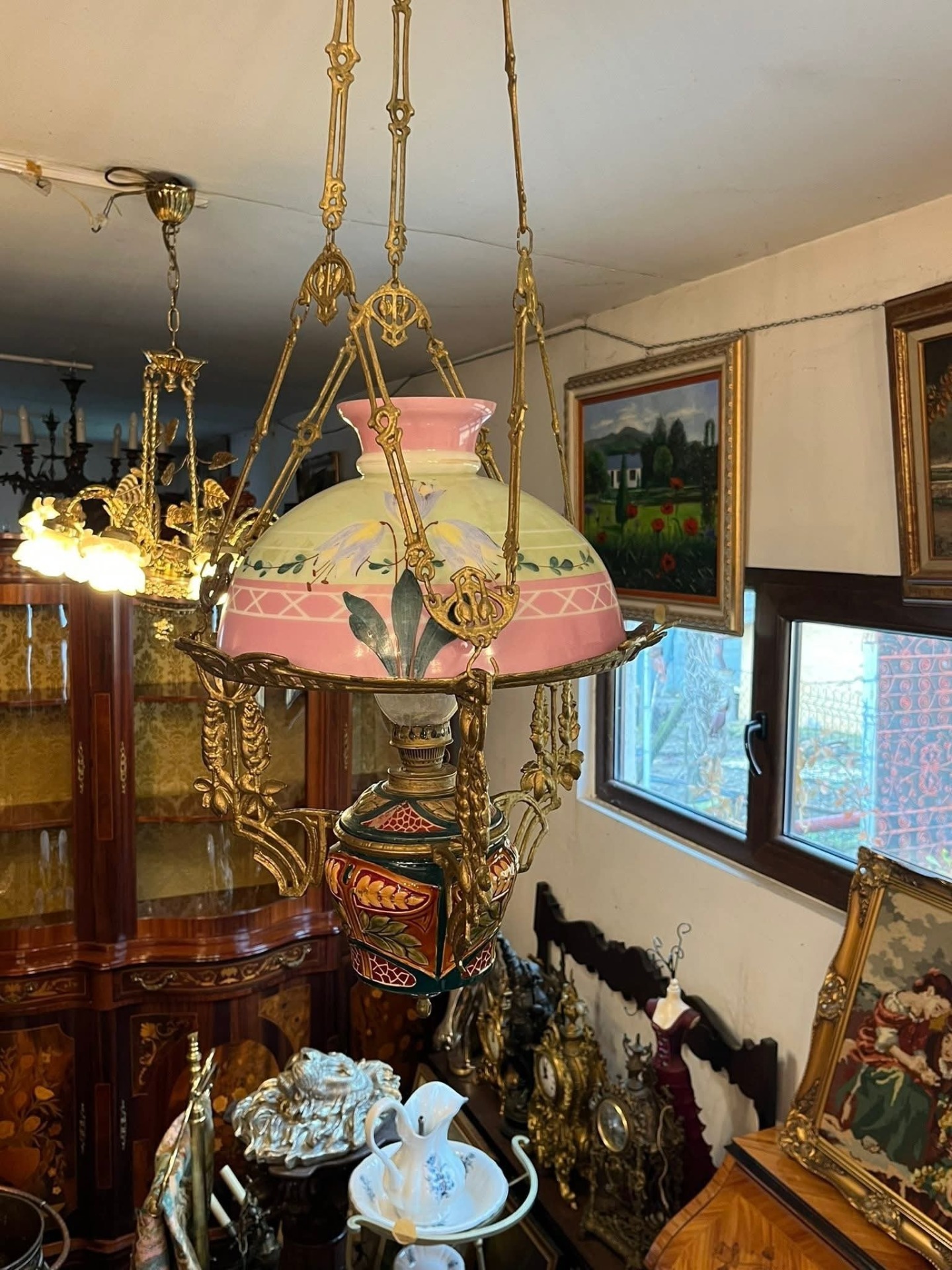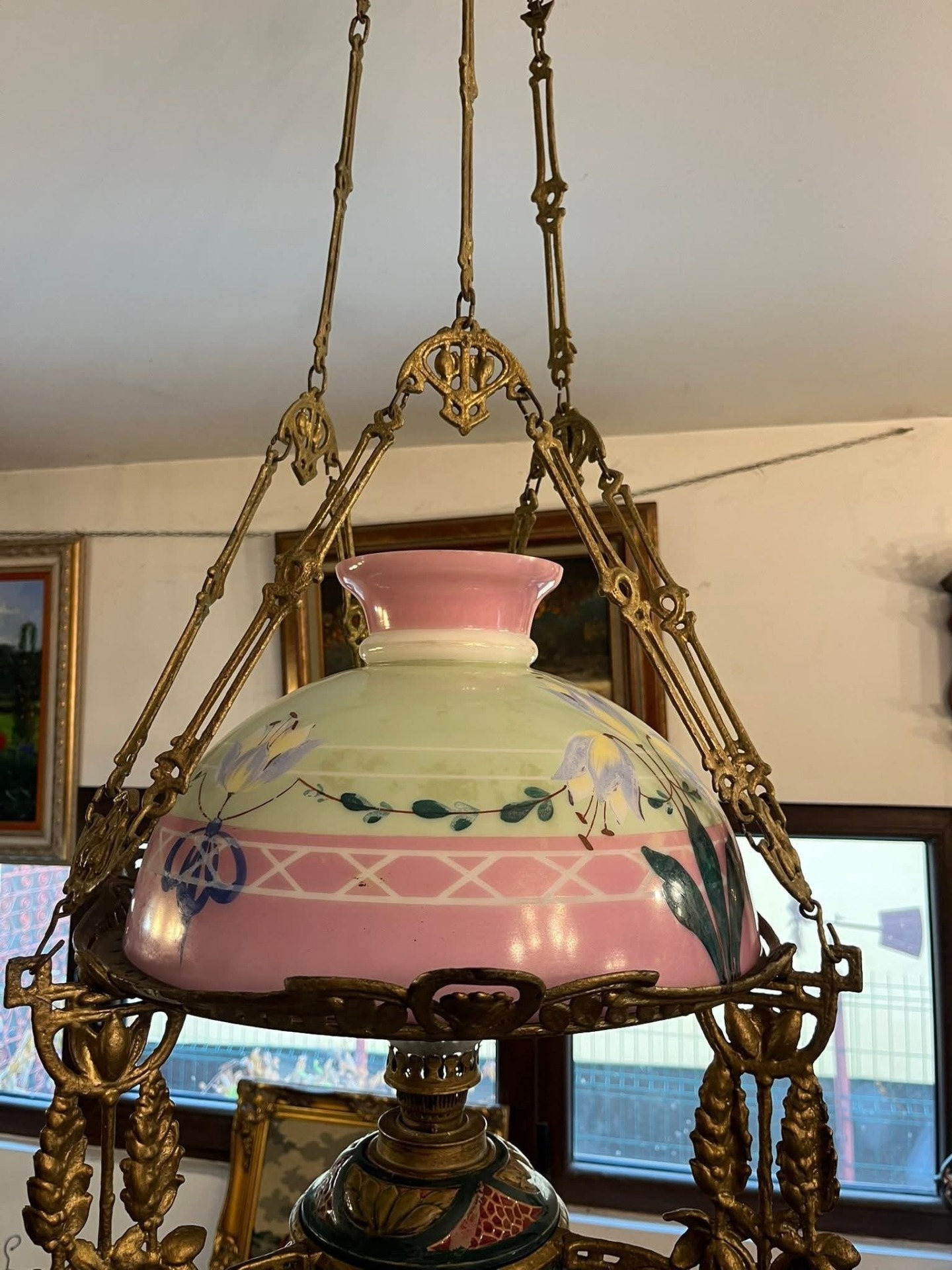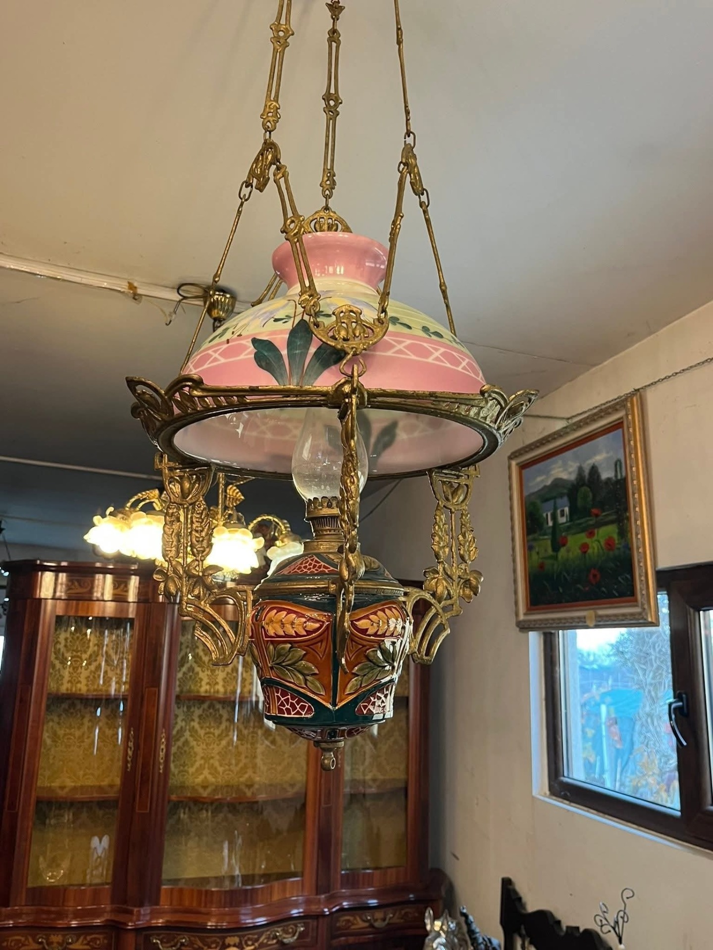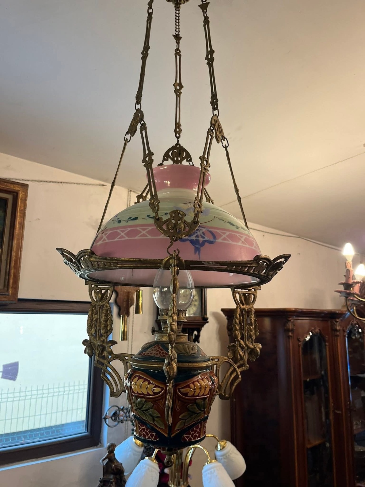 Cu suport și elemente suspendate din bronz masiv. Piesa este autentică, cu detalii florale în relief și culori vii, specifice lucrărilor de calitate din prima jumătate a secolului trecut.