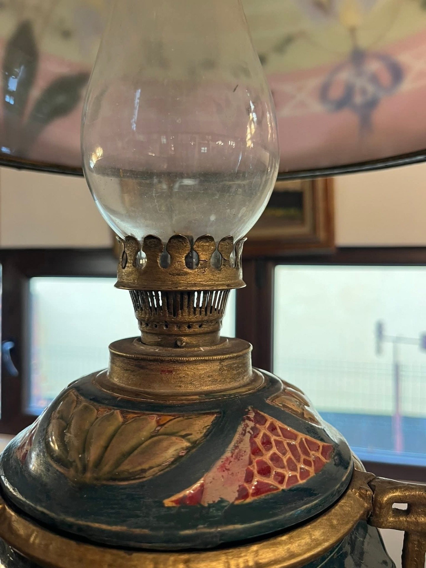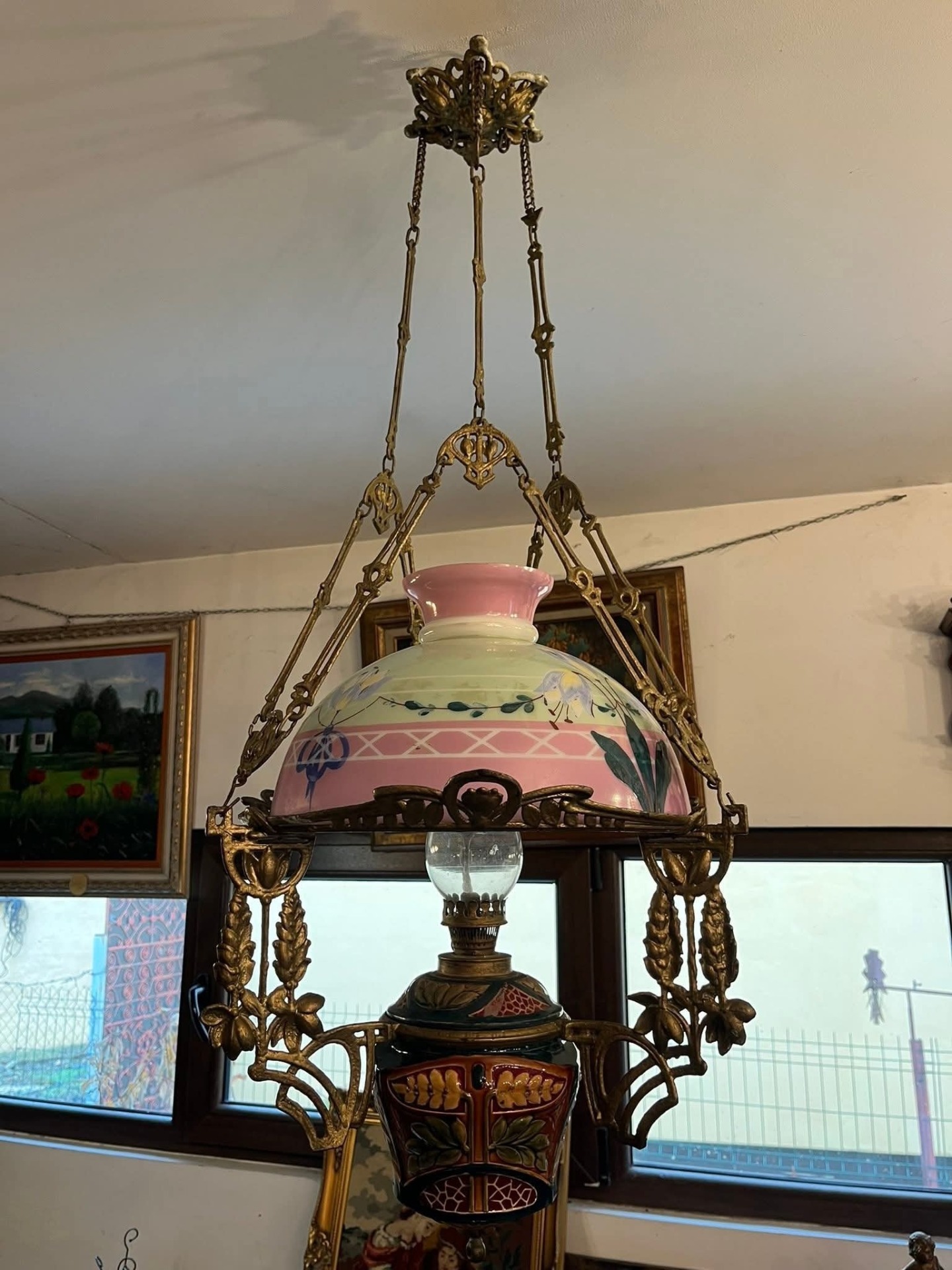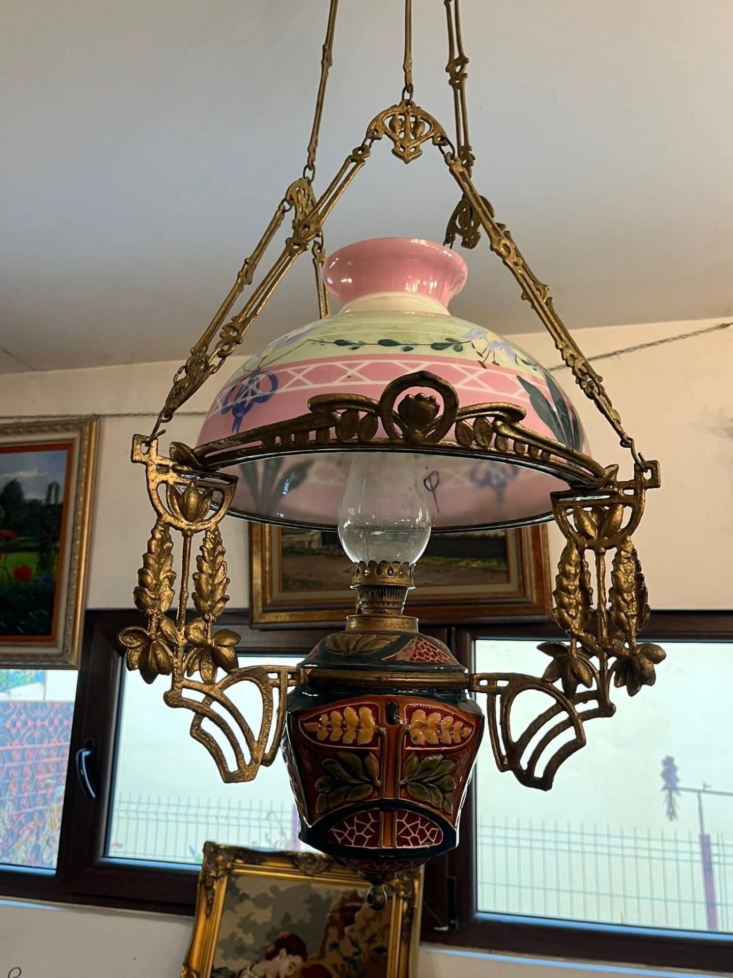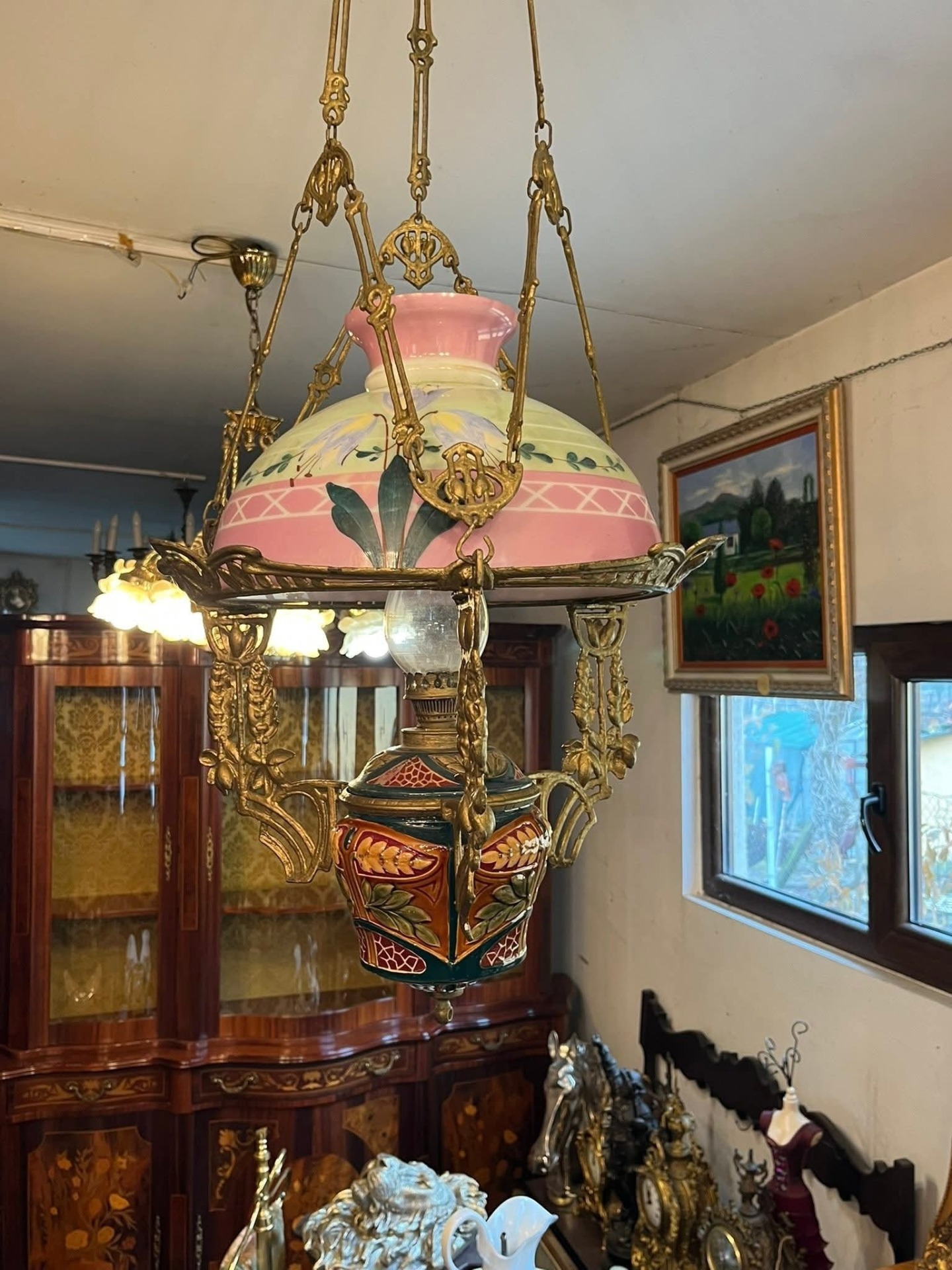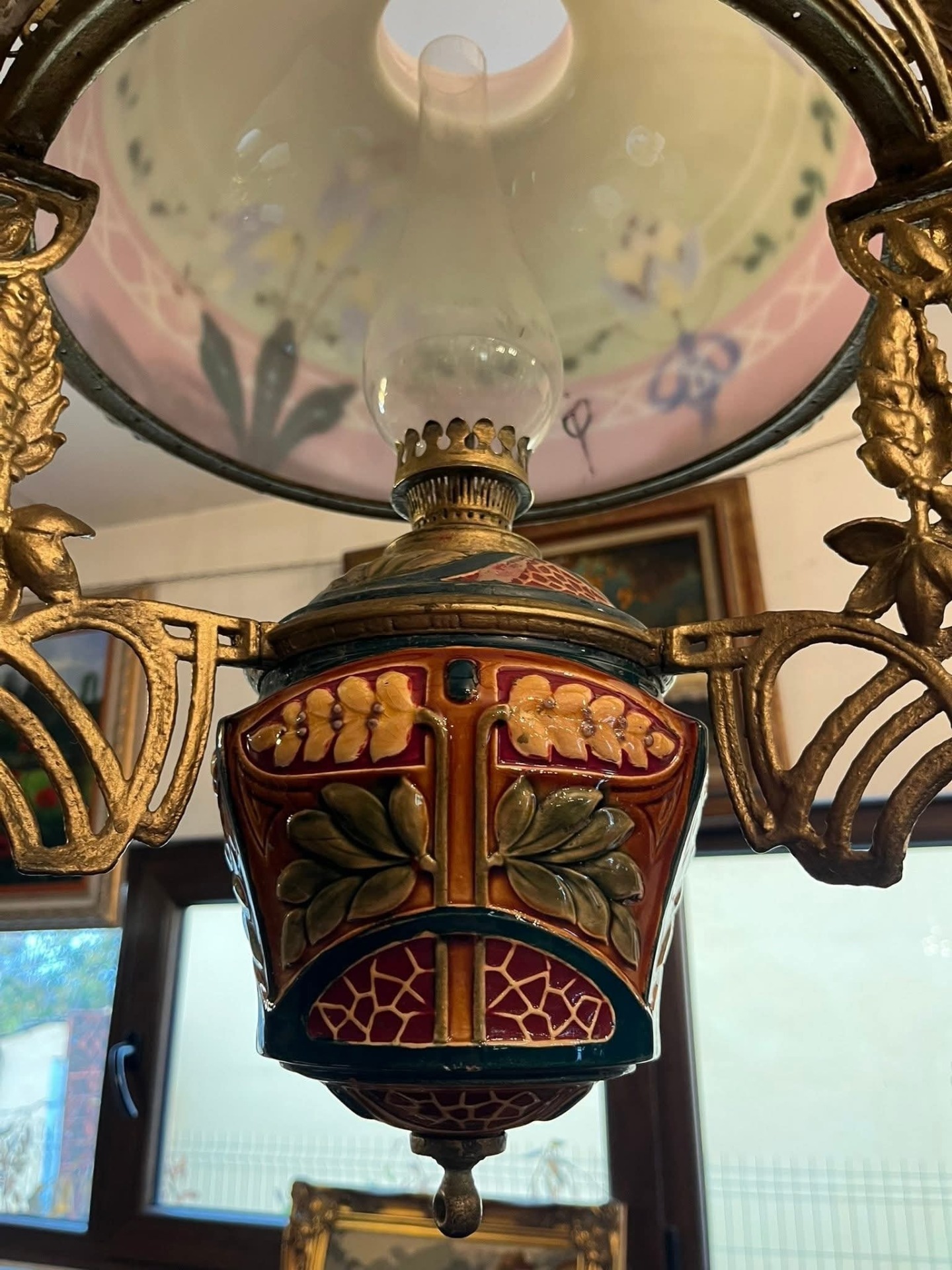 Lampă pe petrol din maiolică – piesă veche, decorată manual, cu montură din bronz