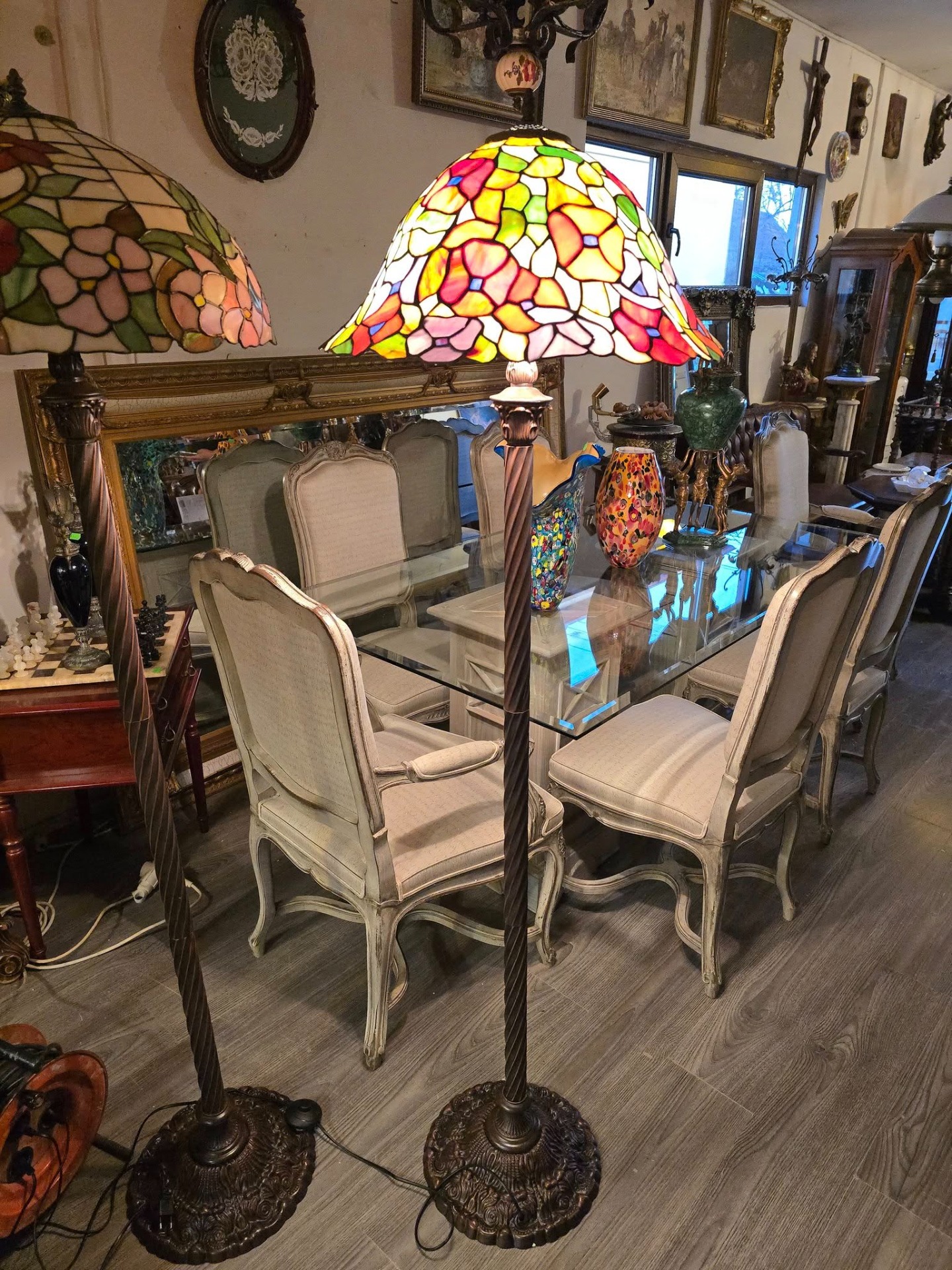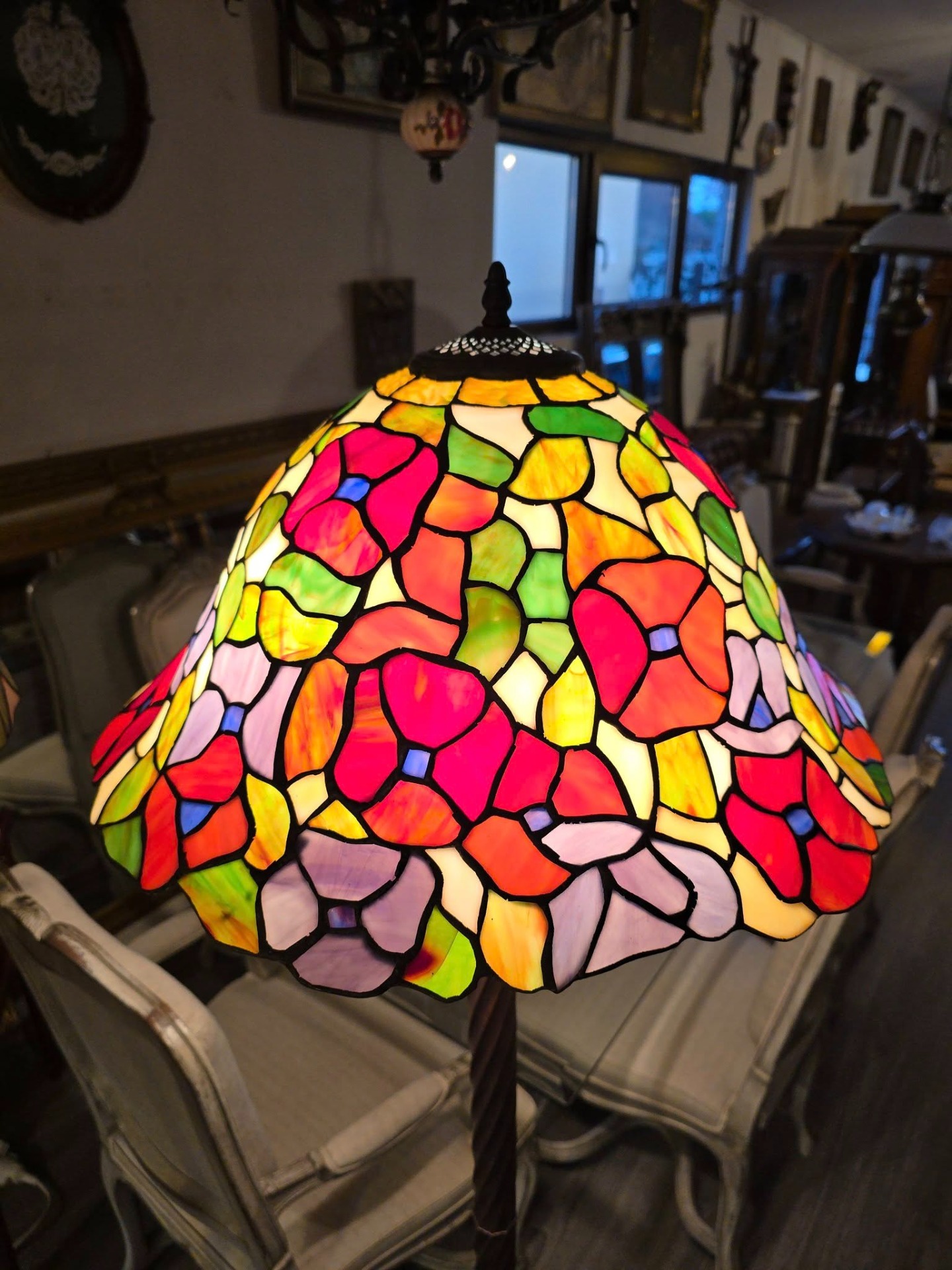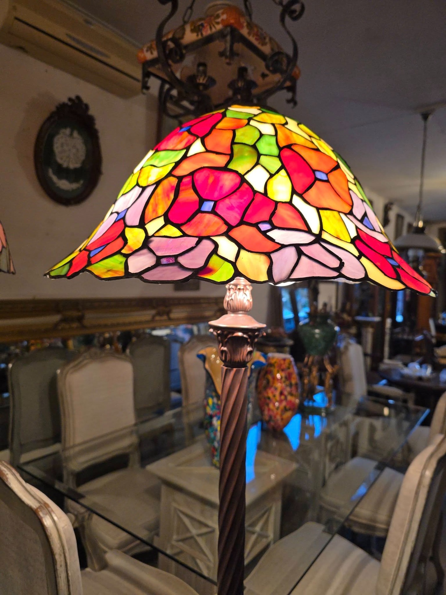 Lampa stilul Tiffany din sticla si metal cu picior din metal optic bronz.