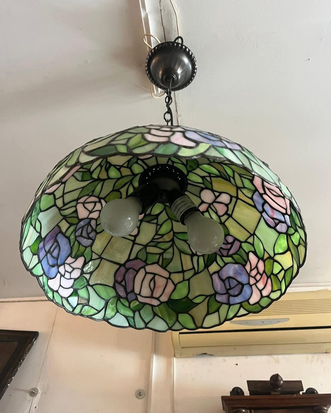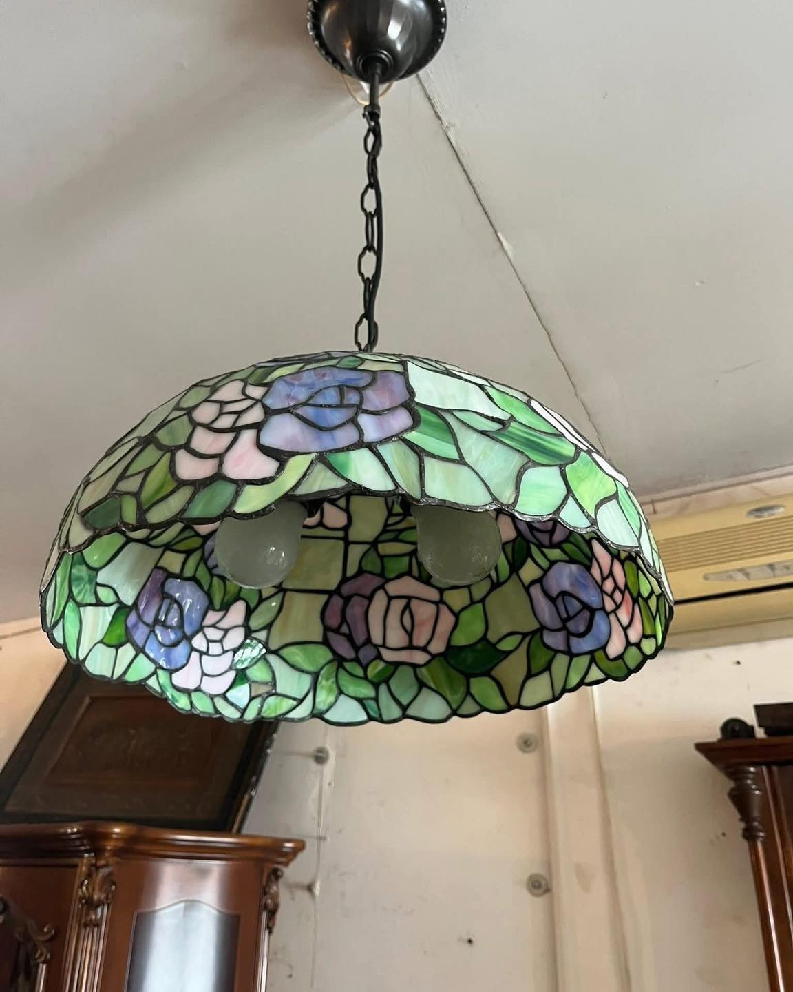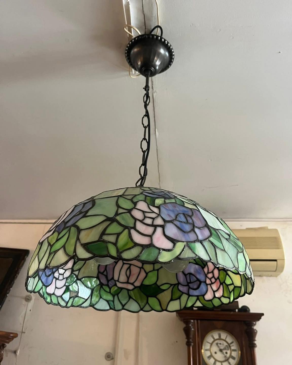 Lampă suspendată spectaculoasă în stil Tiffany, realizată din vitralii colorate îmbinate manual. Design floral elegant, oferă o lumină plăcută și ambientală.