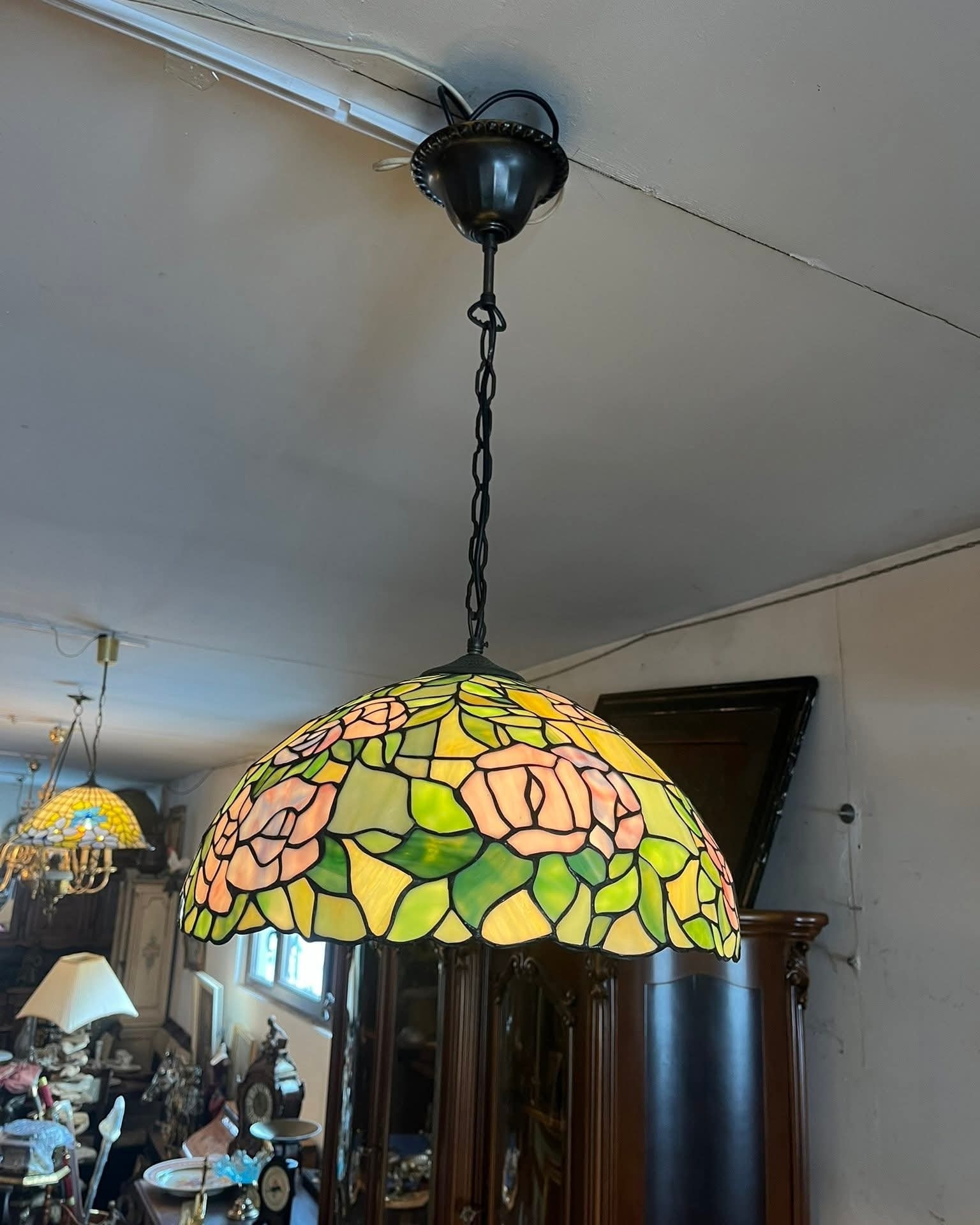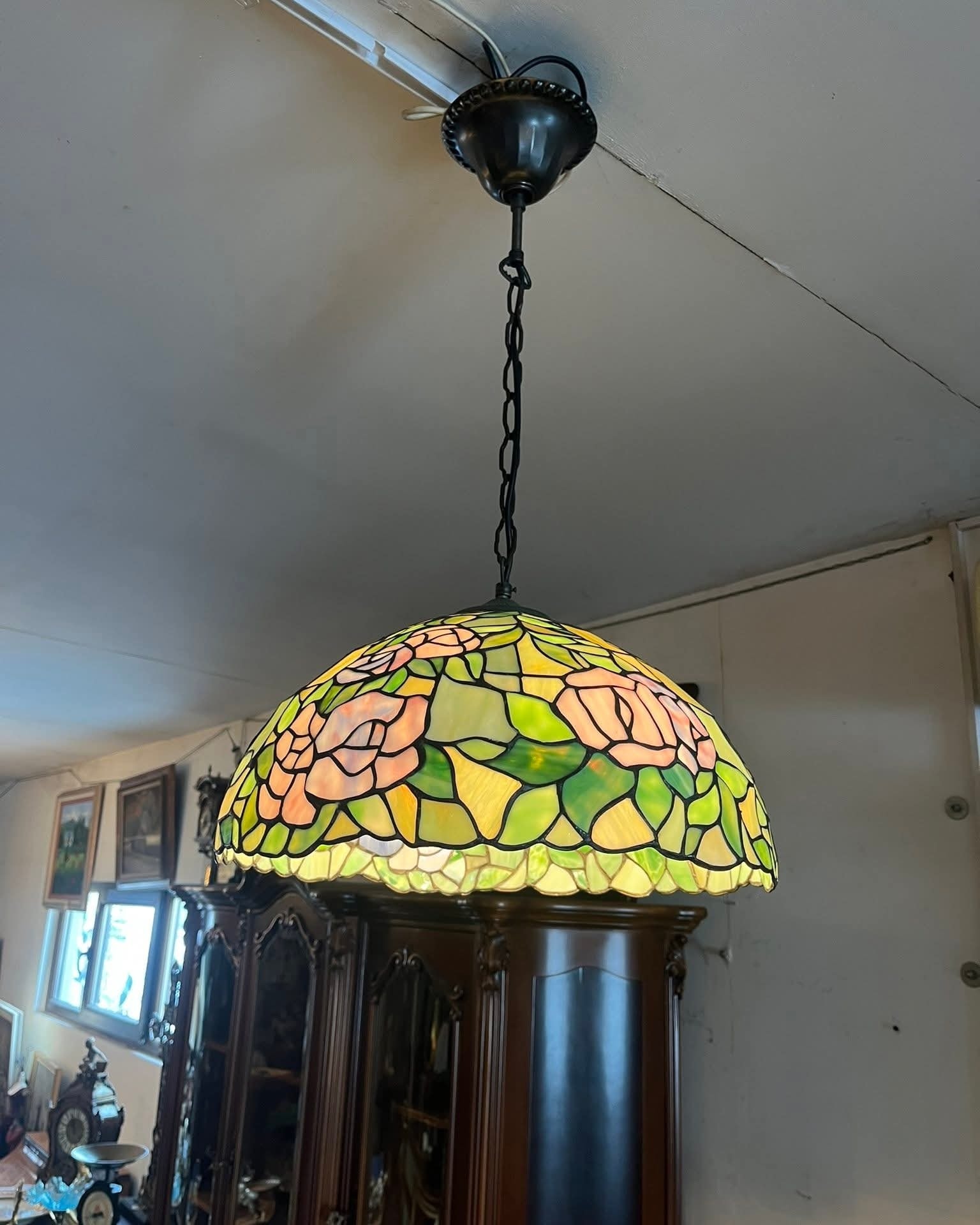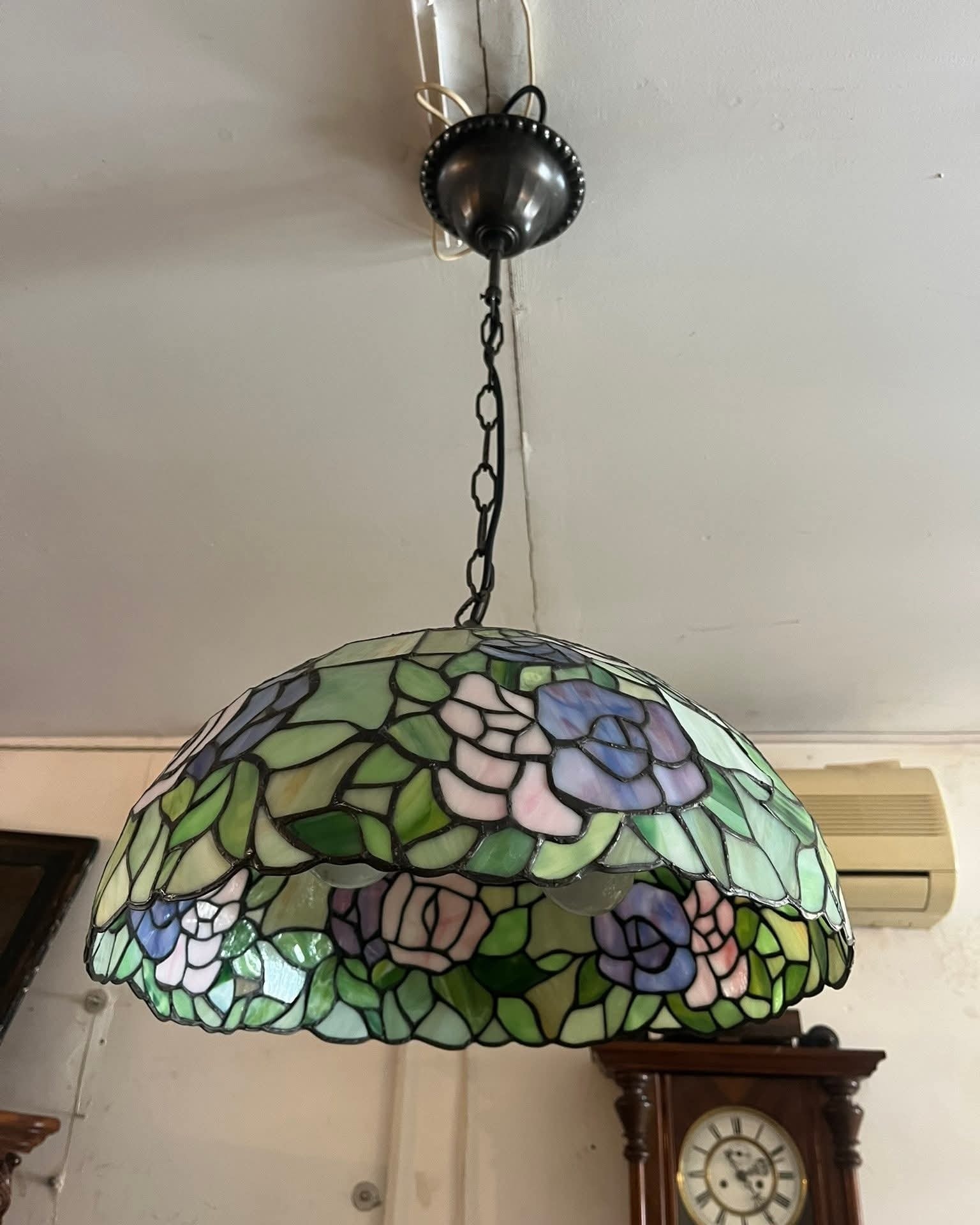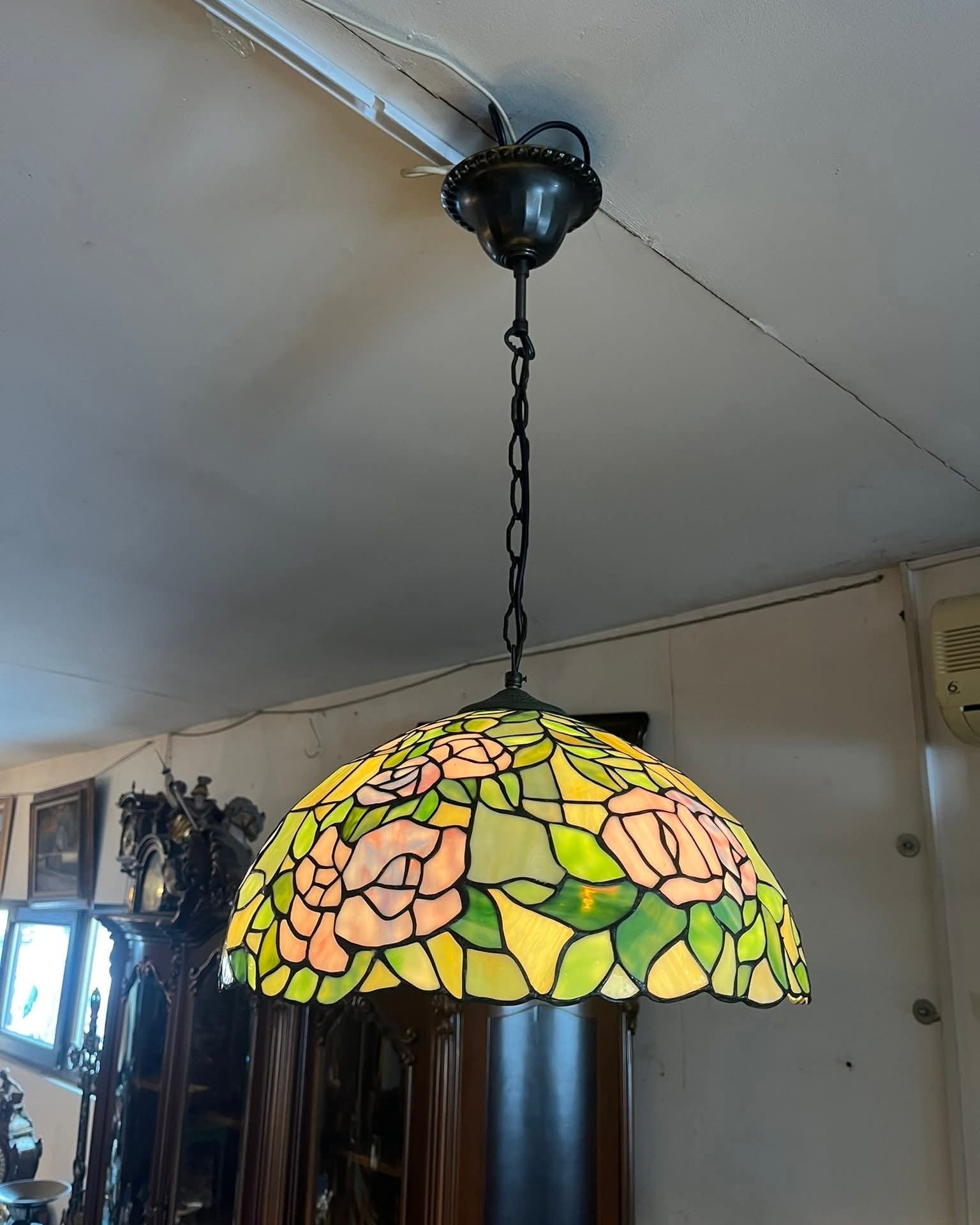Lampă suspendată spectaculoasă în stil Tiffany, realizată din vitralii colorate îmbinate manual. Design floral elegant, oferă o lumină plăcută și ambientală.