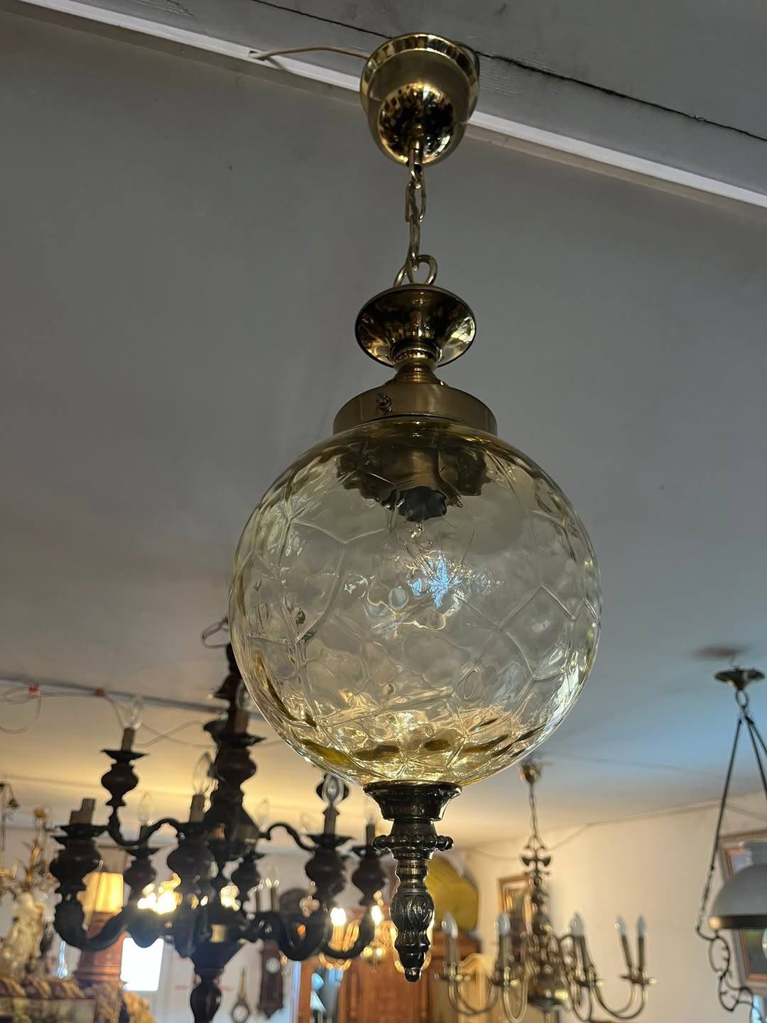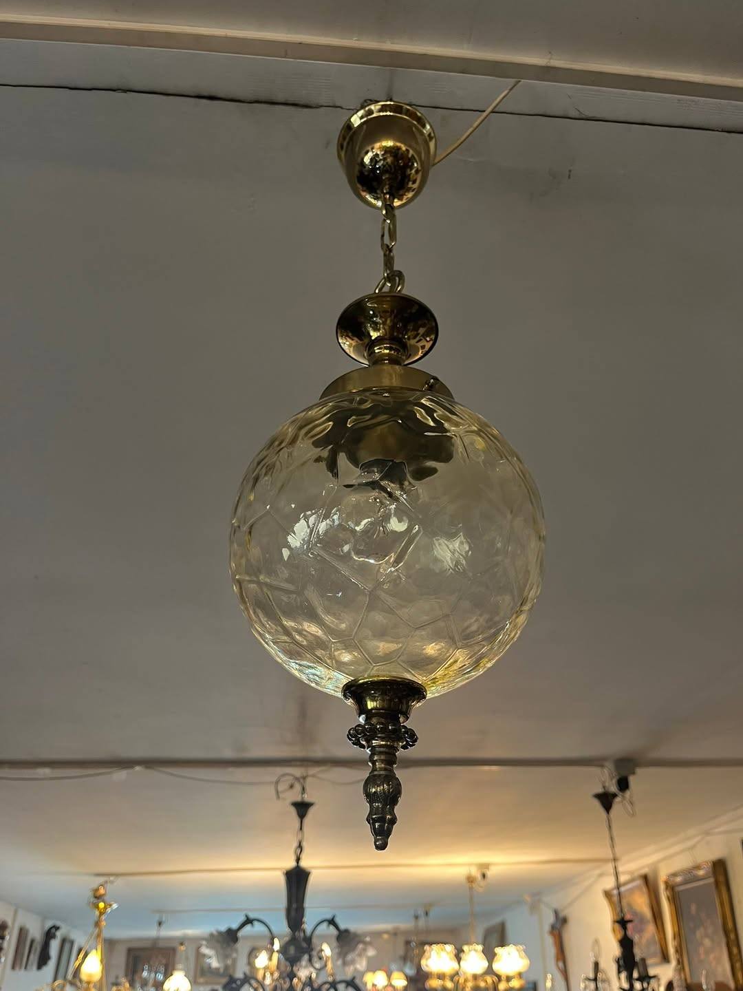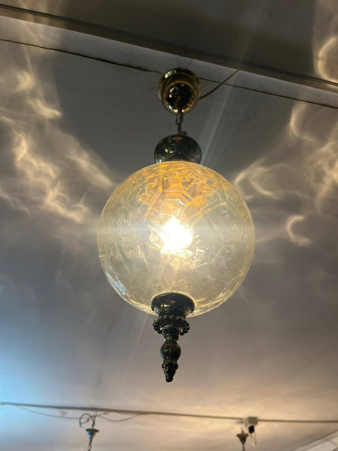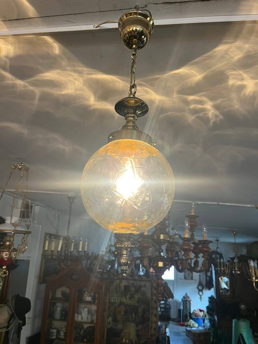 Lampă suspendată vintage – glob din sticlă texturată și elemente din alamă