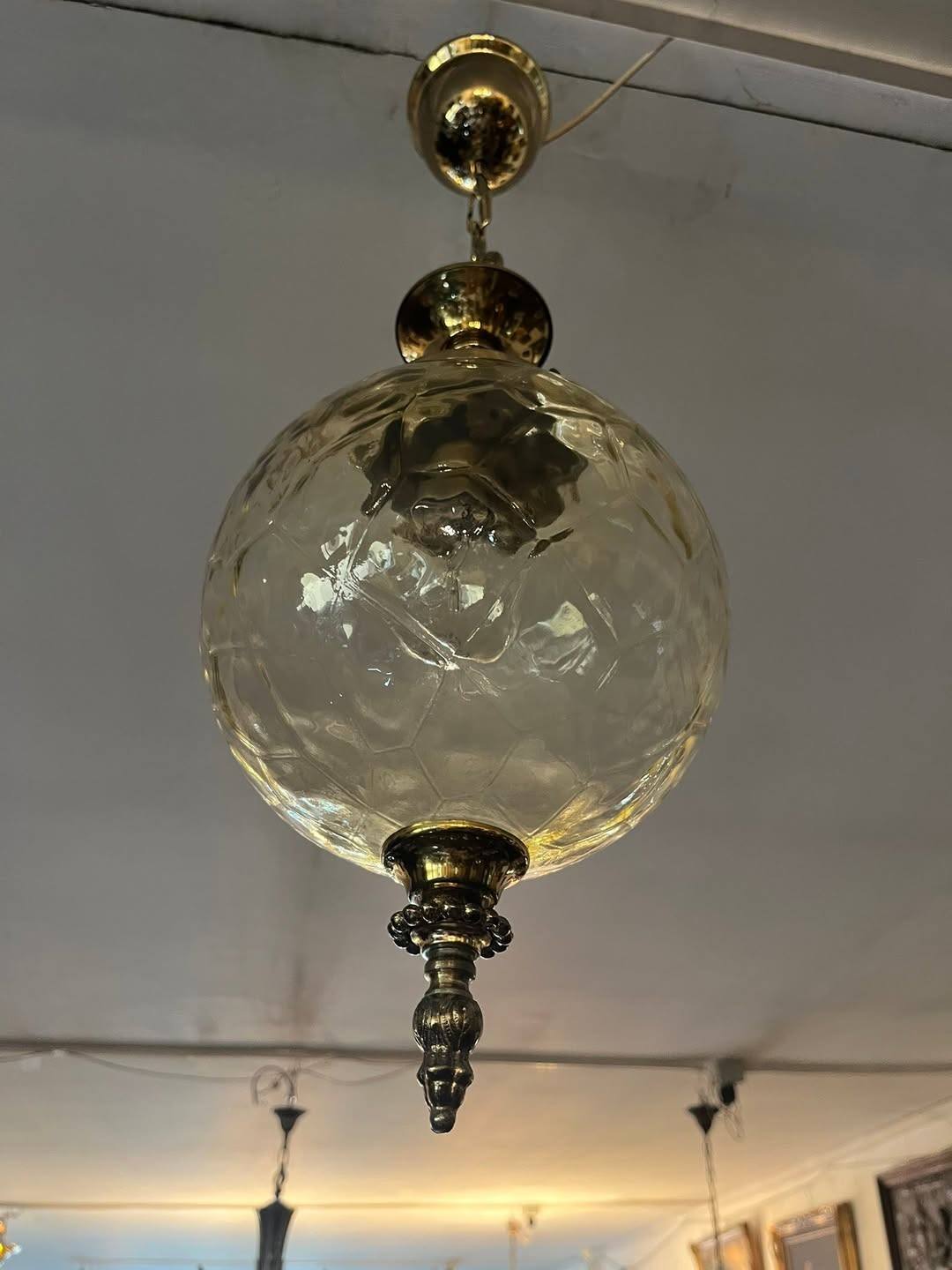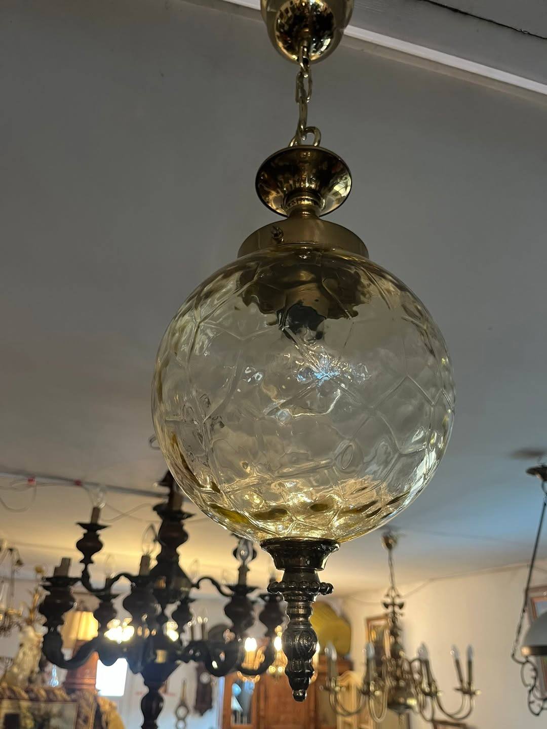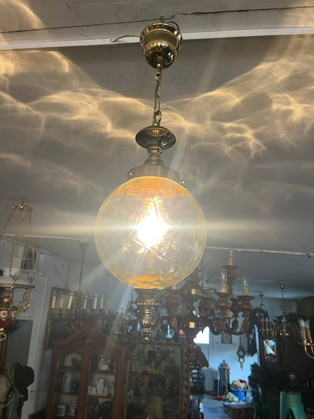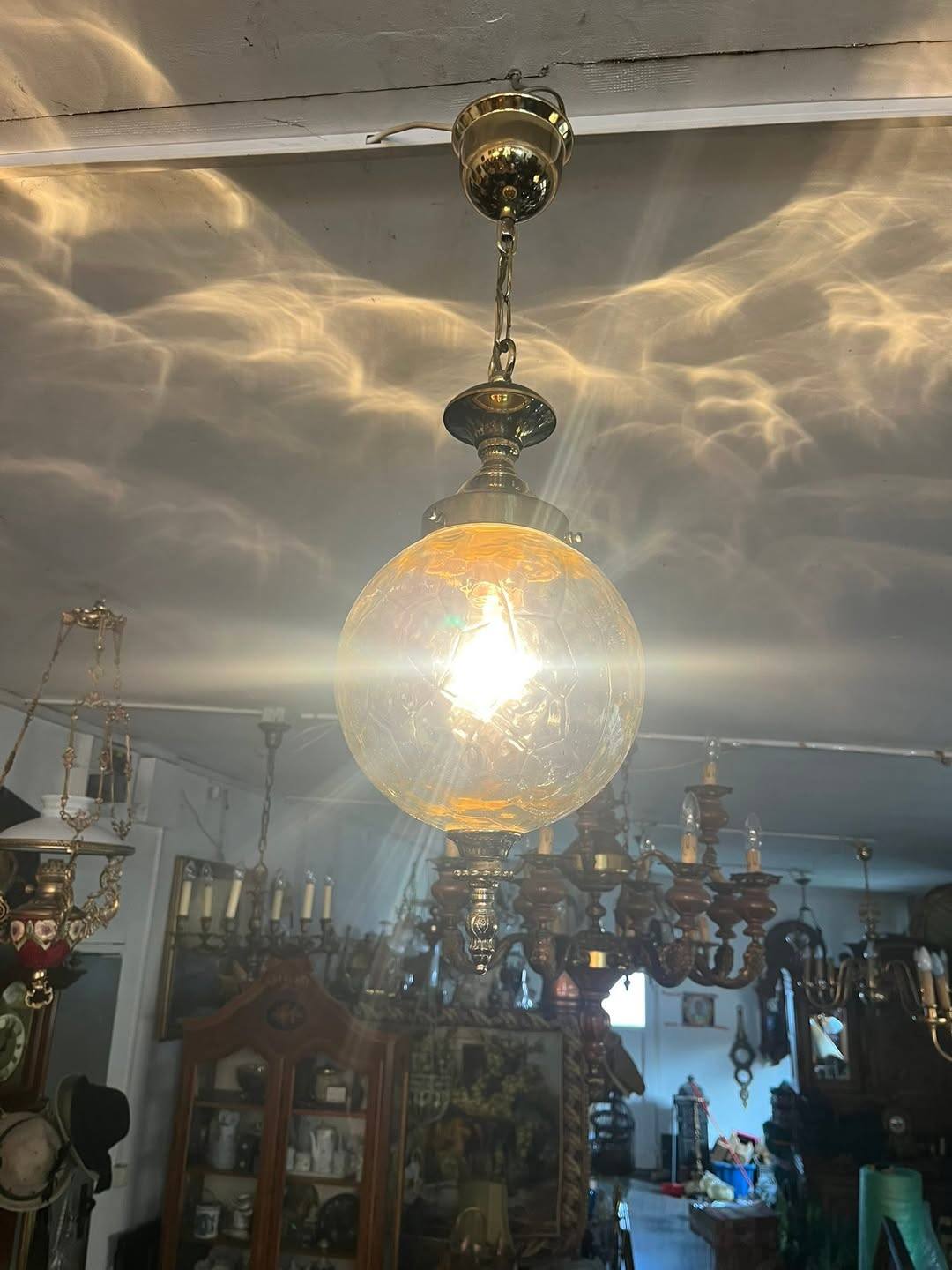 Lampă suspendată vintage – glob din sticlă texturată și elemente din alamă