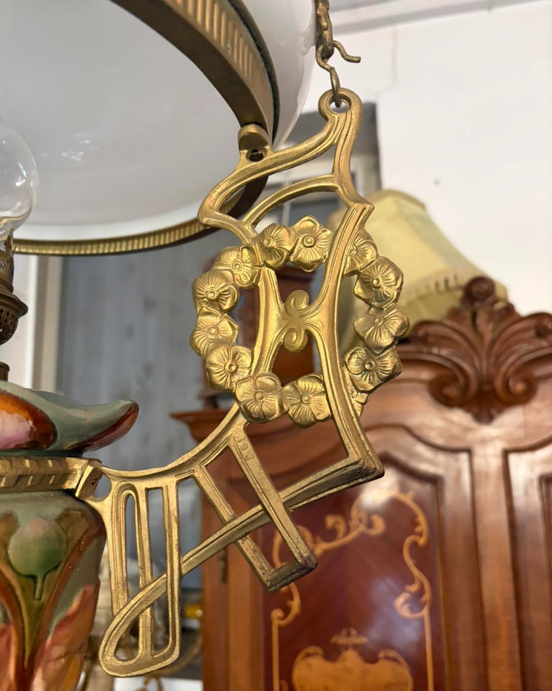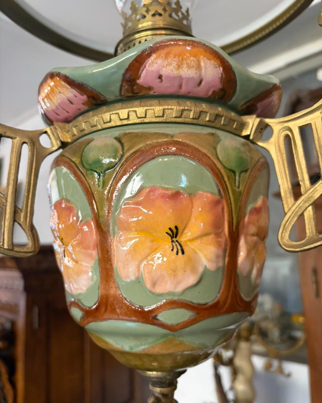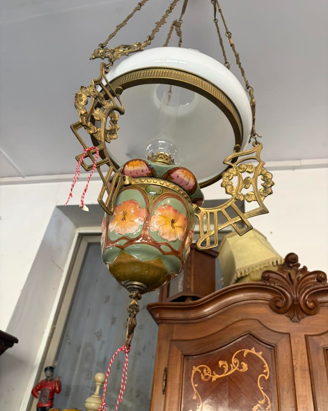 Lampa veche de tavan de inspirație art-nouveau sau Belle Epoque,din ceramică glazurată,sticlă opalină și bronz.