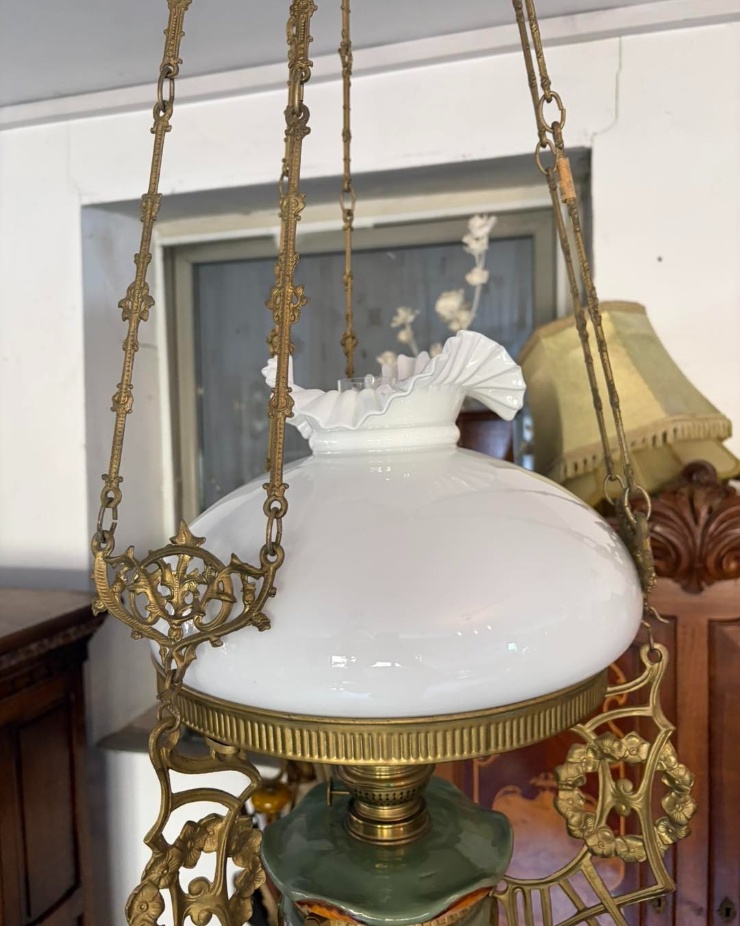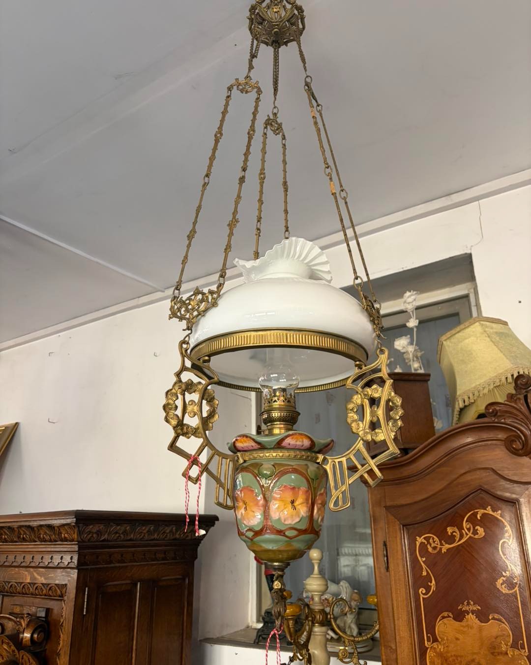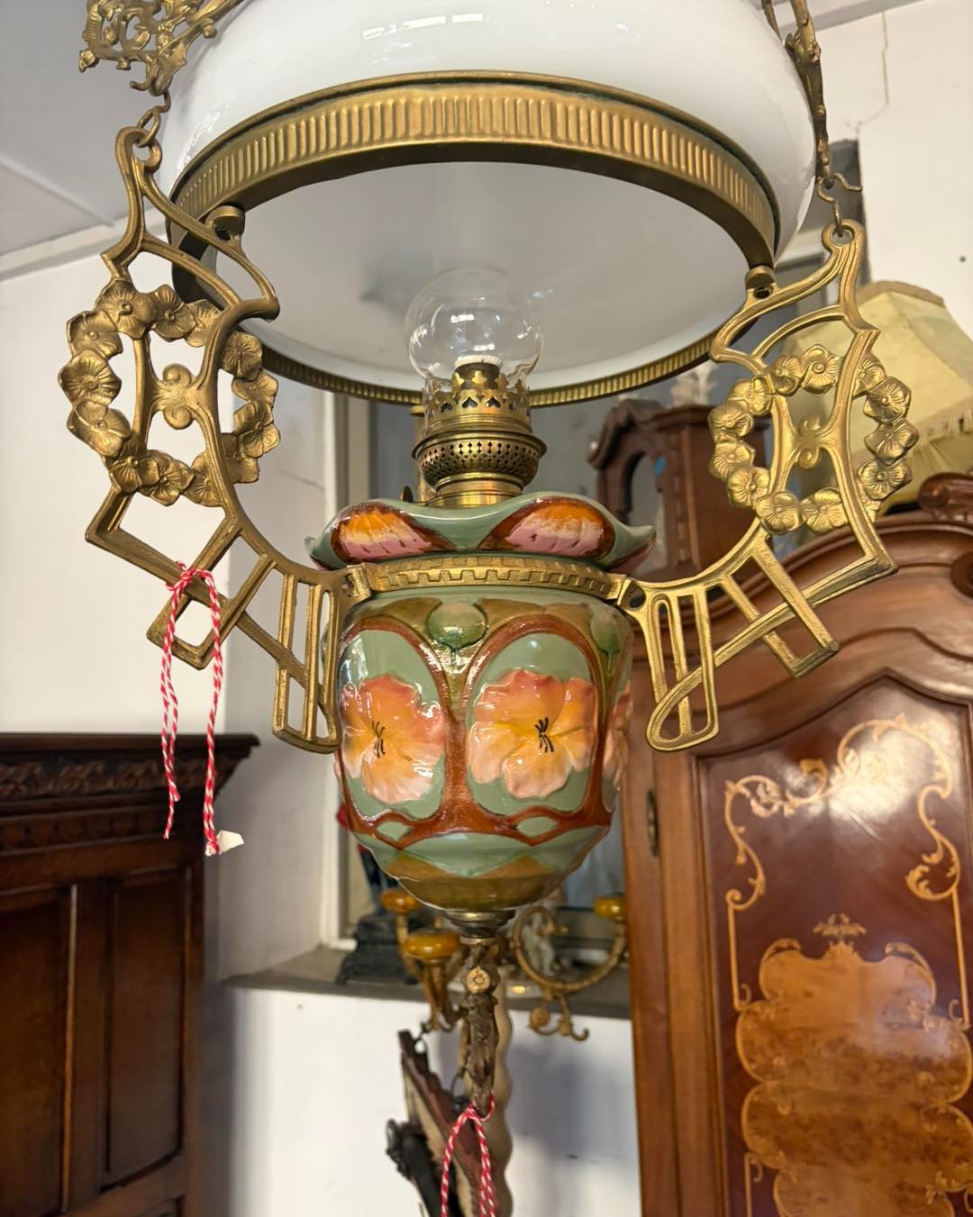 Lampa veche de tavan de inspirație art-nouveau sau Belle Epoque,din ceramică glazurată,sticlă opalină și bronz.